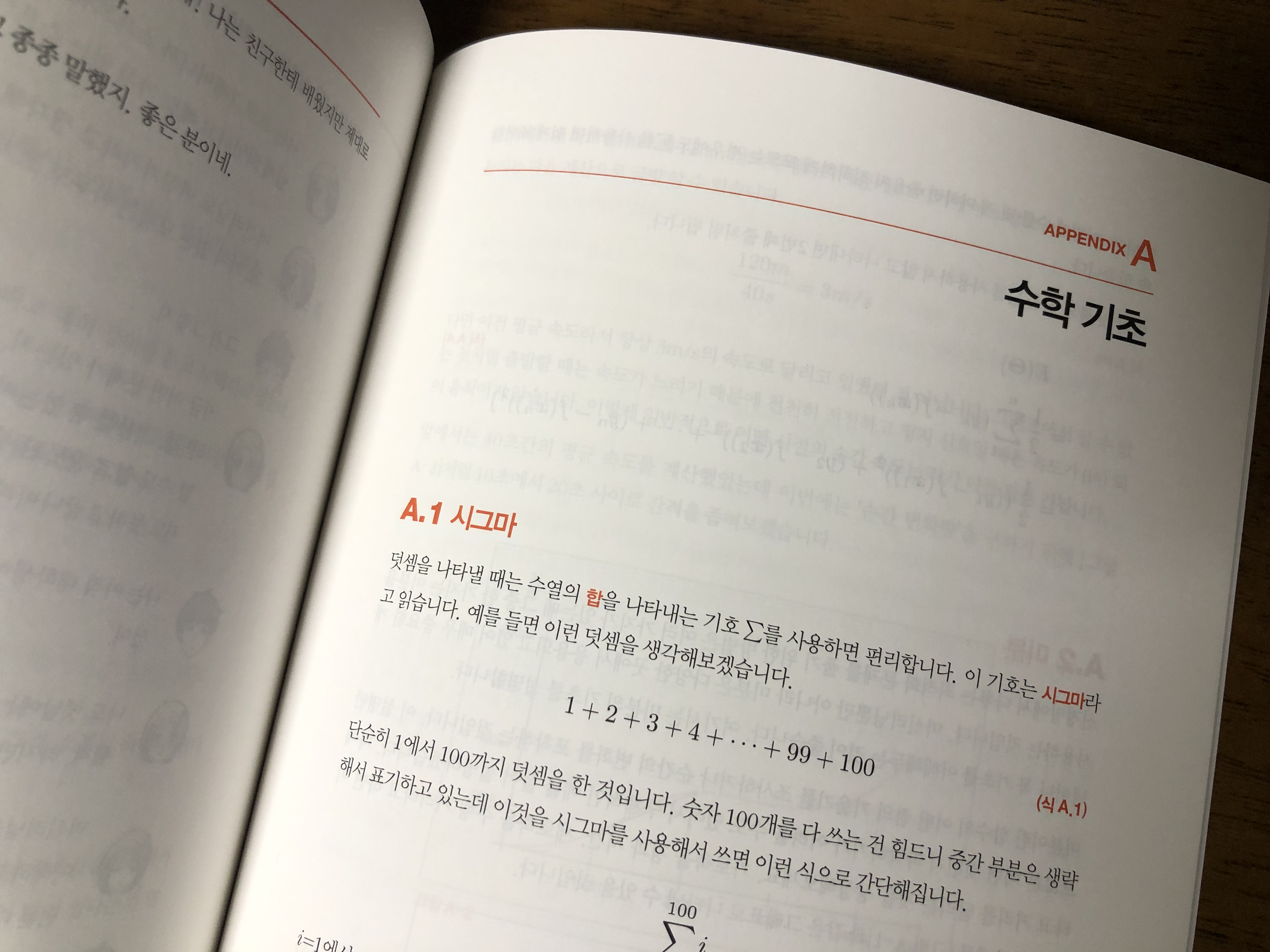 이 책에 나오는 수학공식이 어렵게 느껴진다면 부록에 수록된 수학 기초가 도움이 될 것 같습니다. 시그마, 미분, 편미분, 합성함수, 벡터, 행렬, 지수, 로그 등을 설명합니다. 그리고 파이썬 기초도 부록에 있습니다.