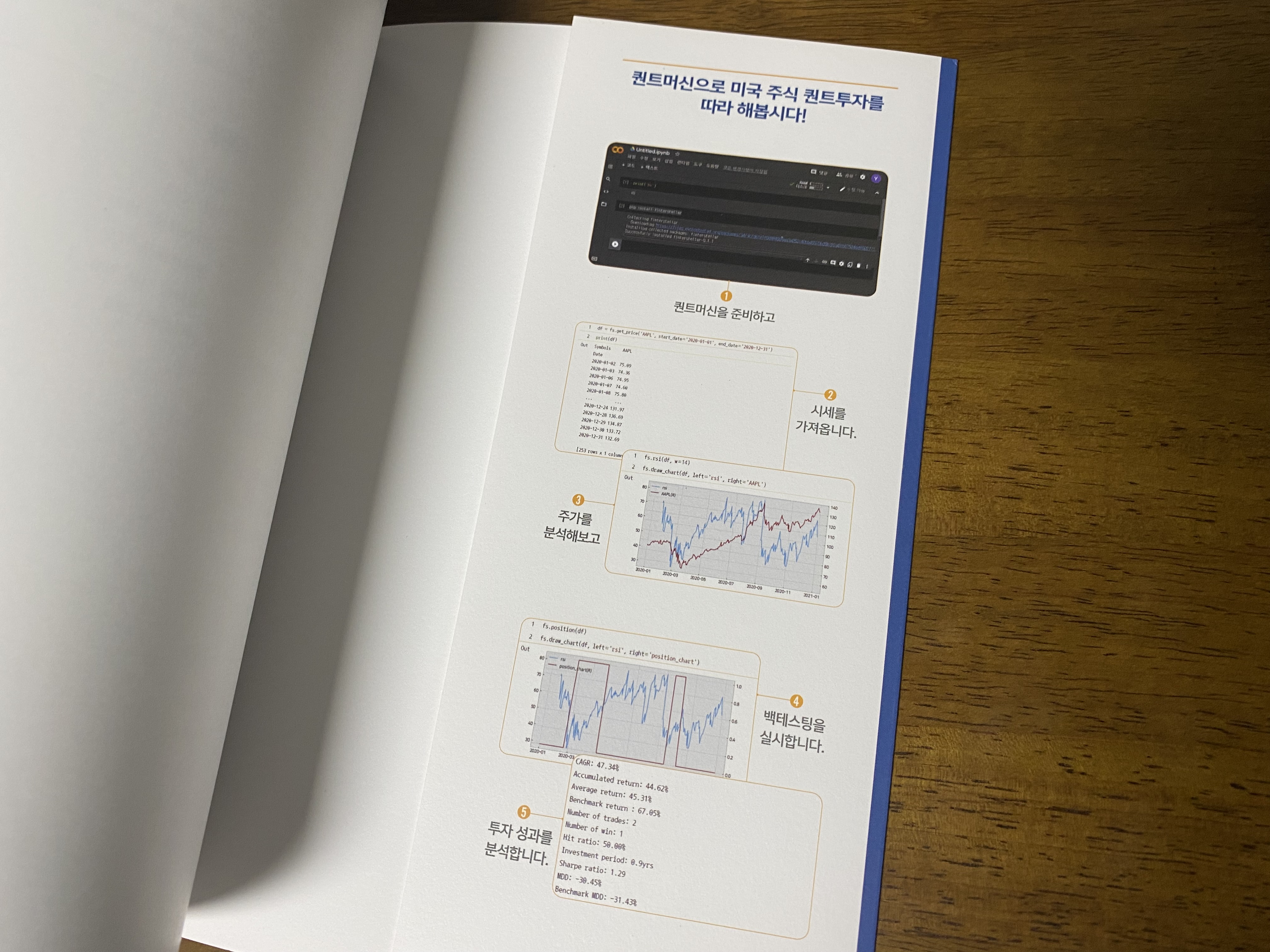 이 책의 구조는 단순합니다. 일단 코랩 사용법을 익힙니다. 그다음 기업의 주가 데이터를 불러와 보조지표와 같은 특정한 기준으로 백테스팅을 실시합니다. 이러한 백테스팅 결과로 투자 성과를 분석하게 됩니다. 코딩이라고 말하기도 뭐한 단순한 루틴이기 때문에 쉽게 따라 할 수 있습니다. 고로 우리는 투자전략(로직)에 집중할 수 있습니다. 투자전략을 조금씩 수정하면서 조금 더 수익률이 높은 방식을 찾아나가는 것입니다. 여기에 흥미를 느낀다면 퀀트 투자에 소질이 있다고 봐야겠네요.