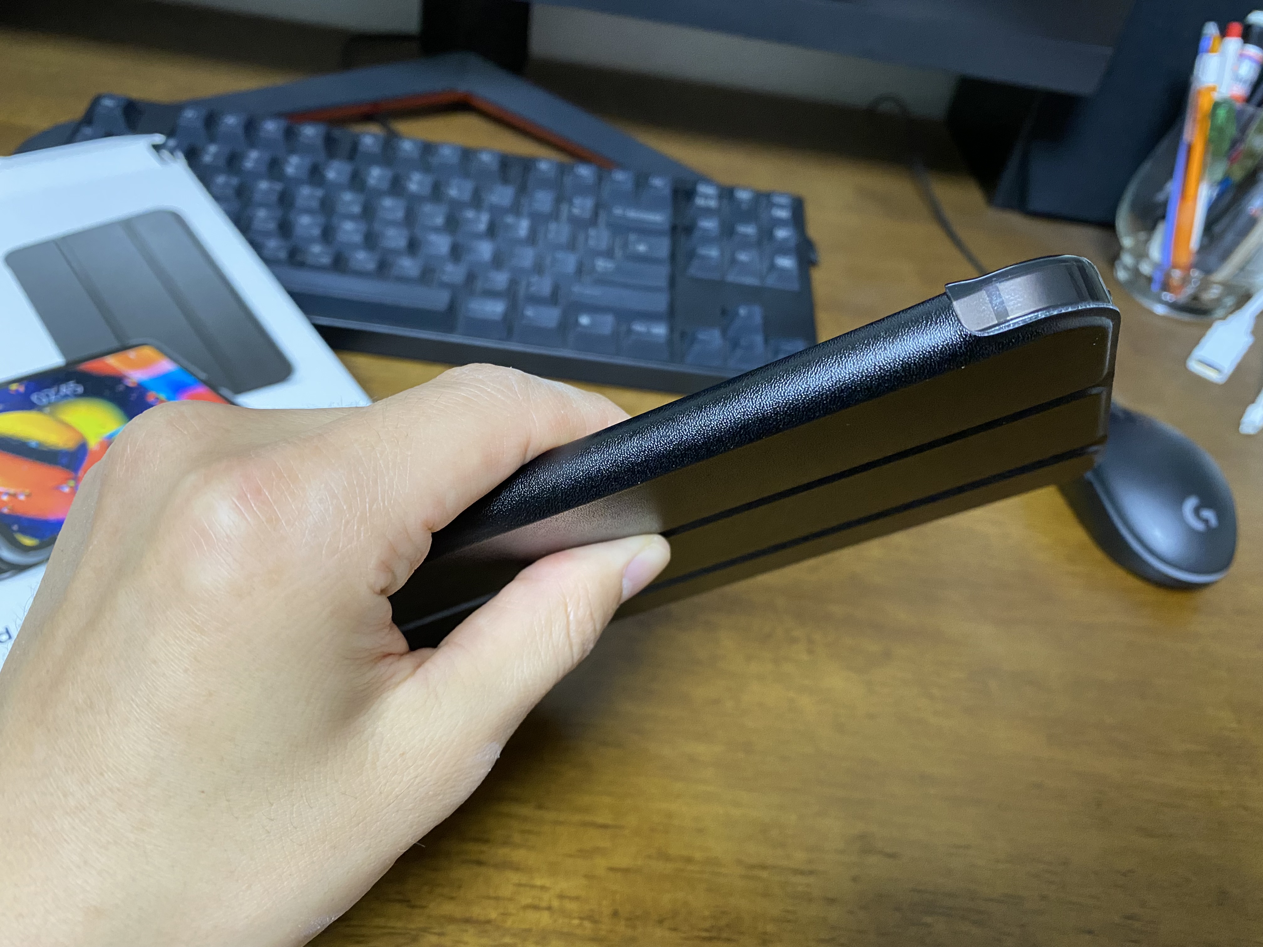 뒷면이 플라스틱이라 그런지 (애플 정품 케이스와는 달리) 덮개를 뒤로 접었을 때 약간 뜨는 것을 확인할 수 있습니다. 덮개를 살짝 밑으로 기울이면 그래도 붙긴 붙습니다. 이 정도는 큰 문제가 되지 않습니다.