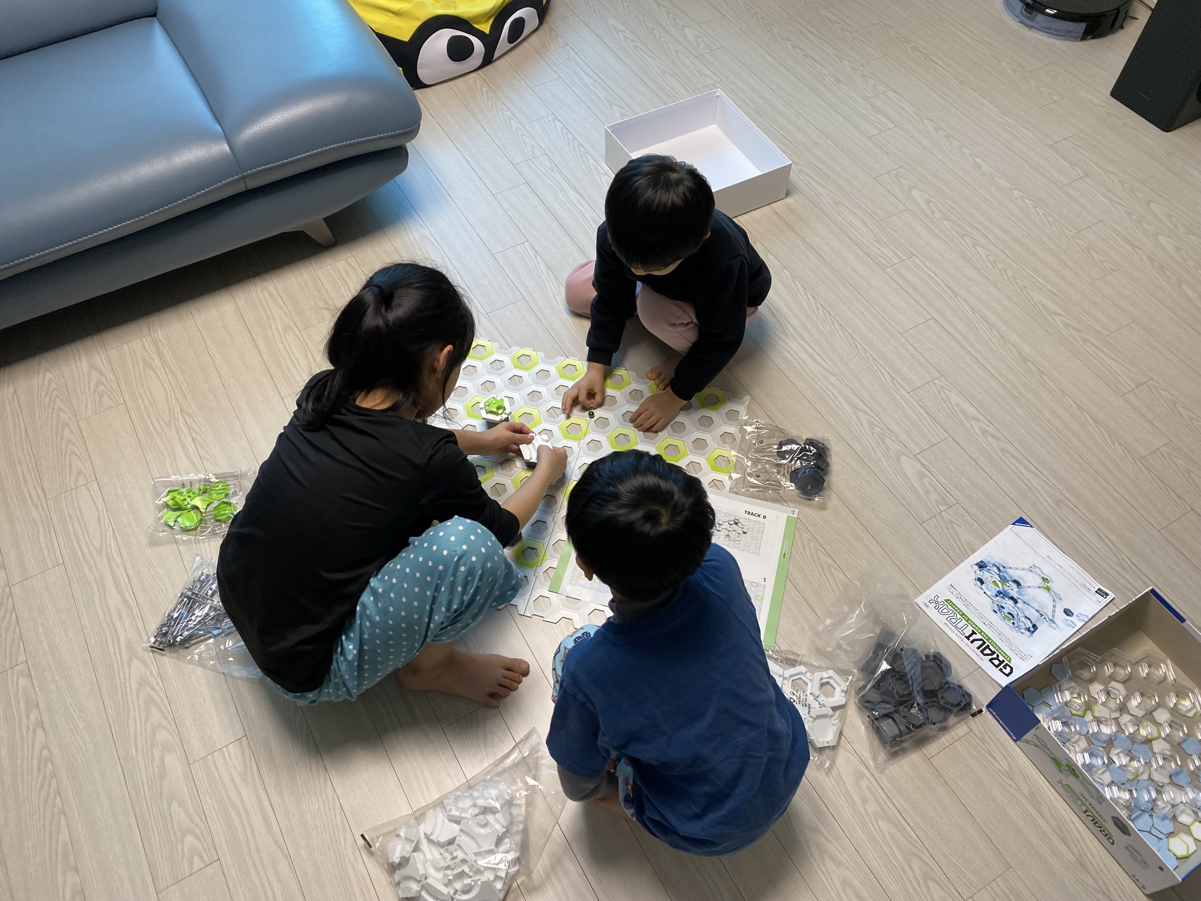 그래비트랙스를 개봉하지 마자 3명이 달라붙어 트랙을 조립하기 시작합니다.