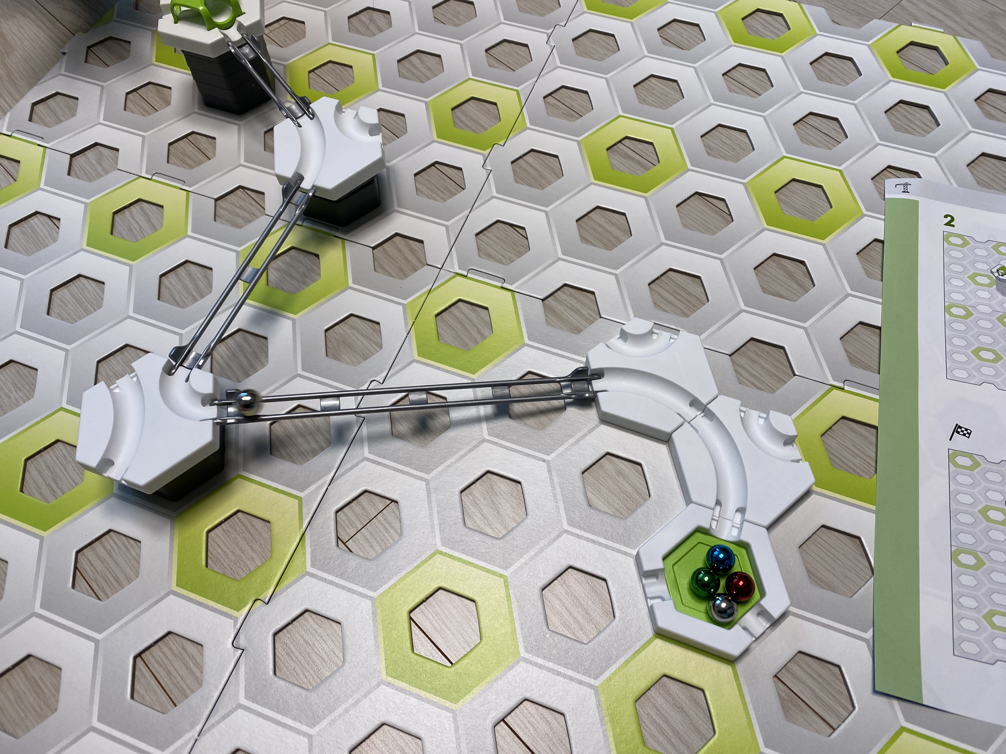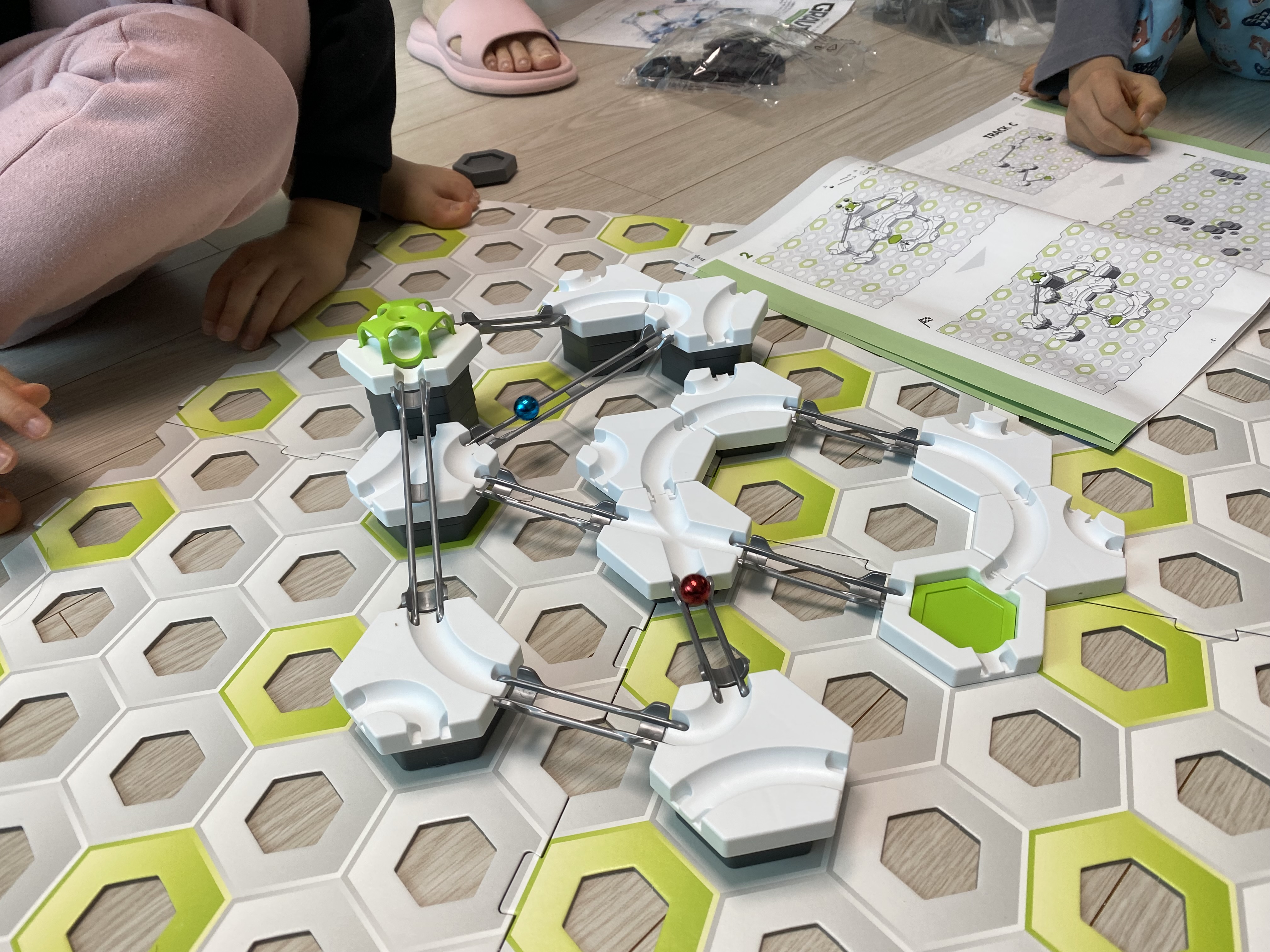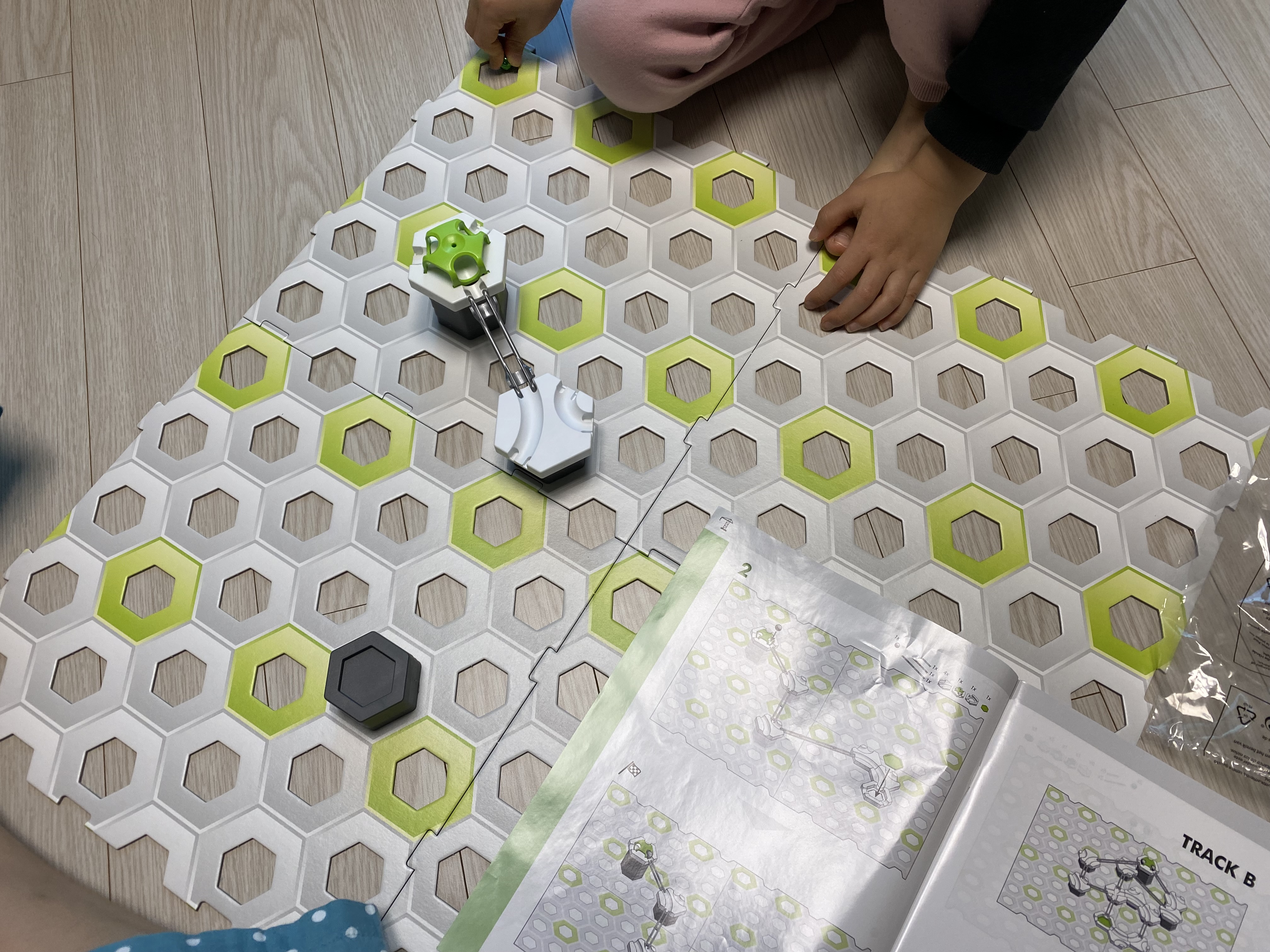 어느새 간단한 트랙을 완성합니다. 적응을 했는지 설명서 뒤에 있는 조금 어려운 트랙 2~3개 빼고 다 조립을 해버리네요. 부모로서 조금 더 오래 잘 갖고 놀길 바랄 뿐입니다. 보통 이런 제품을 구매할 때 부모들은 중력, 원심력 같은 과학 공부에 도움이 되리라 생각하지만 이것이 생각처럼 쉽지 않다는 것을 곧 깨닫게 됩니다. 아이들의 한 장난감에 대한 호기심은 그리 오래 지속되지 않습니다. 저는 길면 1주일 봅니다.