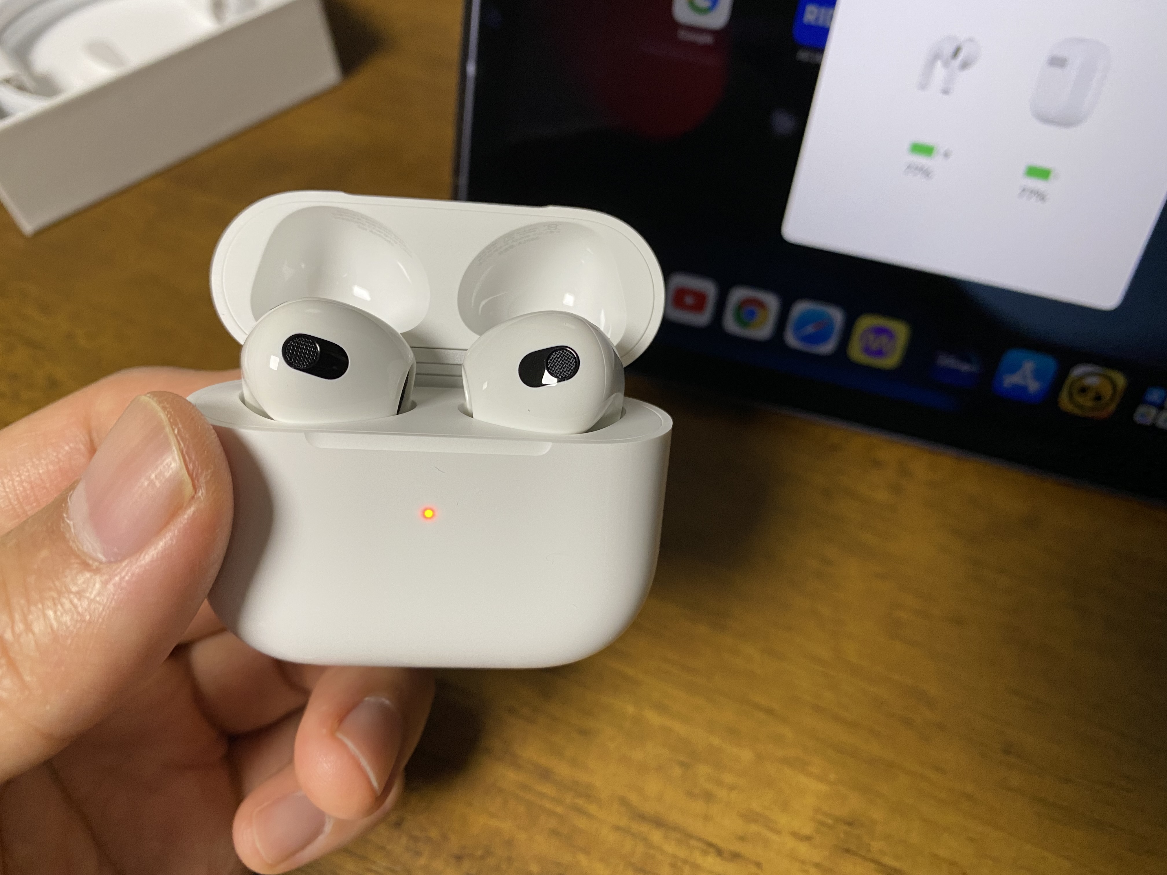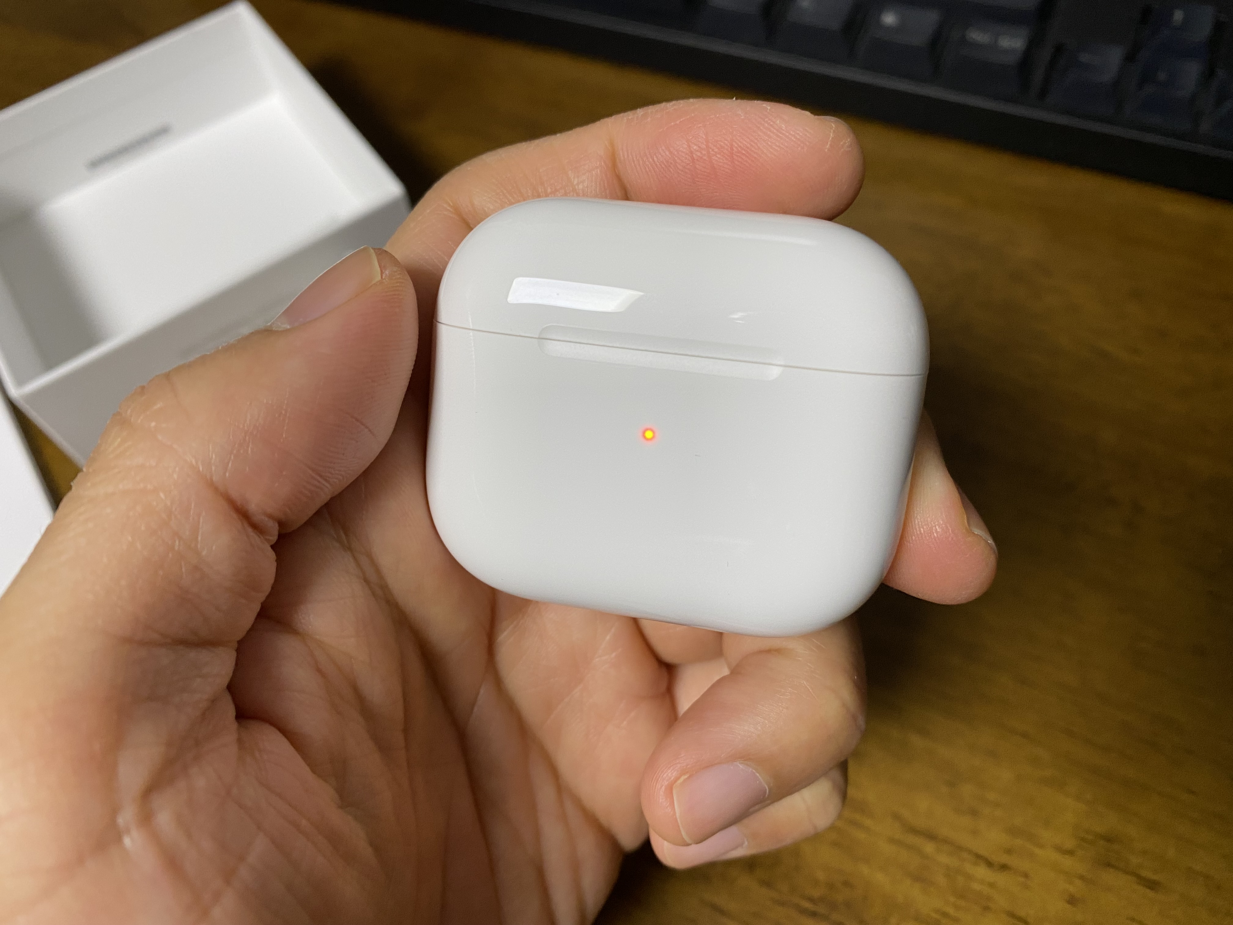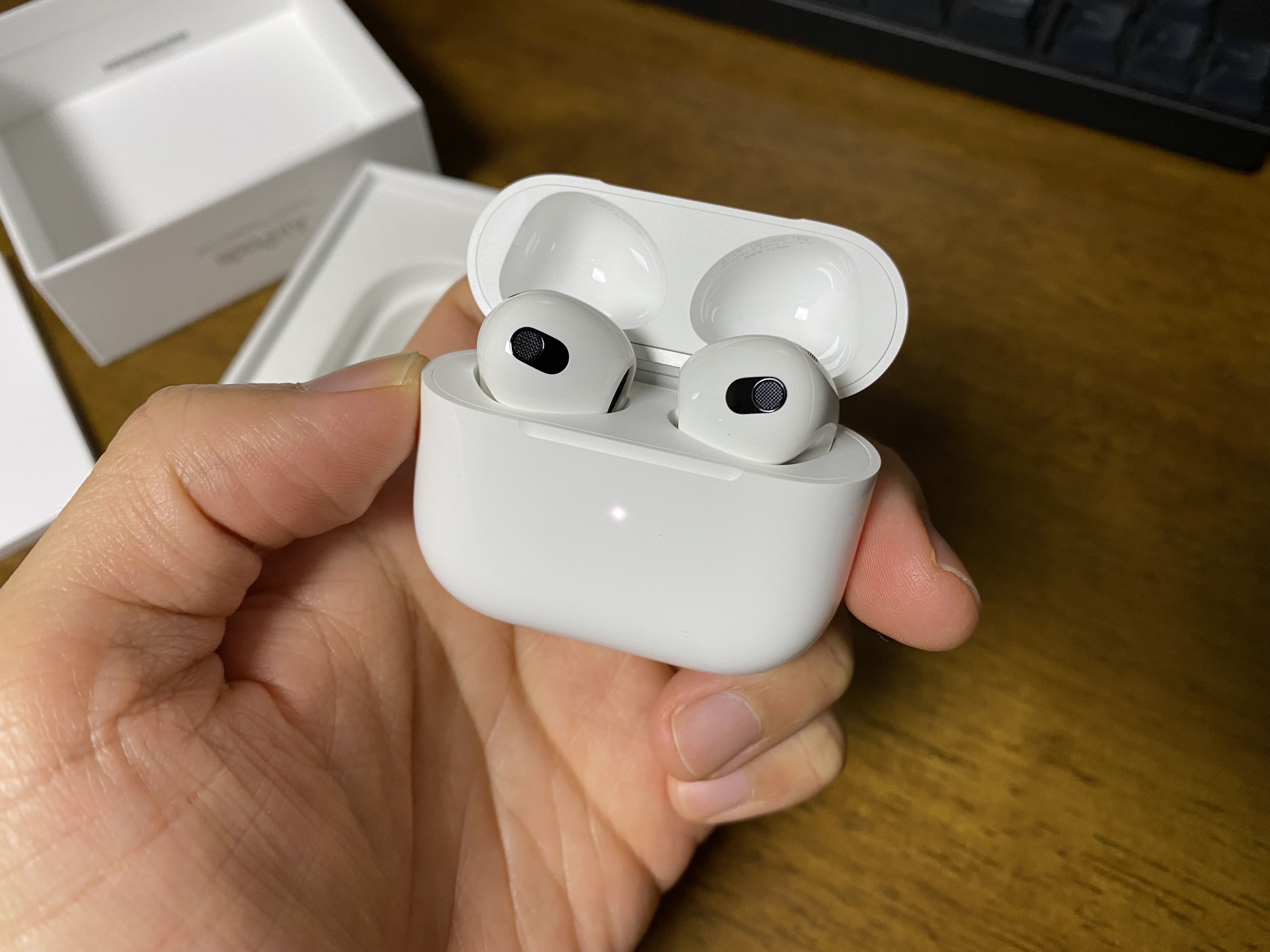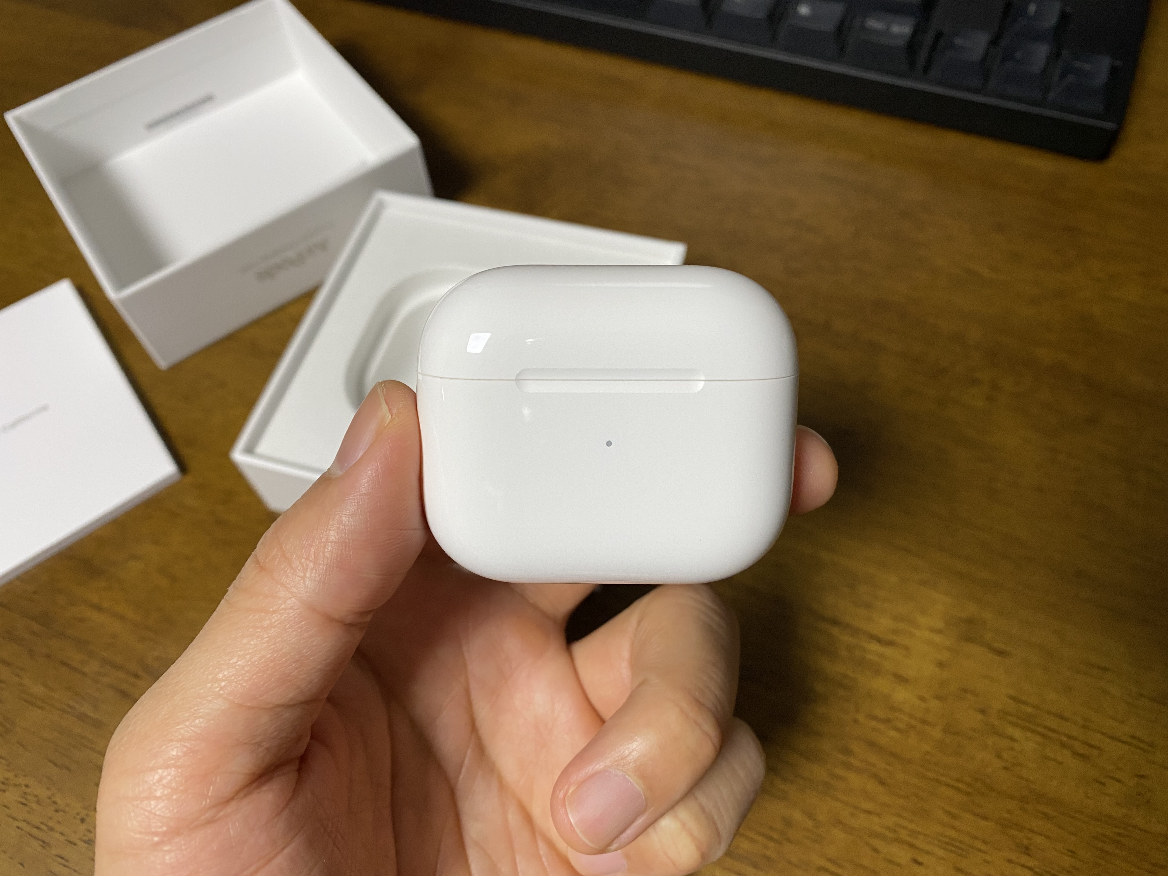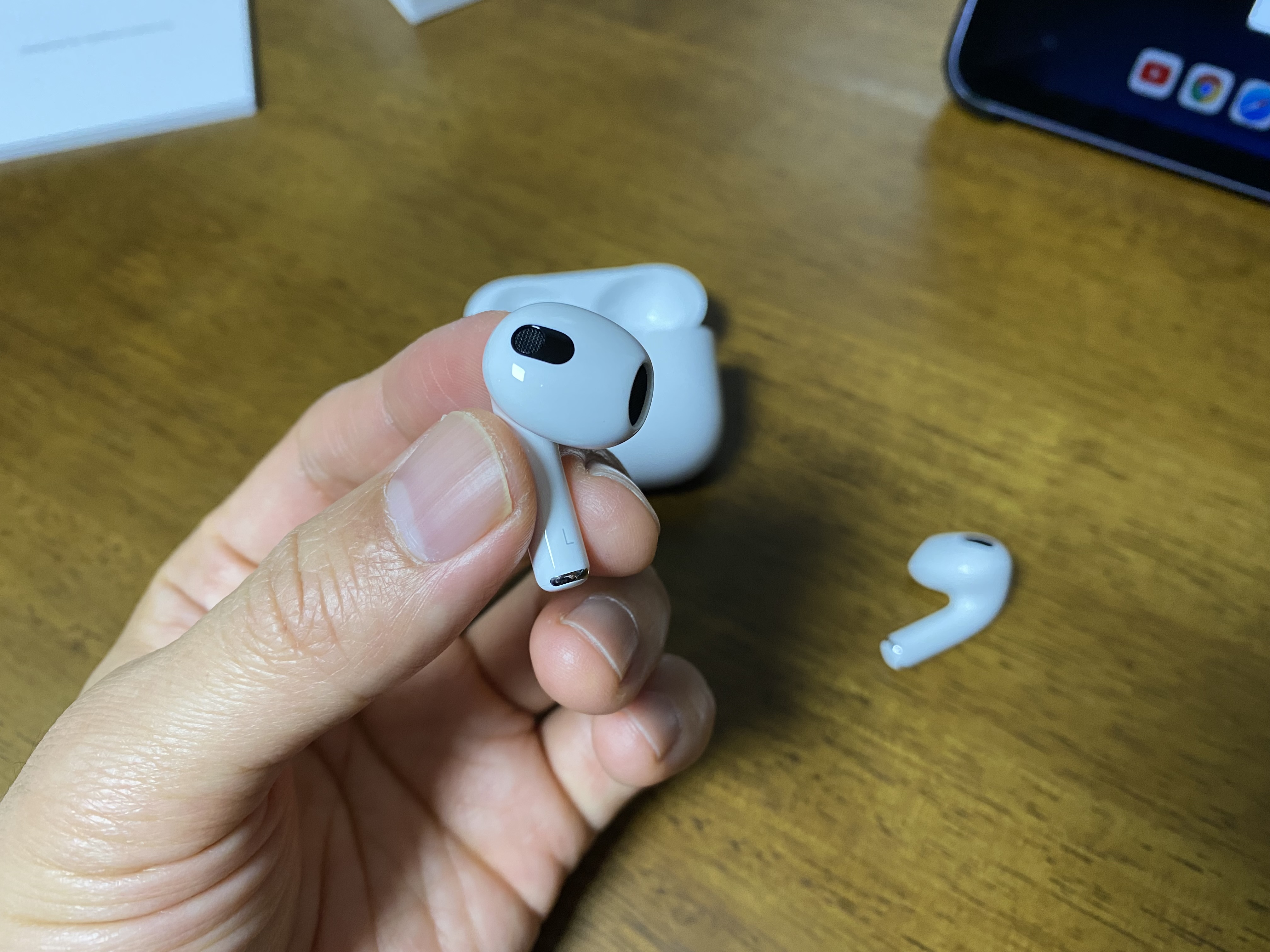 이것이 바로 애플 에어팟 3세대입니다. 앞부분에 작은 LED가 보입니다.
