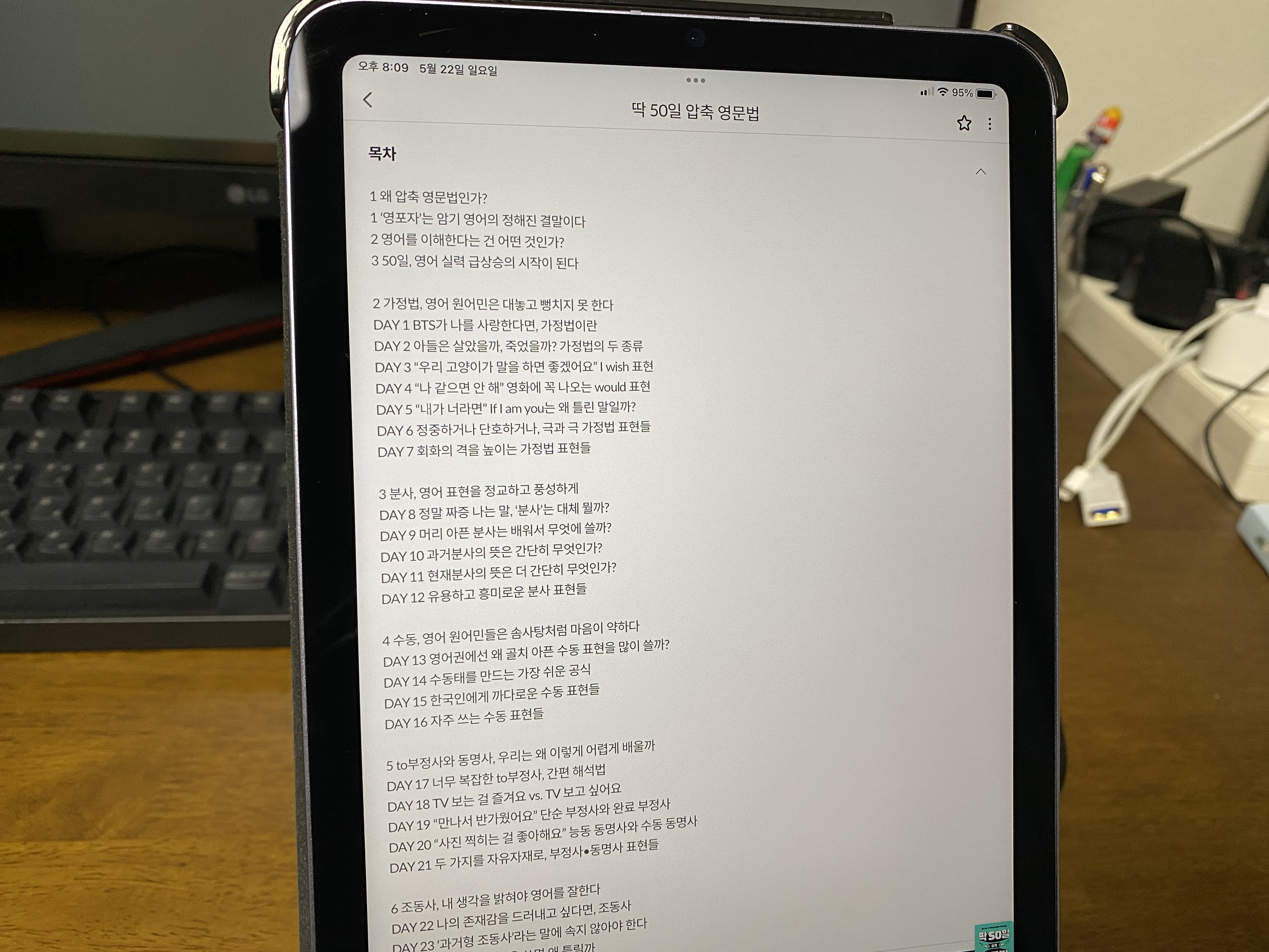 떨어진 영어 감각을 끌어올리기 위해 이런저런 영어문법책을 읽었습니다. 저의 목표는 회화는 아니고 그냥 우리나라 책 읽는 속도로 영어 책이나 기사를 읽고 싶다는 것입니다. 가끔 별로 유명한 책도 아닌데 감흥을 불러오는 그런 책이 있습니다. 저에게 '딱 50일 압축 영문법' 이 책이 그랬습니다. 어렸을 때 영어 문법을 공부하면서 선생님도 알려주지 않았던 불편했던 부분을 이 책이 잘 설명해 주었습니다. 내용도 그리 부담스럽지 않습니다.