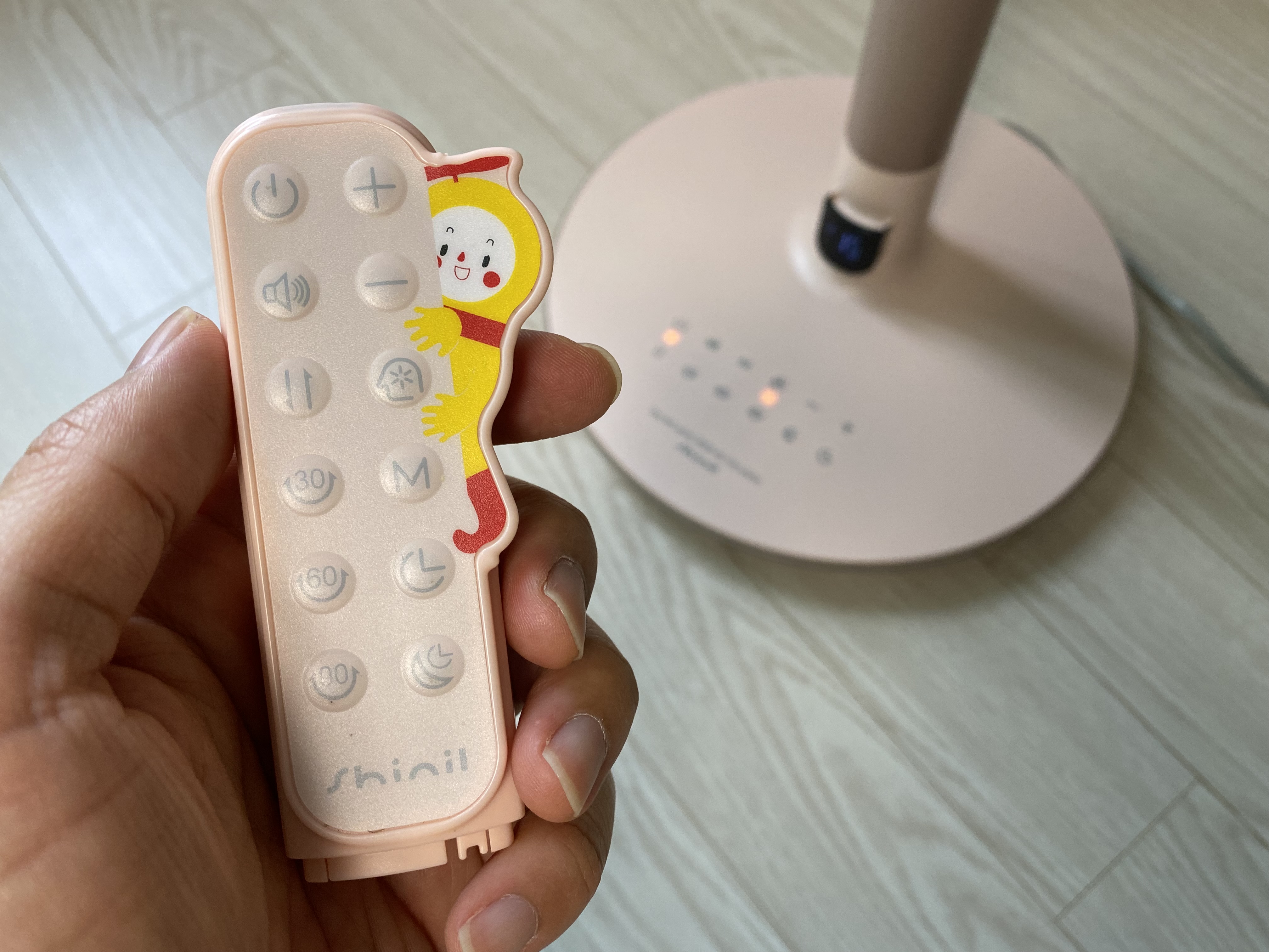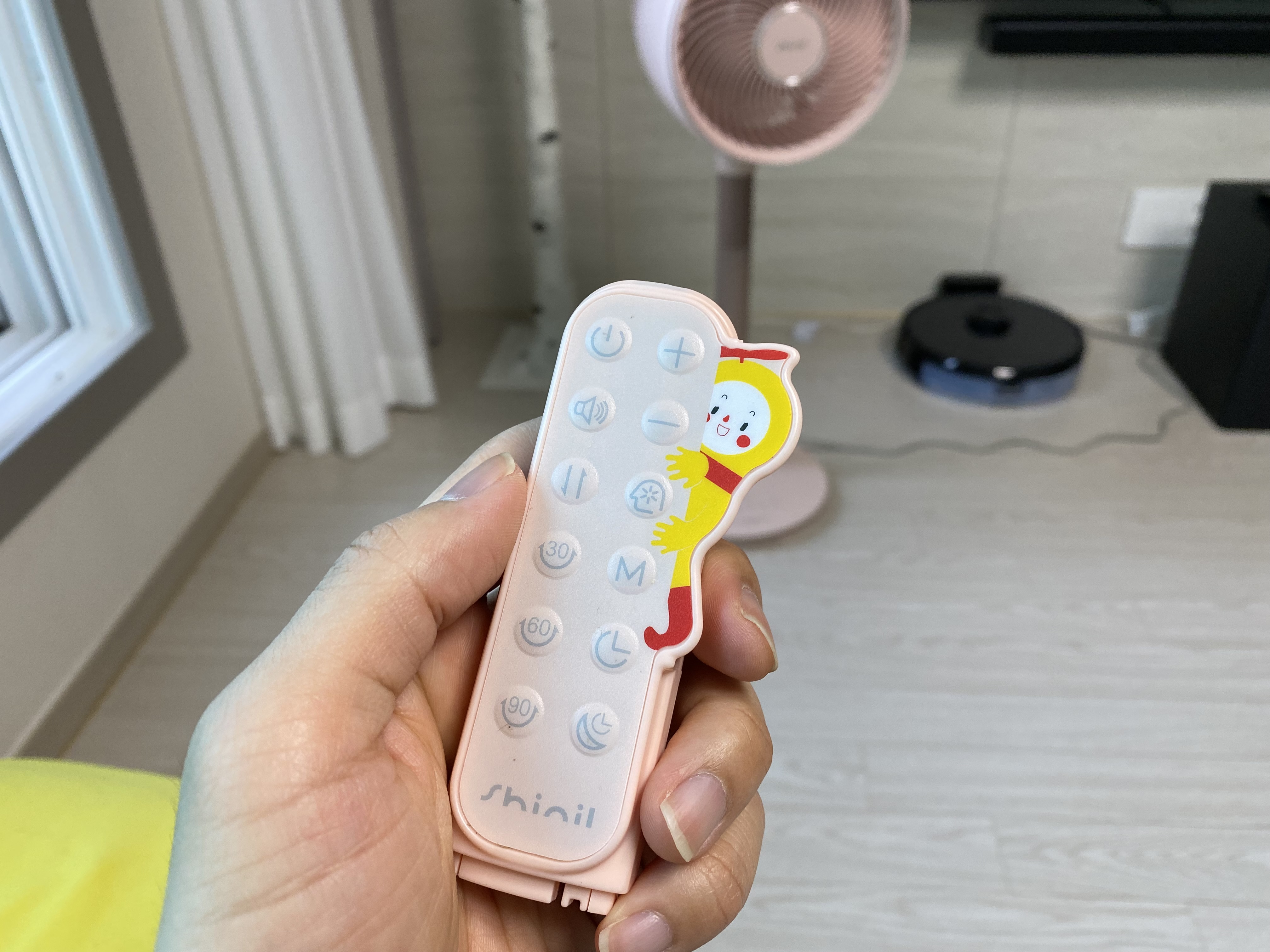 리모컨이 무지 귀엽게 생겼네요. 선풍기 본체 버튼으로 할 수 있는 일을 이 리모컨으로도 전부 할 수 있습니다. 배터리가 들어있어서 밑에 있는 화살표 종이를 제거하면 리모컨을 바로 사용할 수 있습니다.