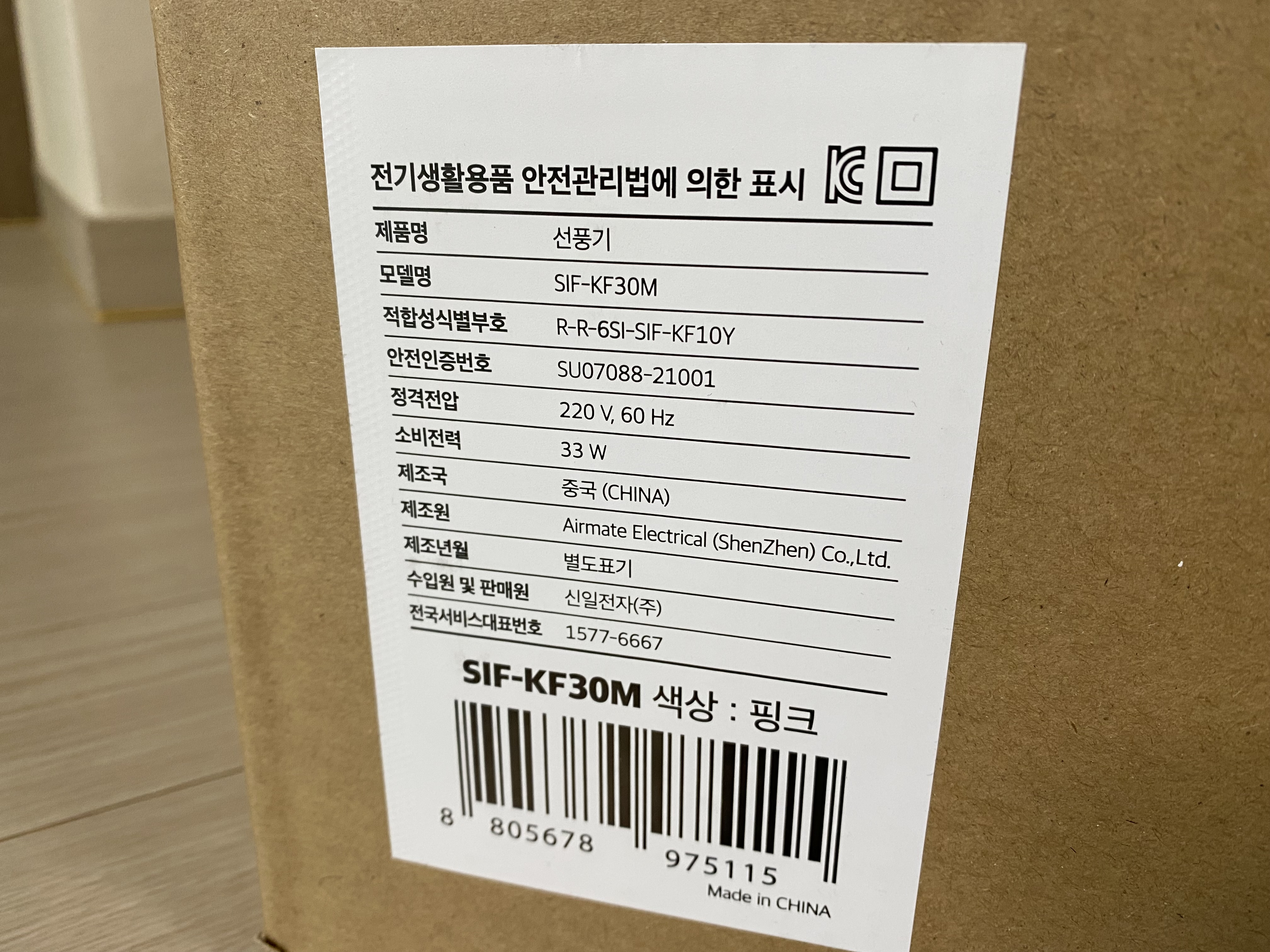 제품명에 선풍기라고 적혀있네요. 역시 선풍기가 공기순환기나 별차이가 없는 제품이라 생각합니다. 굳이 구별을 하자면 선풍기는 바람을 넓게 보내는 반면에 공기순환기(에어서큘레이터)는 좁게 멀리 보내는 제품으로 보면 됩니다. 그래서 공기순환기는 사람 목처럼 3D로 돌면서 집안 곳곳 여기저기 멀리 바람을 보내기 위해 사용합니다. 에어컨과 함께 사용하면 좋지요. 참고로 이 제품의 정확한 모델명은 SIF-KF30M입니다.