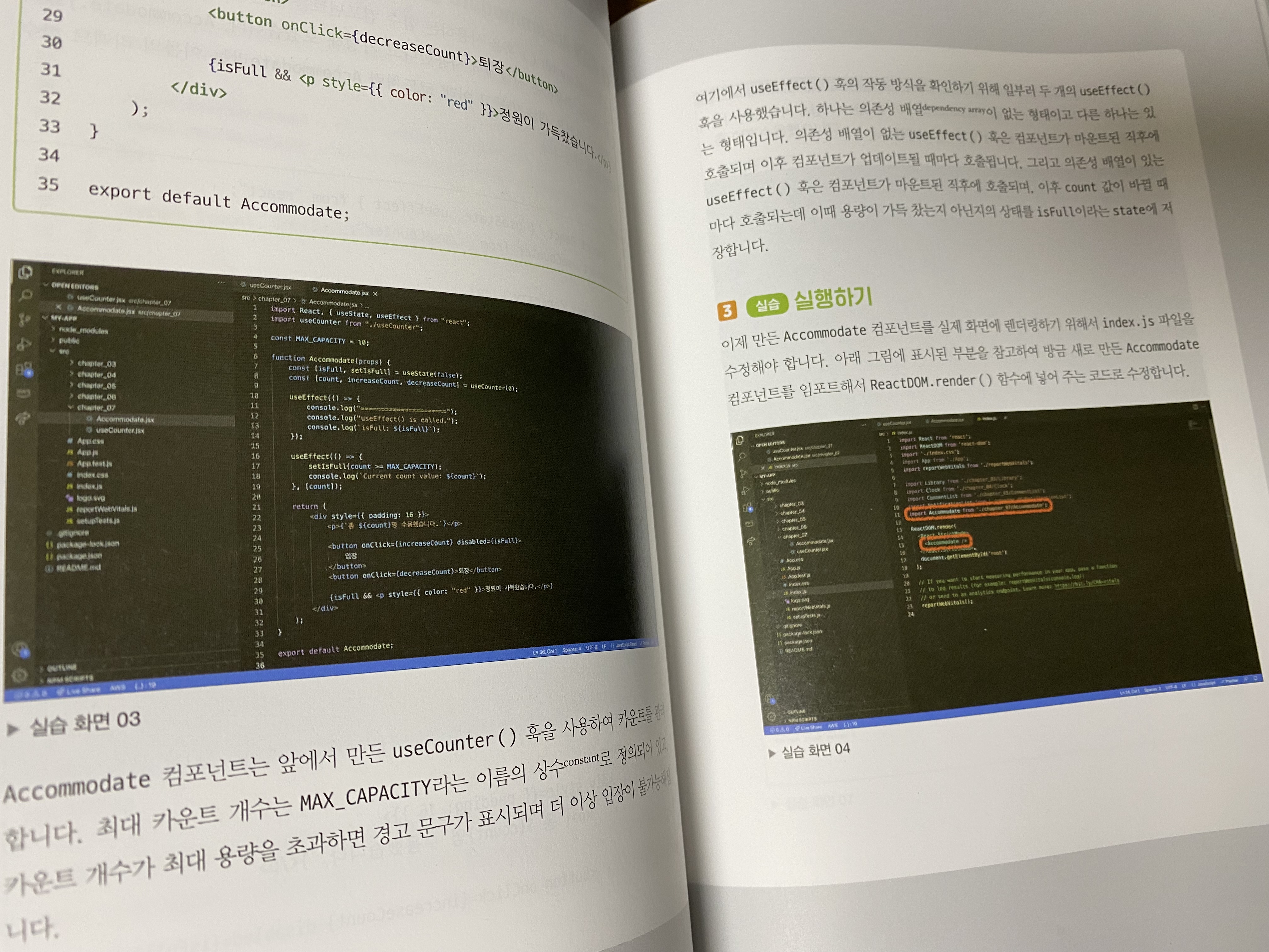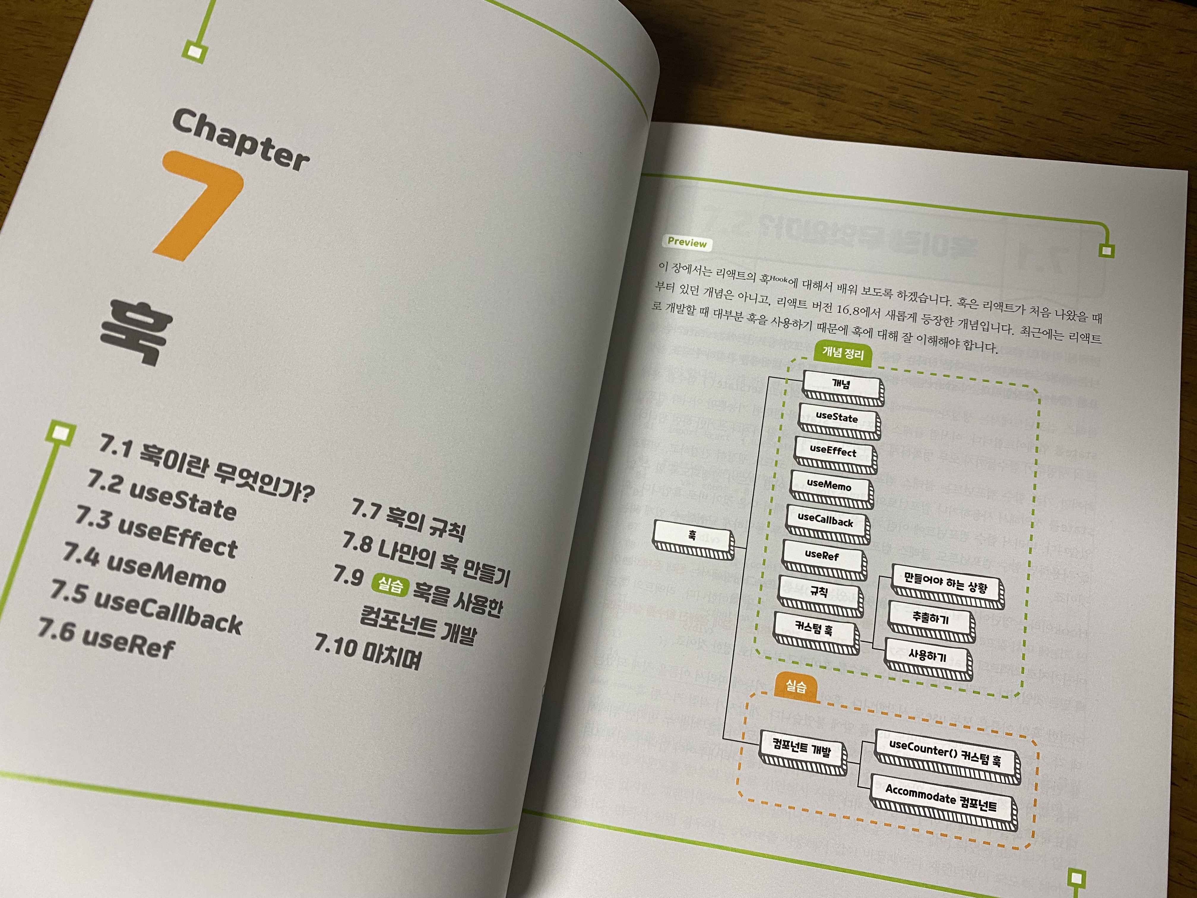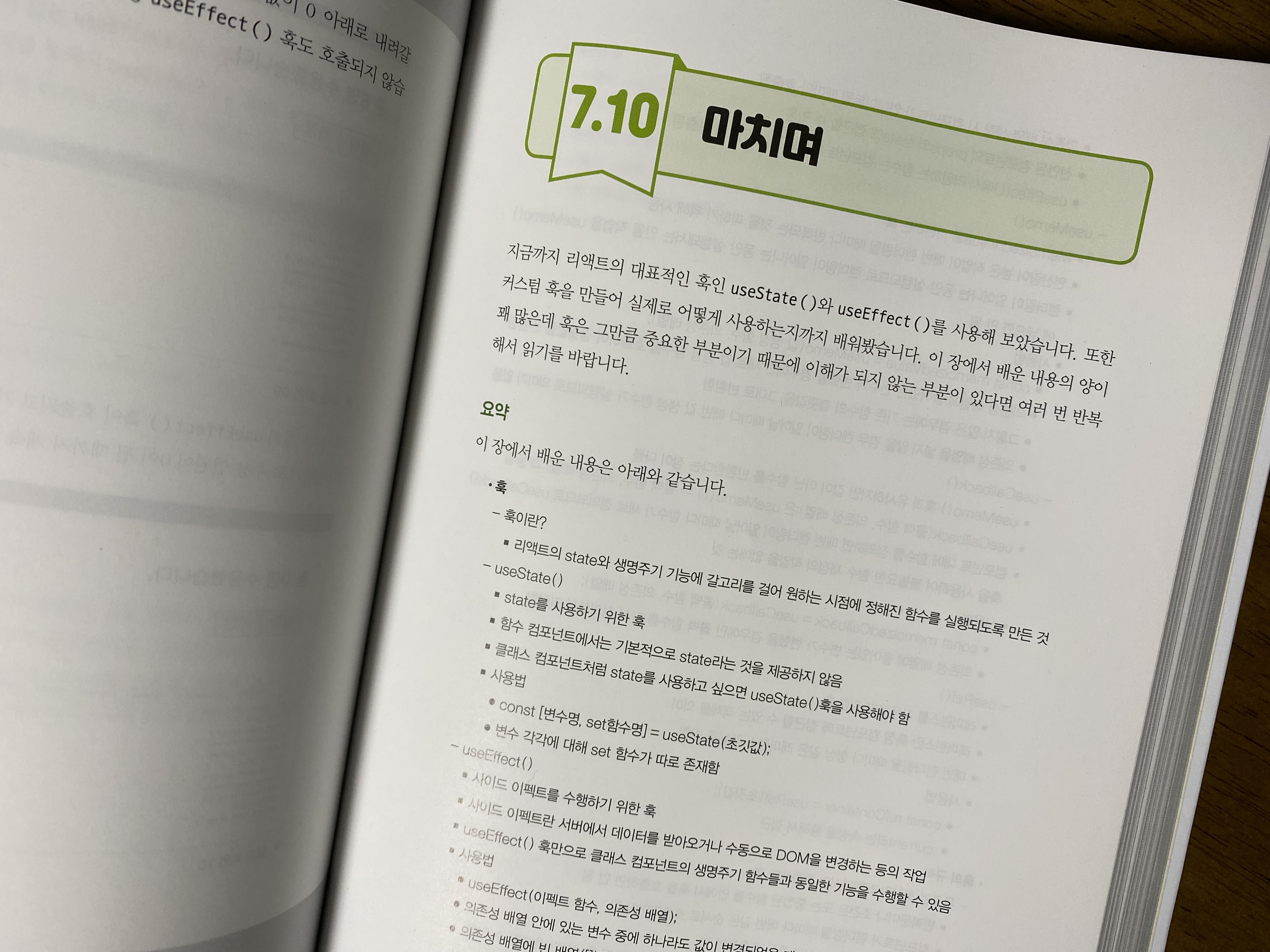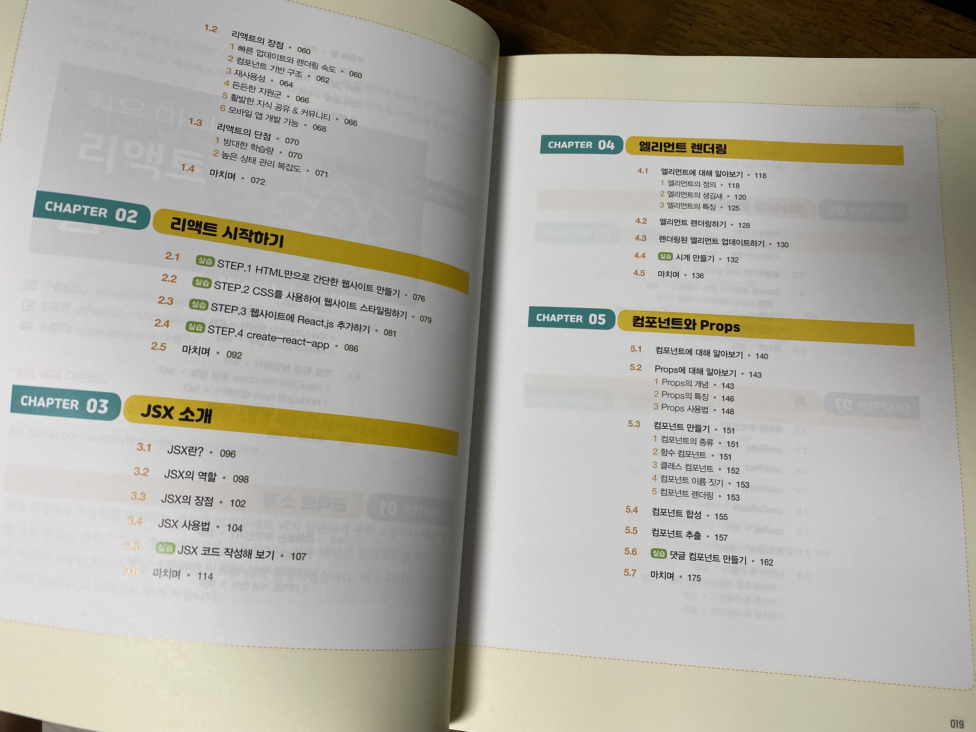 0, 1장에서는 웹개발에 필요한 기초를 설명하고 2장부터 본격적으로 리액트에 입문합니다. 2장 리액트 프로젝트를 생성하는 것에서 시작으로 3장 JSX 부터는 본격적으로 리액트 개발에 필요한 내용을 배웁니다. JSX, 엘리먼트 렌더링, 컴포넌트, Props, State, 생명주기, 이벤트 핸들링, 폼, 합성, 상속, 컨텍스트 등을 설명합니다. 전반적으로 설명이 자세해서 좋았는데 7장 훅에서 한 번에 이해가 안돼서 2번 읽으니 조금 감을 잡을 수 있었습니다. 웹 개발 전문가라면 모르겠지만 자바스크립트를 잘 모르거나 처음 개발을 시작하는 분에게는 리액트는 확실히 쉬운 라이브러리는 아닙니다. 한 번에 다 이해하는 건 쉽지 않을 것 같습니다. 이 책으로 대충 감을 잡고 코드를 짜면서 익숙해지는 과정이 필요해 보입니다.