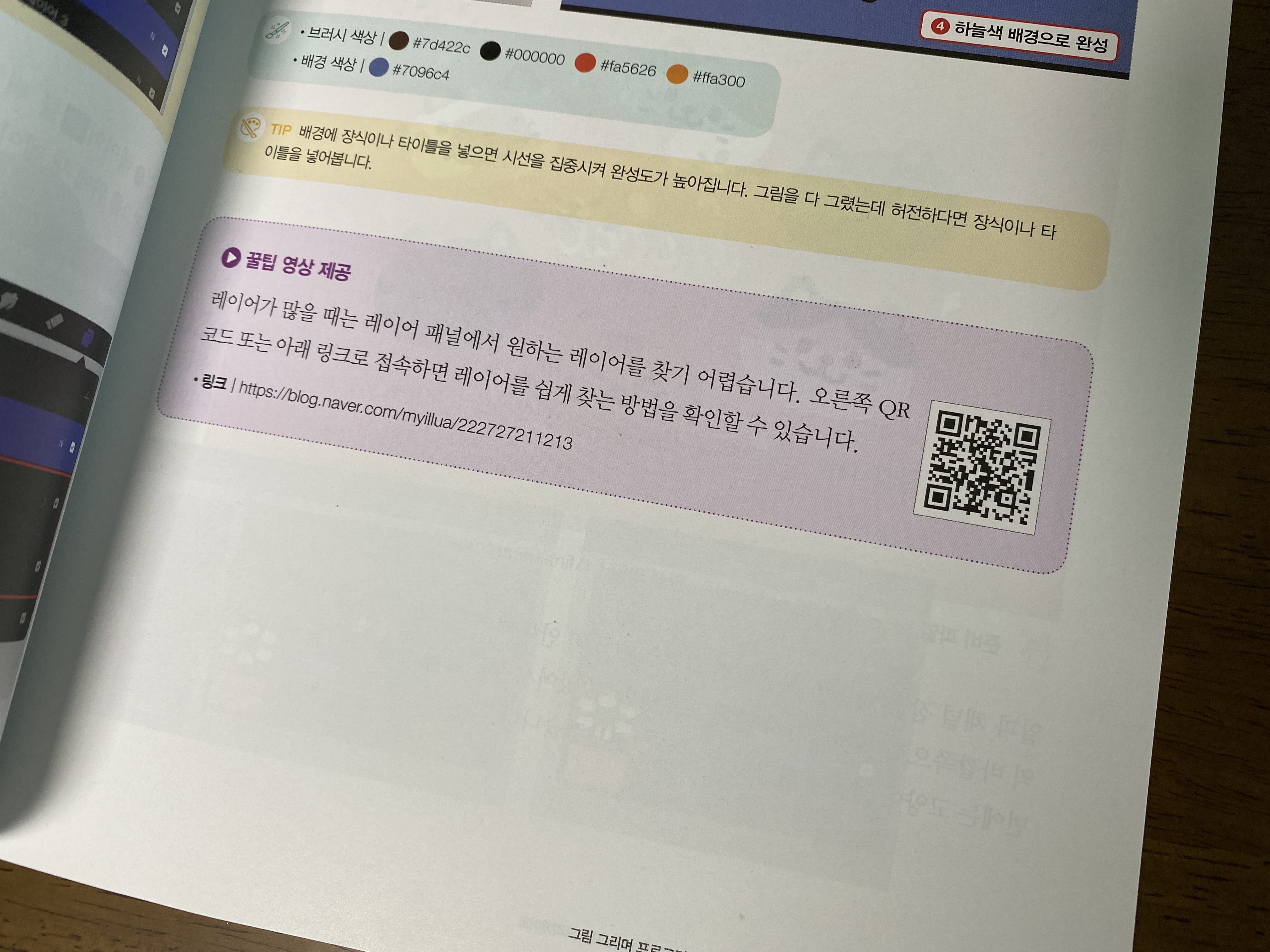 거의 모든 실습이 따라하기 무리가 없으며 처음에 나오는 몇 개의 실습이나 자세한 설명이 필요한 건 QR코드로 들어서 동영상을 보면서 따라 할 수 있습니다. 저는 이 책을 보고 저자 '빨간고래'님의 유튜브 채널을 구독했는데 여기에서도 아이패드 프로크리에이트로 그림 그리는법을 배울 수 있었습니다. 완전 초보라면 책도 좋지만 영상을 보는 것도 괜찮은 것 같습니다.