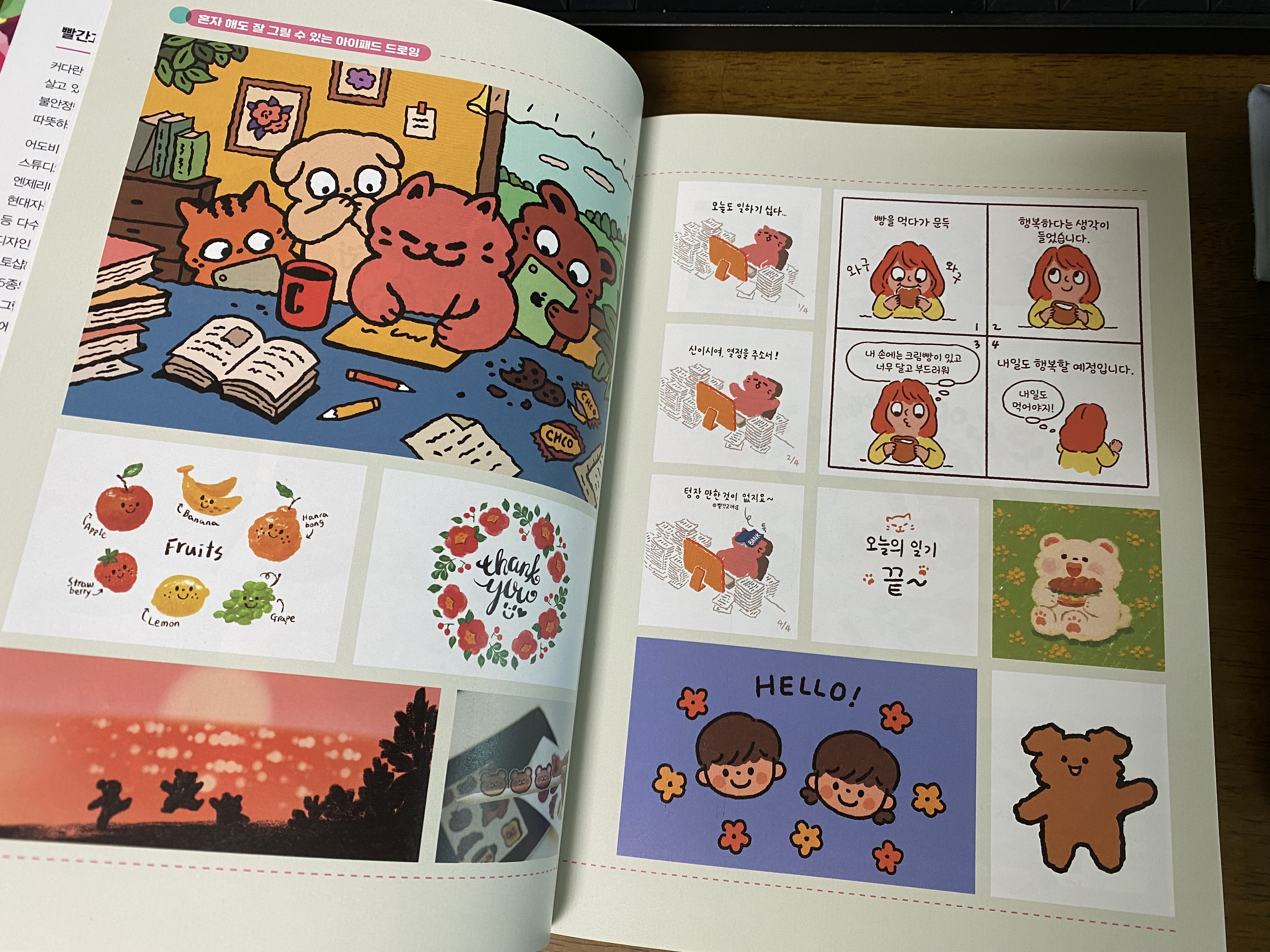 혼자 해도 프로 작가처럼 잘 그리는 아이패드 드로잉 with 프로크리에이트. 처음에는 책이 귀엽고 그림도 아이들이 따라 하기 쉬운 귀여운 캐릭터라 만만하게 봤는데 책을 자세히 보다 보니 이 노하우를 다 체화시키려면 상당한 연습이 필요할 거라는 결론을 내렸습니다. 역시 고수가 되기 위해서는 연습 또 연습이 필요해 보입니다. 한 번에 다 알려고 노력하면 지칠 수 있으니 그냥 재밌게 따라 하면서 익히는 것이 좋아 보입니다.