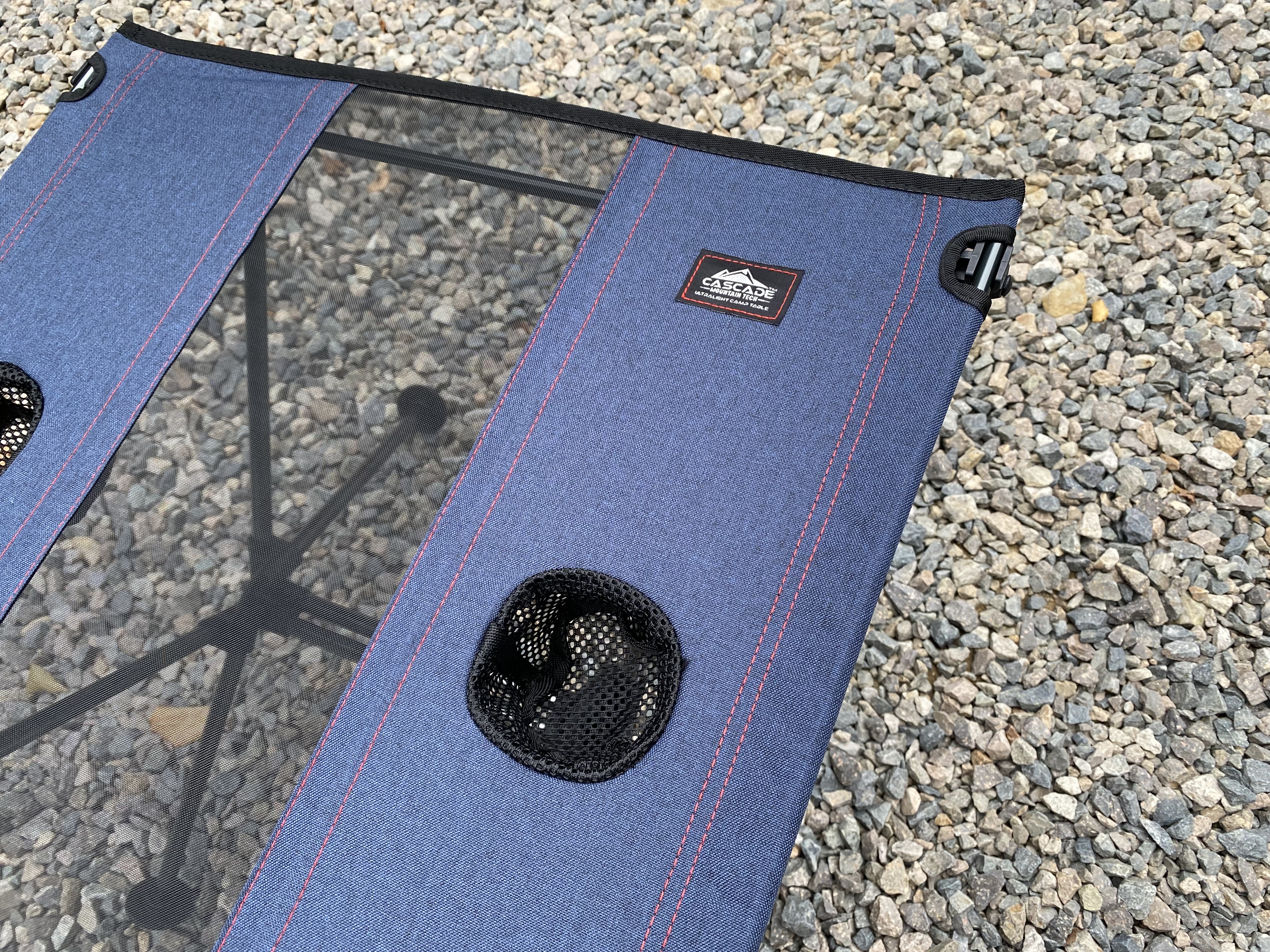 접이식 테이블 가운데 부분이 그물망(메쉬)으로 되어 있어서 음료나 물을 쏟았을 때 처리하기가 편합니다. 컵이나 물병을 끼울 수 있는 홀이 2개 있습니다.