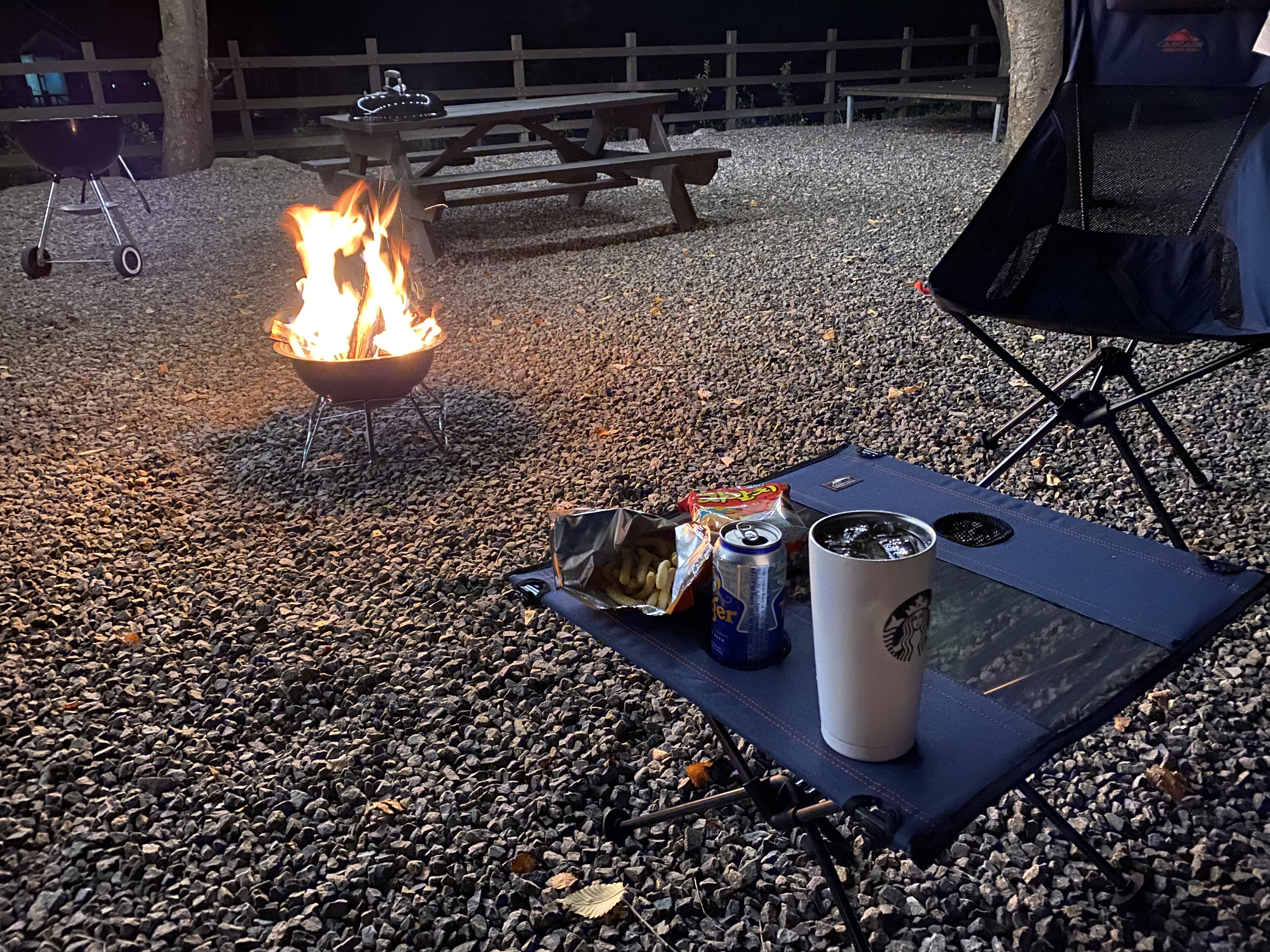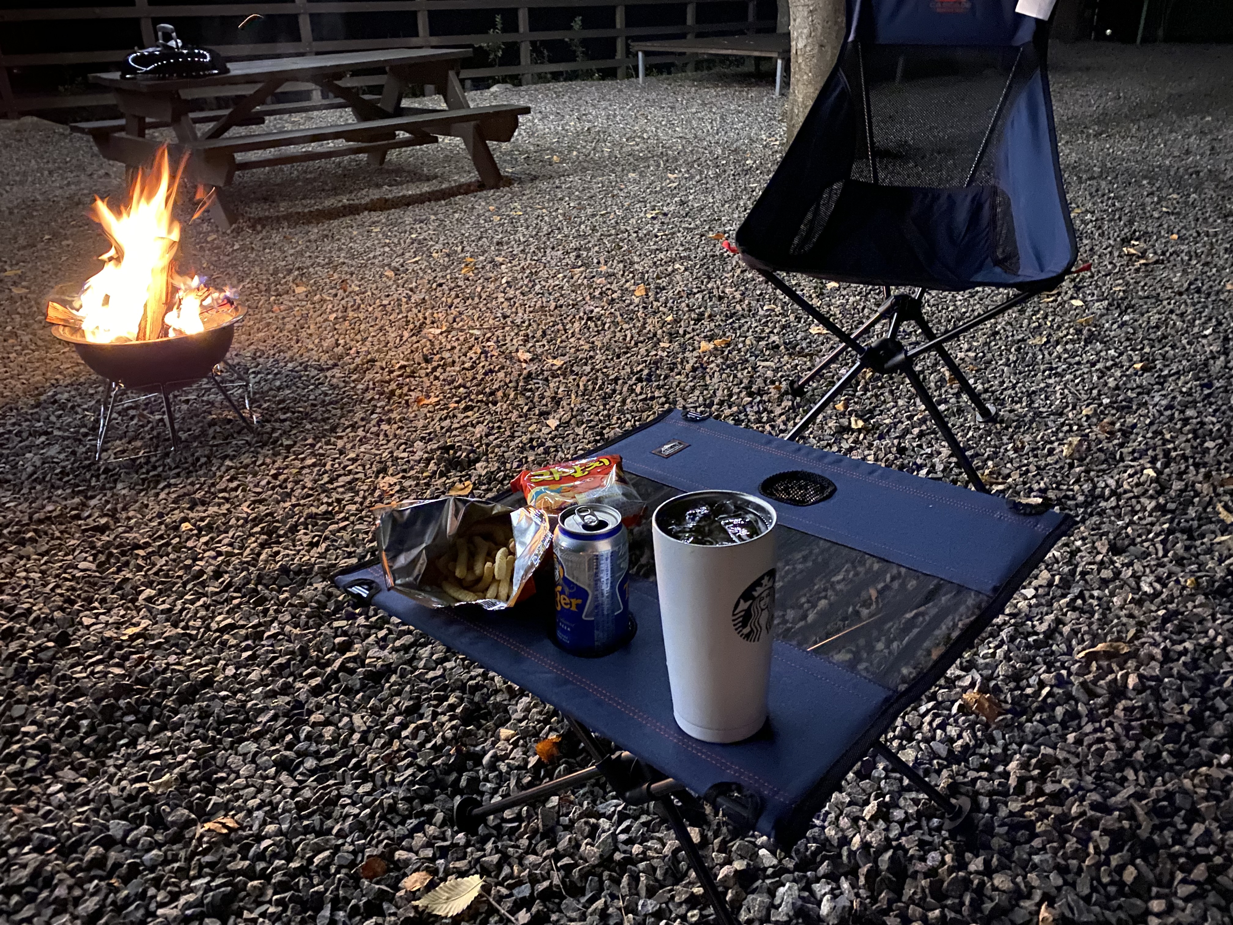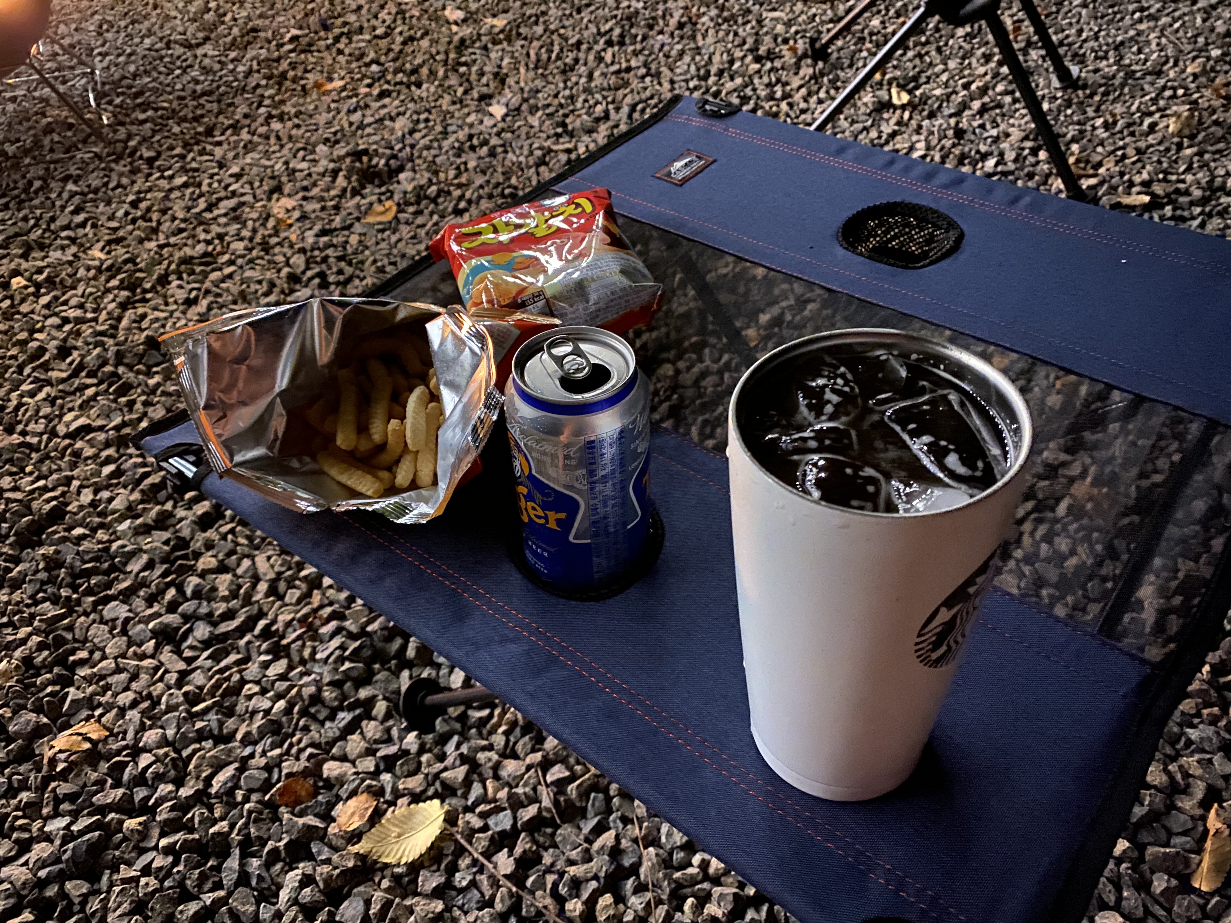 캐스케이드 접이식 테이블은 간단하게 맥주를 즐기기에 딱이네요. 조금 큰 컵은 홀에 잘 들어가지 않는데 쓰다 보니 조금 늘어나 들어가긴 합니다. 긴 맥주병이나 컵, 유리잔은 테이블 위에서 조금 위태위태합니다. 땅이 고르지 못한 것도 있지만 아무래도 천으로 된 상판이다 보니 조금씩 기울어집니다. 조심해서 써야 할 것 같아요.