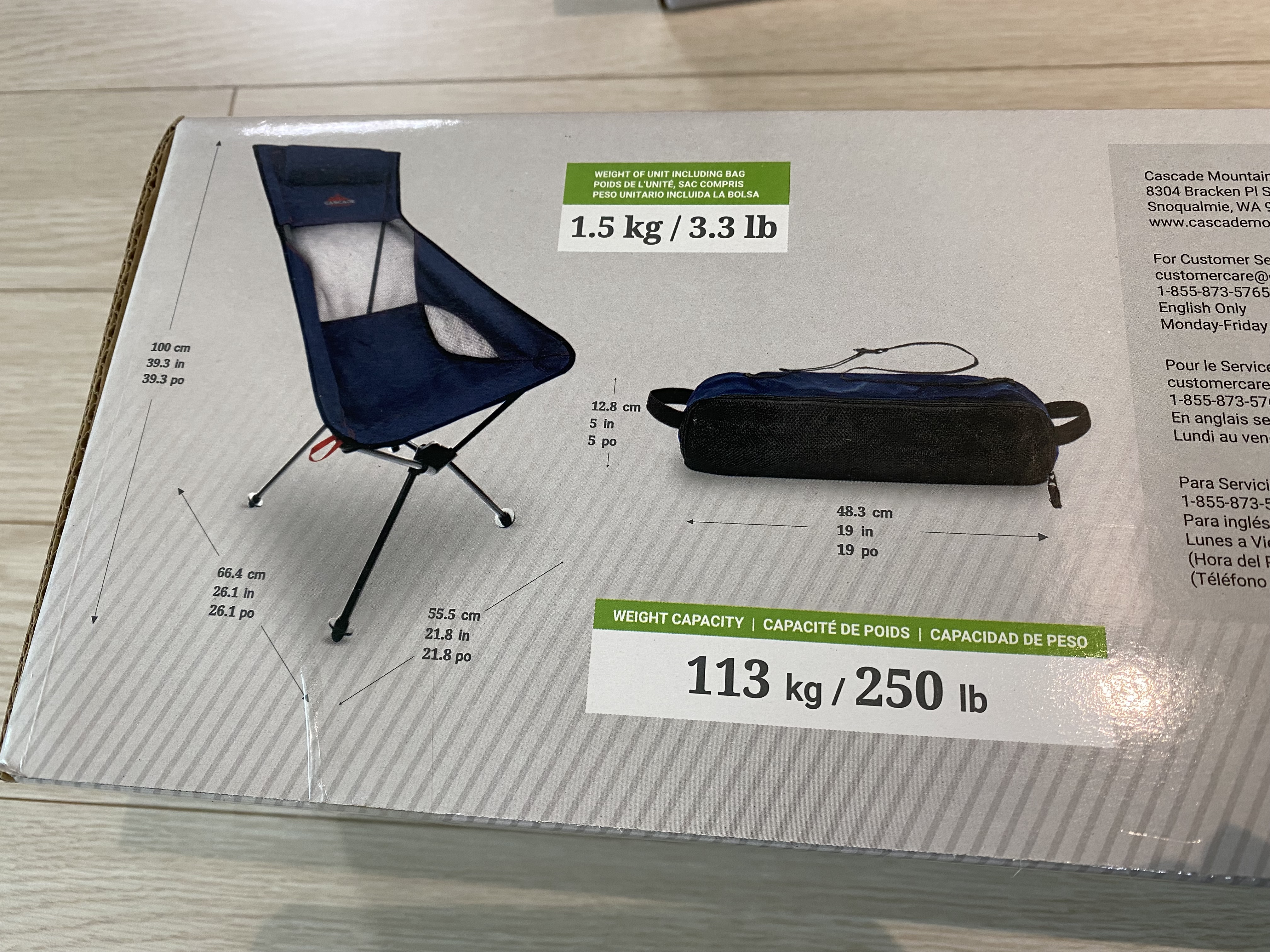 캐스케이드 캠핑 의자 무게는 1.5kg. 몸무게 113kg까지 사용할 수 있다고 하네요.