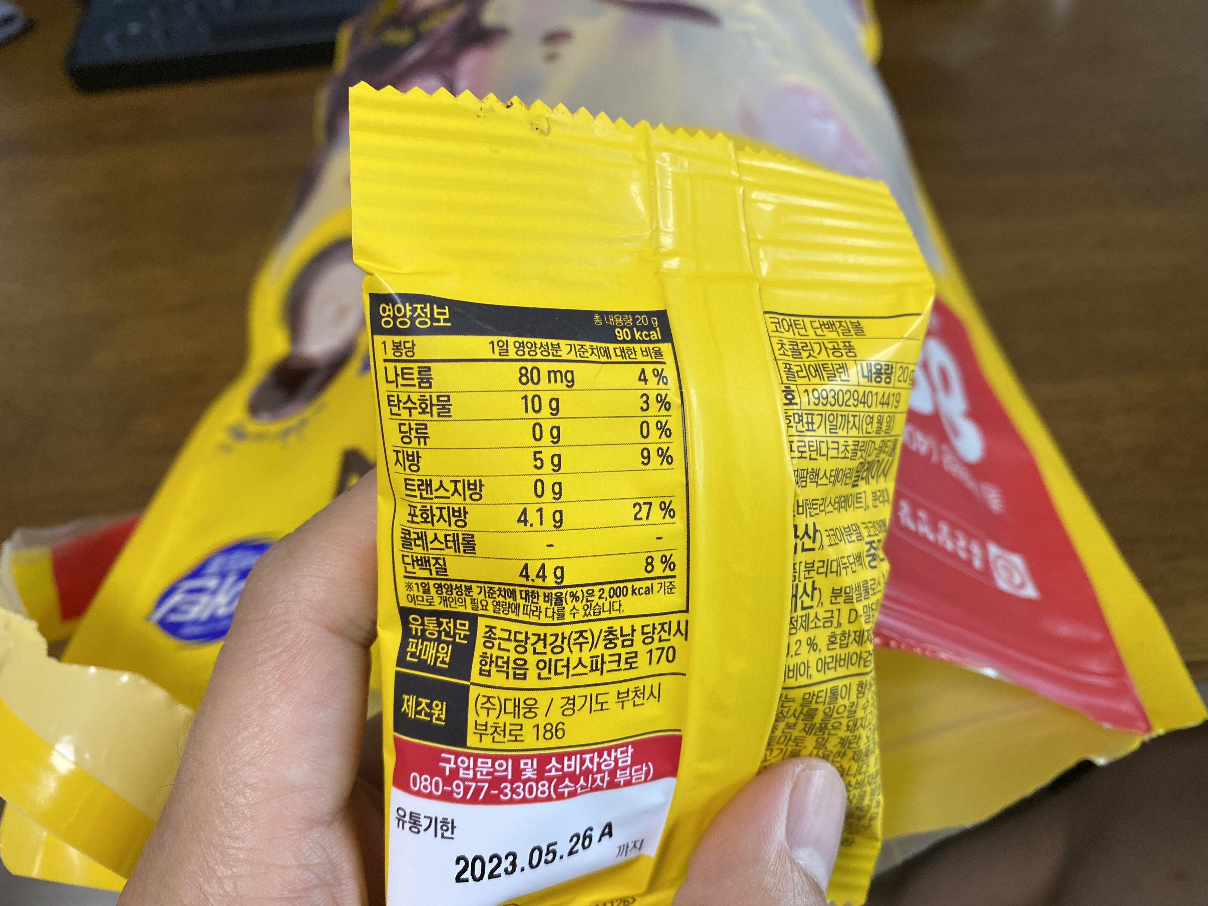 100g당 단백질 함량이 달걀, 우유랑은 비교도 안되고 닭가슴살과 비슷한 것을 볼 수 있습니다. 보통 인터넷 쇼핑으로 파는 다이어트 닭가슴살 팩이 100g씩 포장되어 있습니다. 이 정도의 단백질을 이 과자로 보충하려면 20g짜리 5봉지를 먹어야 된다는 말이네요. (닭가슴살 한덩어리 = 이 과자 5봉지) 먹으라면 먹겠지만 아무래도 초콜릿이라 5봉지는 힘들 것 같습니다. 밥 먹고 다른 과자 대신 간식으로 먹는 게 괜찮을 것 같네요.