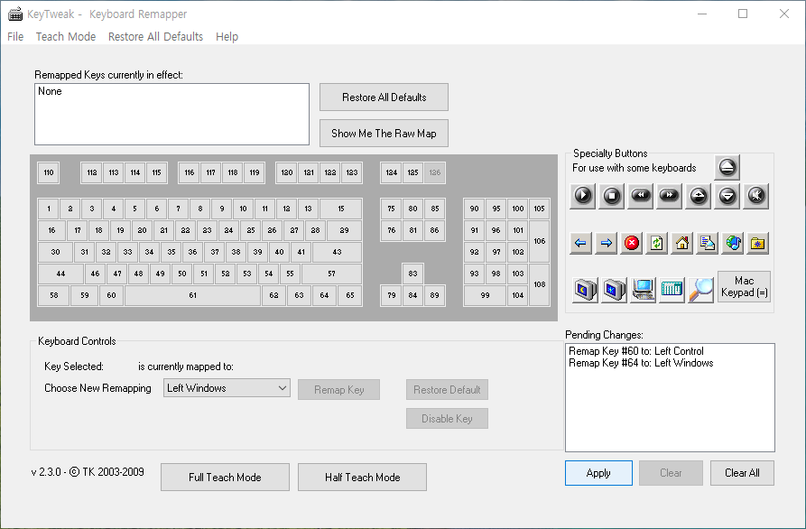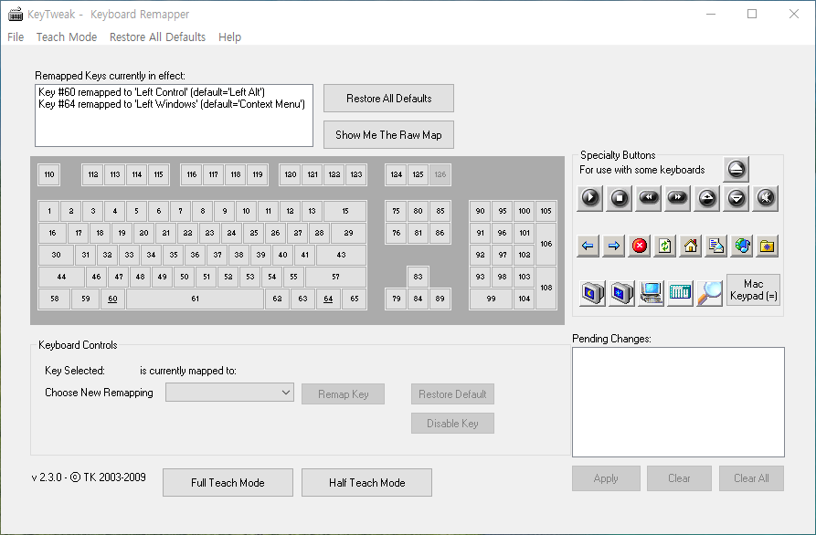 윈도우를 재부팅하고 KeyTweak를 실행시켜보면 왼쪽 위에 매핑된 키를 볼 수 있습니다. 이러한 설정은 Restore All Defaults 버튼을 클릭하여 언제든 초기화시킬 수 있습니다.