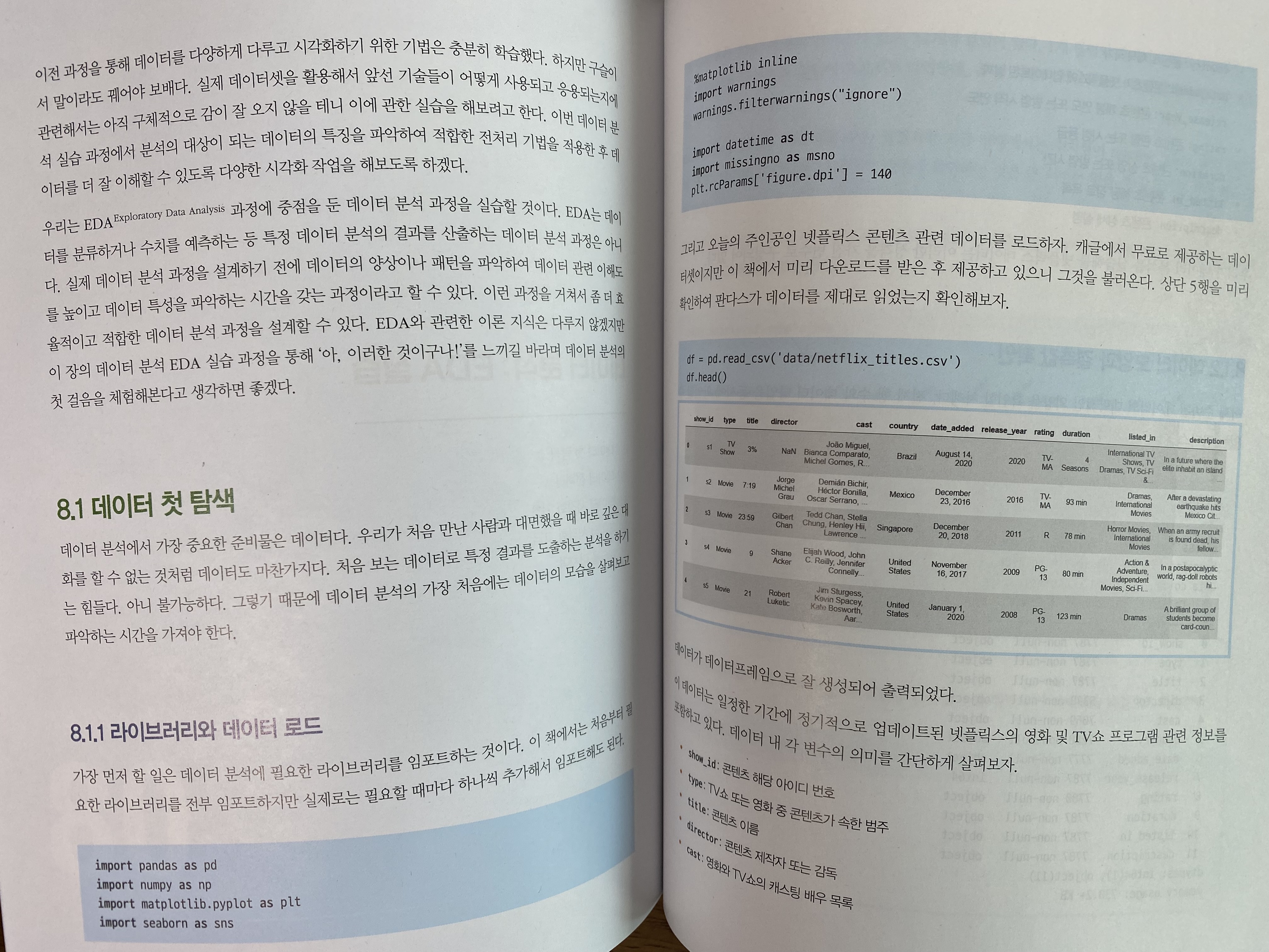 이 책을 읽으며 좋았던 점은 마지막 ‘챕터8 데이터 분석: EDA 실습’ 부분이었습니다. 1장부터 7장까지 보면서 라이브러리가 뭔지는 대강 알겠는데 어떻게 활용할지는 막막했습니다. 근데 마지막 실습을 직접 하나하나 따라 해 보니 확실히 감을 잡을 수 있네요. 아주 고난도 테크닉을 배우는 건 아니지만 자주 사용하는 데이터 분석 방식을 익힘으로서 다음에 다른 데이터를 만나도 비슷하게 따라 할 수 있을 것 같습니다. 챕터8을 하면서 헷갈리는 부분을 앞에서 찾아가며 공부하니 복습도 되고 좋았습니다.