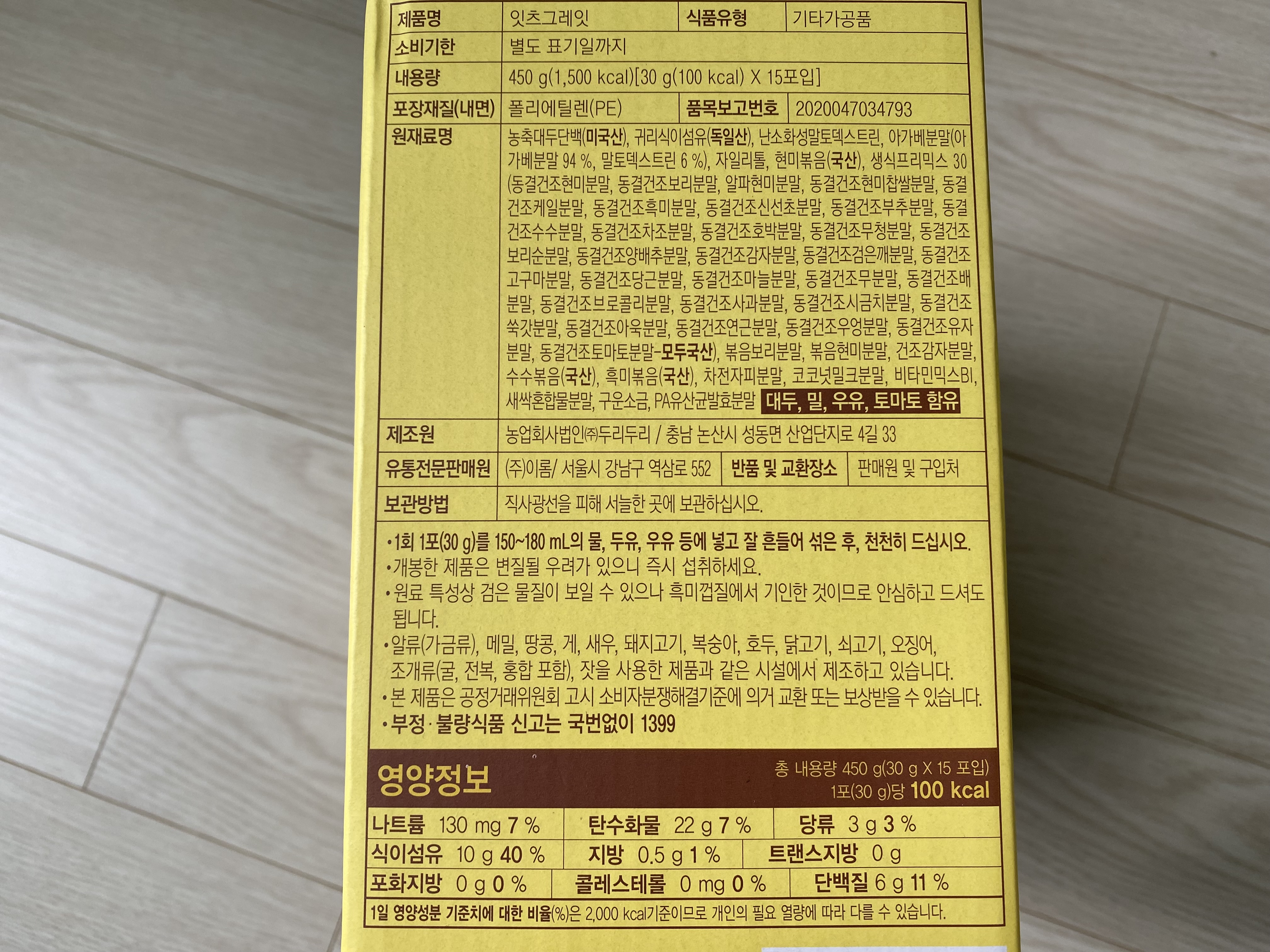 이롬 잇츠그레잇 가격은 30g X 15개에 19,990원. 생각보다 저렴하진 않네요. 1포당 대략 1333원으로 같이 먹는 우유 가격 생각하면 약 2000원 가격에 한끼를 때우는 셈입니다. 할인할 때 쟁여하지...