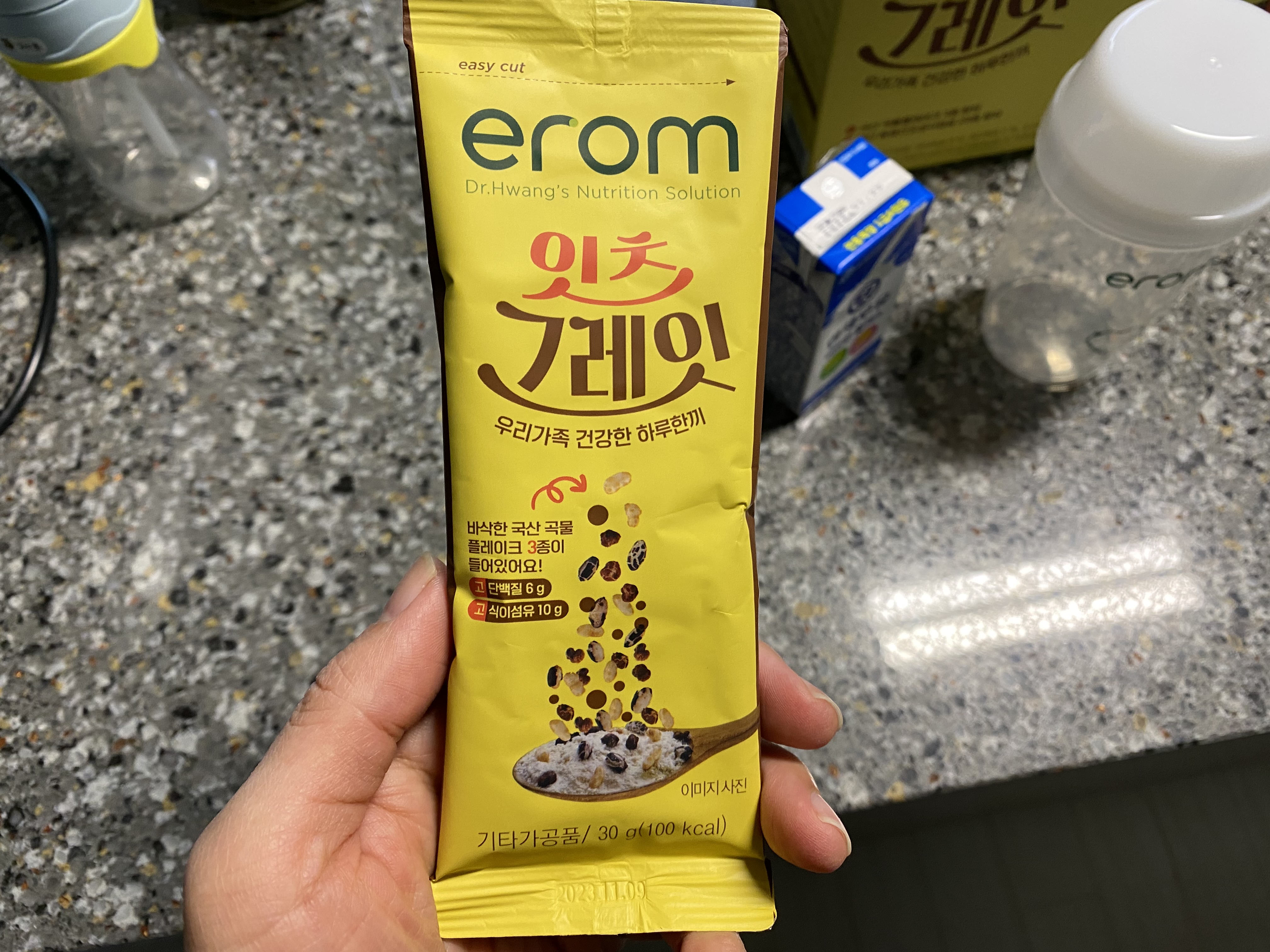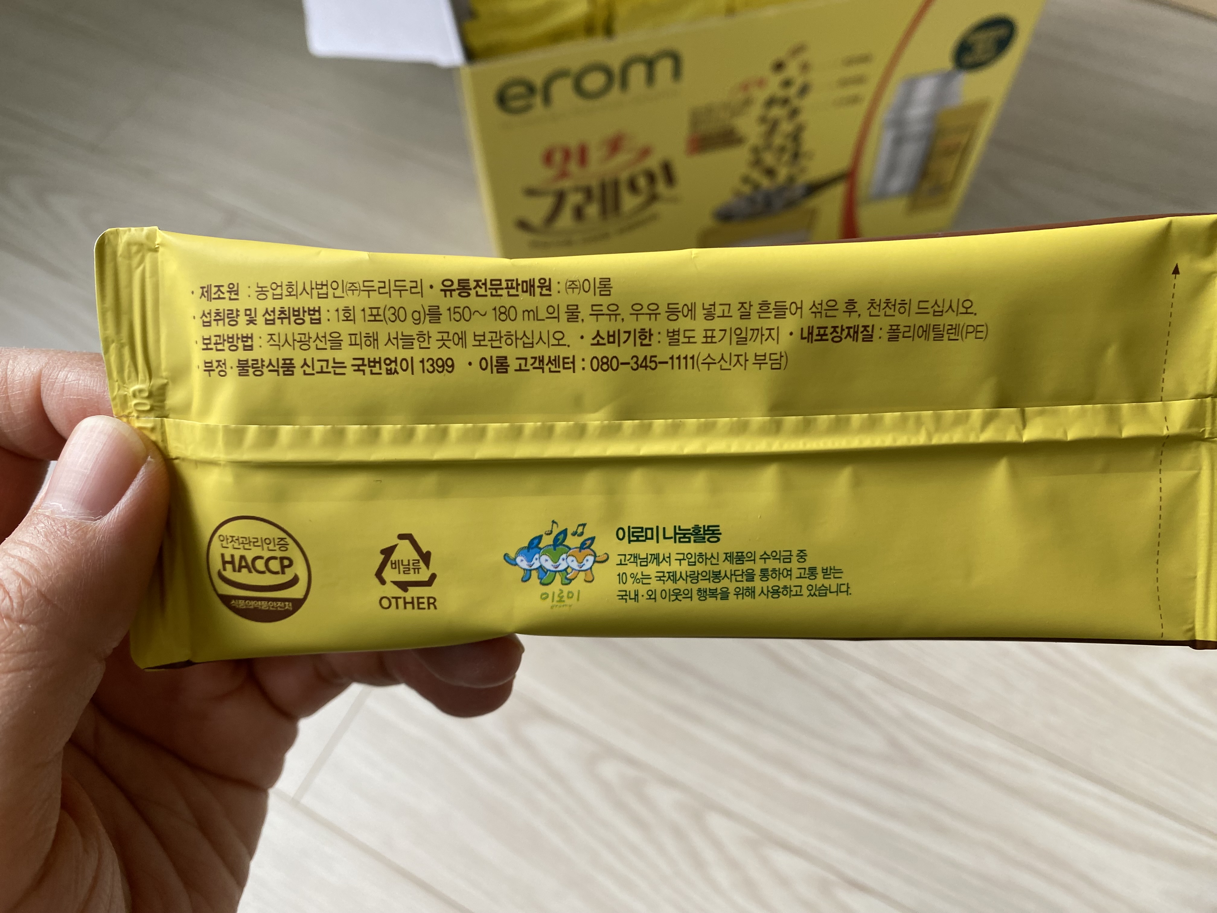 이롬 잇츠그레잇 가루에 곡물 플레이크가 보이는 것이 특징입니다.