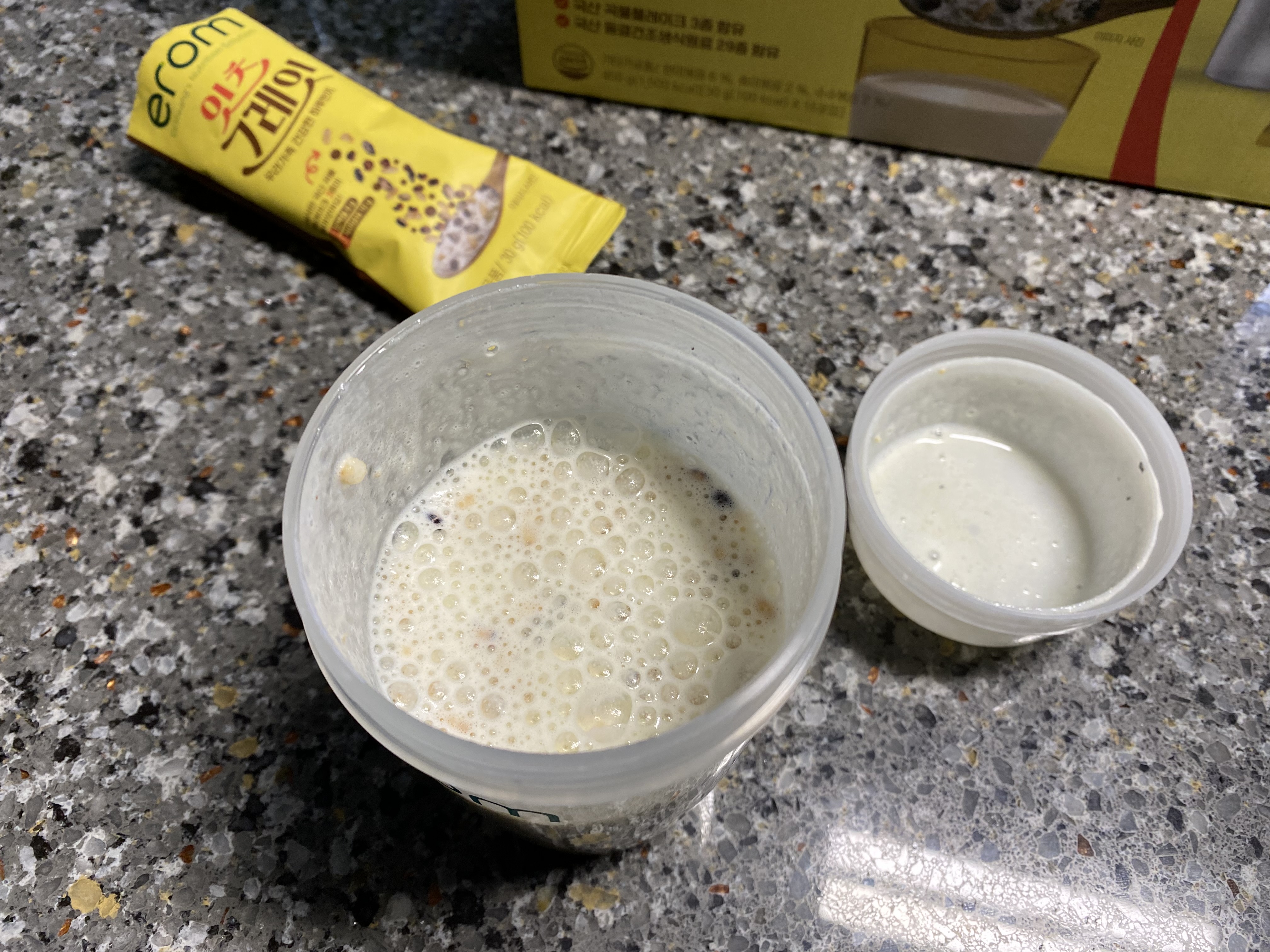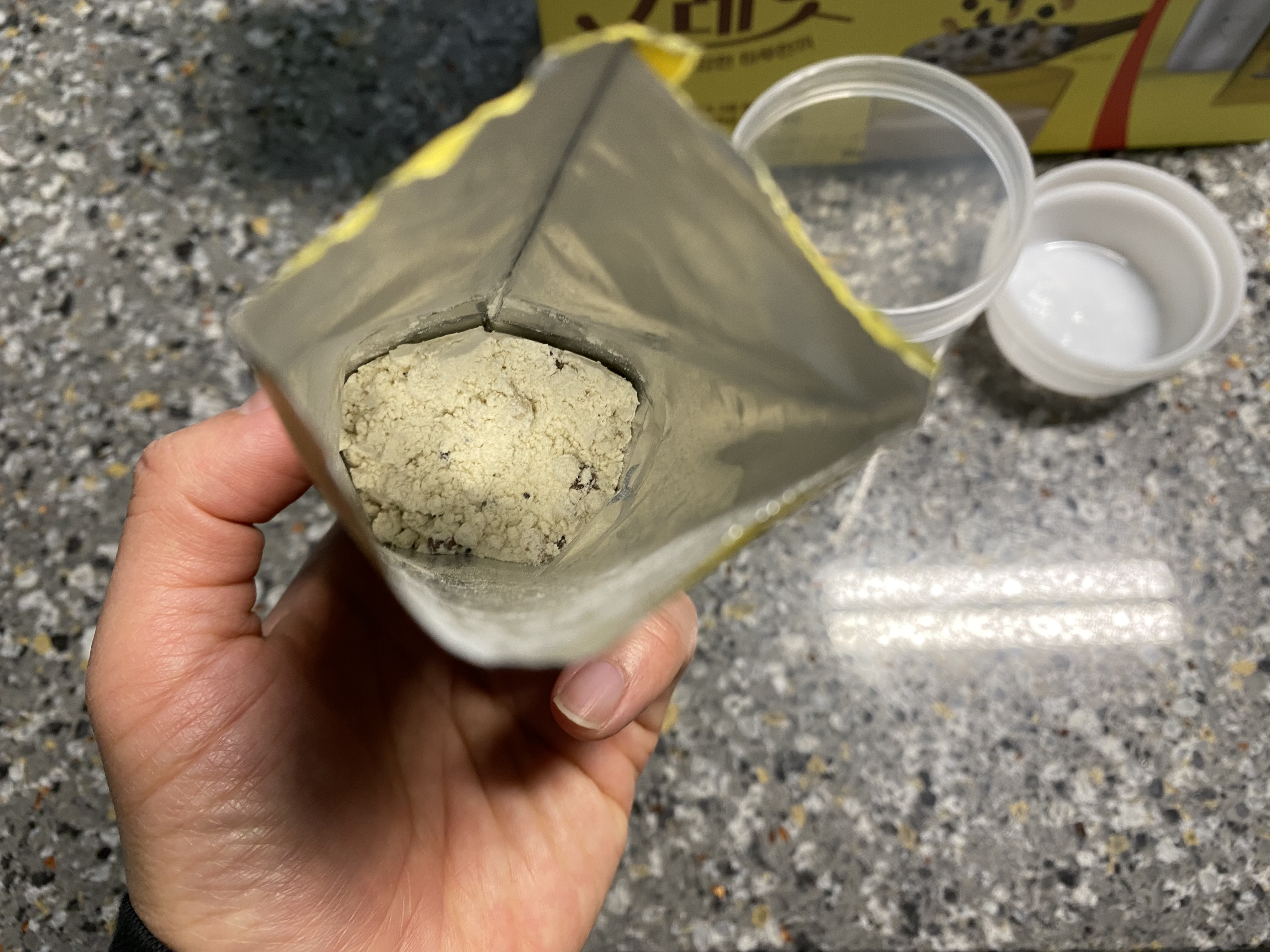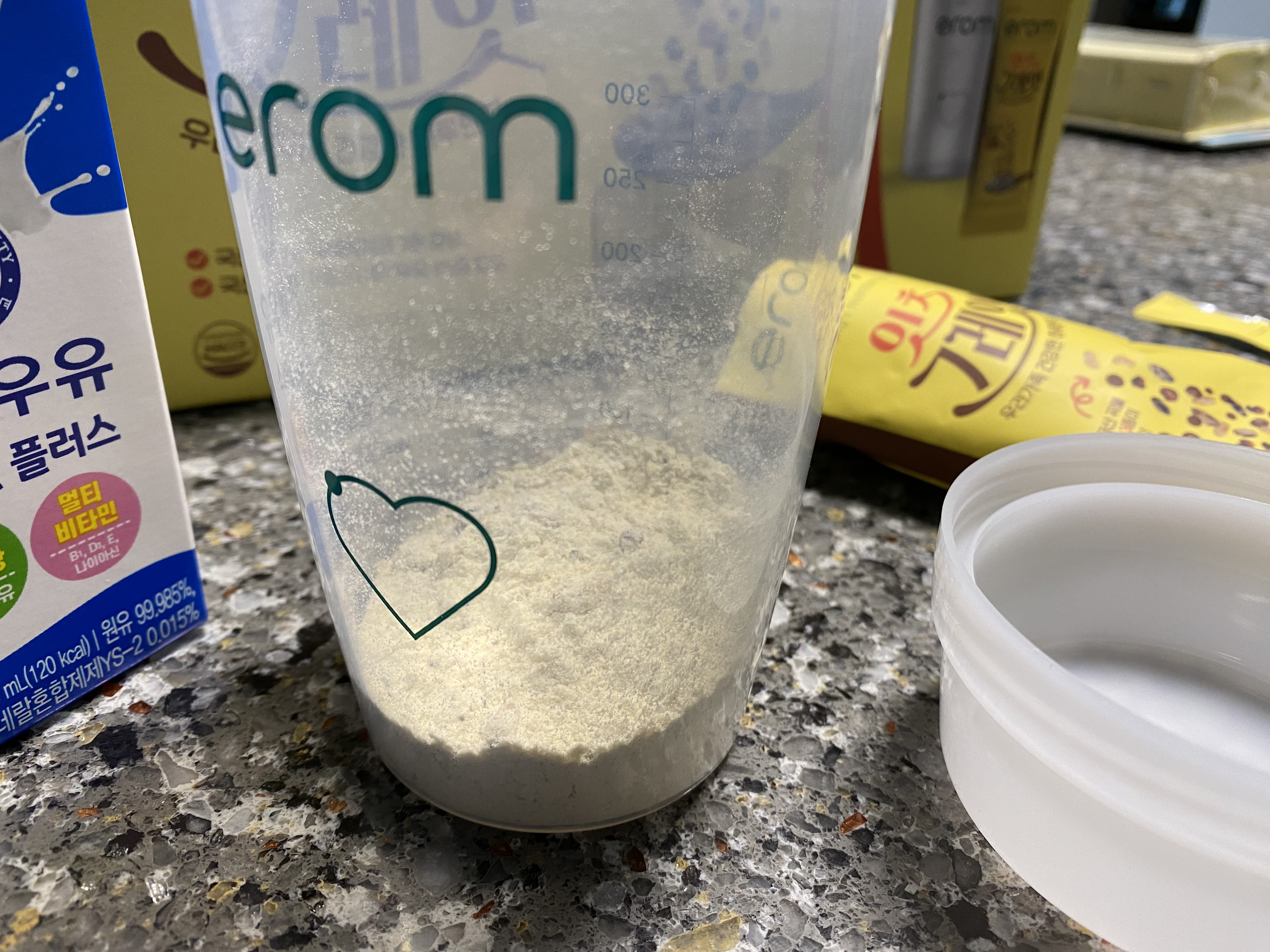 사진을 찍으려고 가루부터 넣었는데 사실 우유나 두유부터 넣고 가루를 넣는 게 좋습니다. 가루부터 넣으면 밑에 있는 가루가 붙어서 잘 안 섞이거든요.
