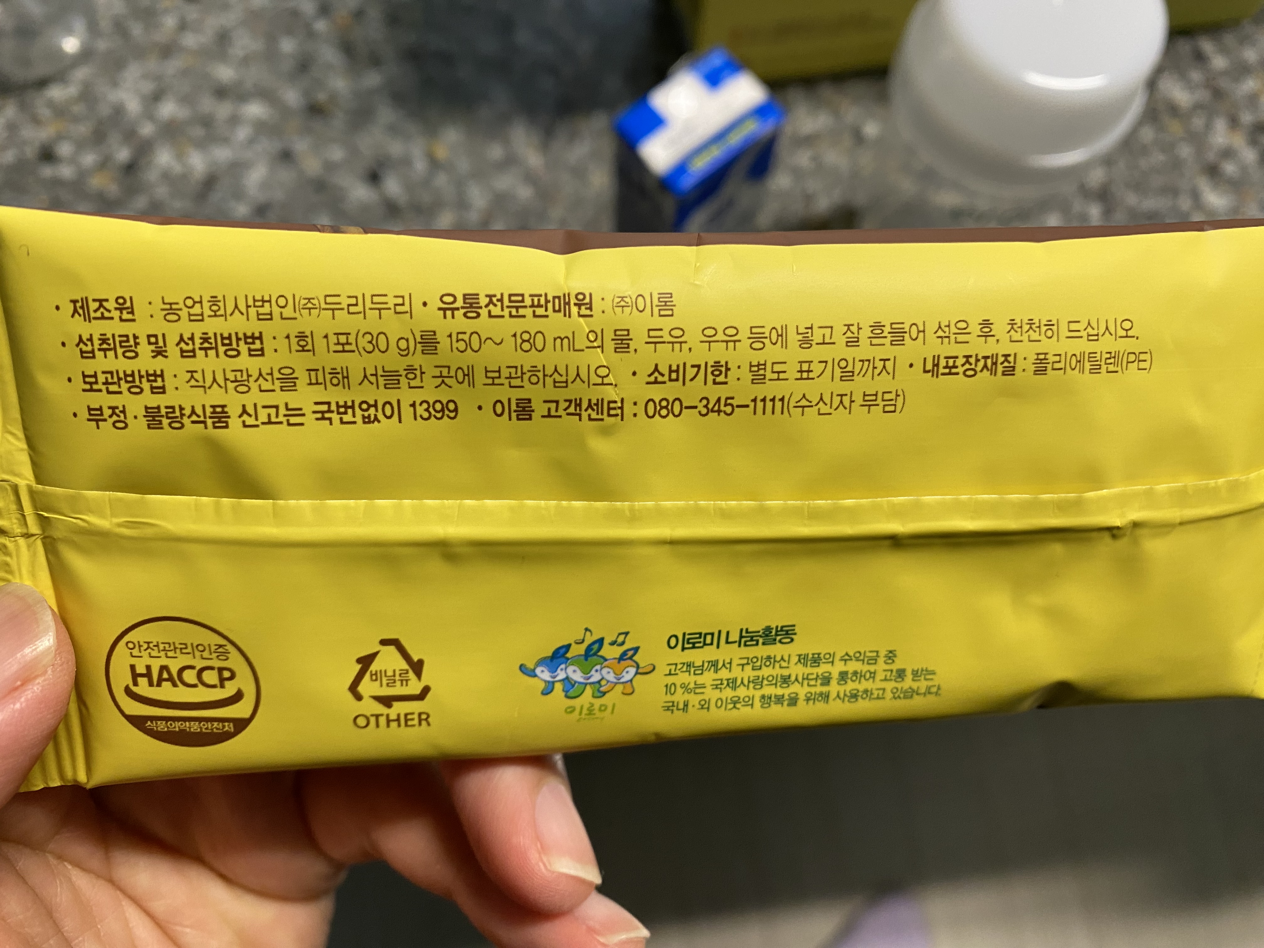 섭취량 및 섭취방법: 1회 1포(30g)를 150~180mL의 물, 두유, 우유 등에 넣고 잘 흔들어 섞은 후, 천천히 드십시오... 시키는 대로 한번 해봤습니다.
