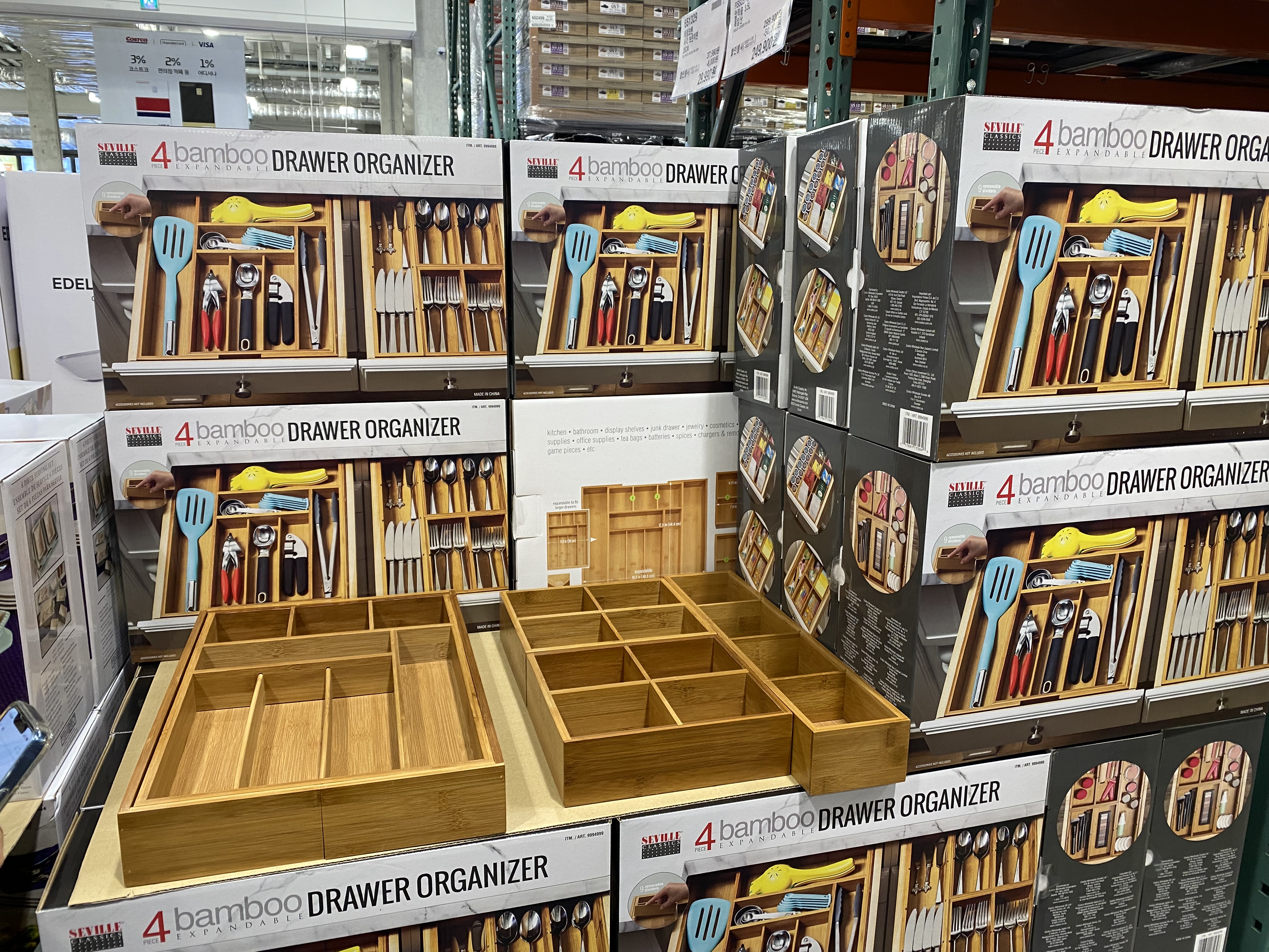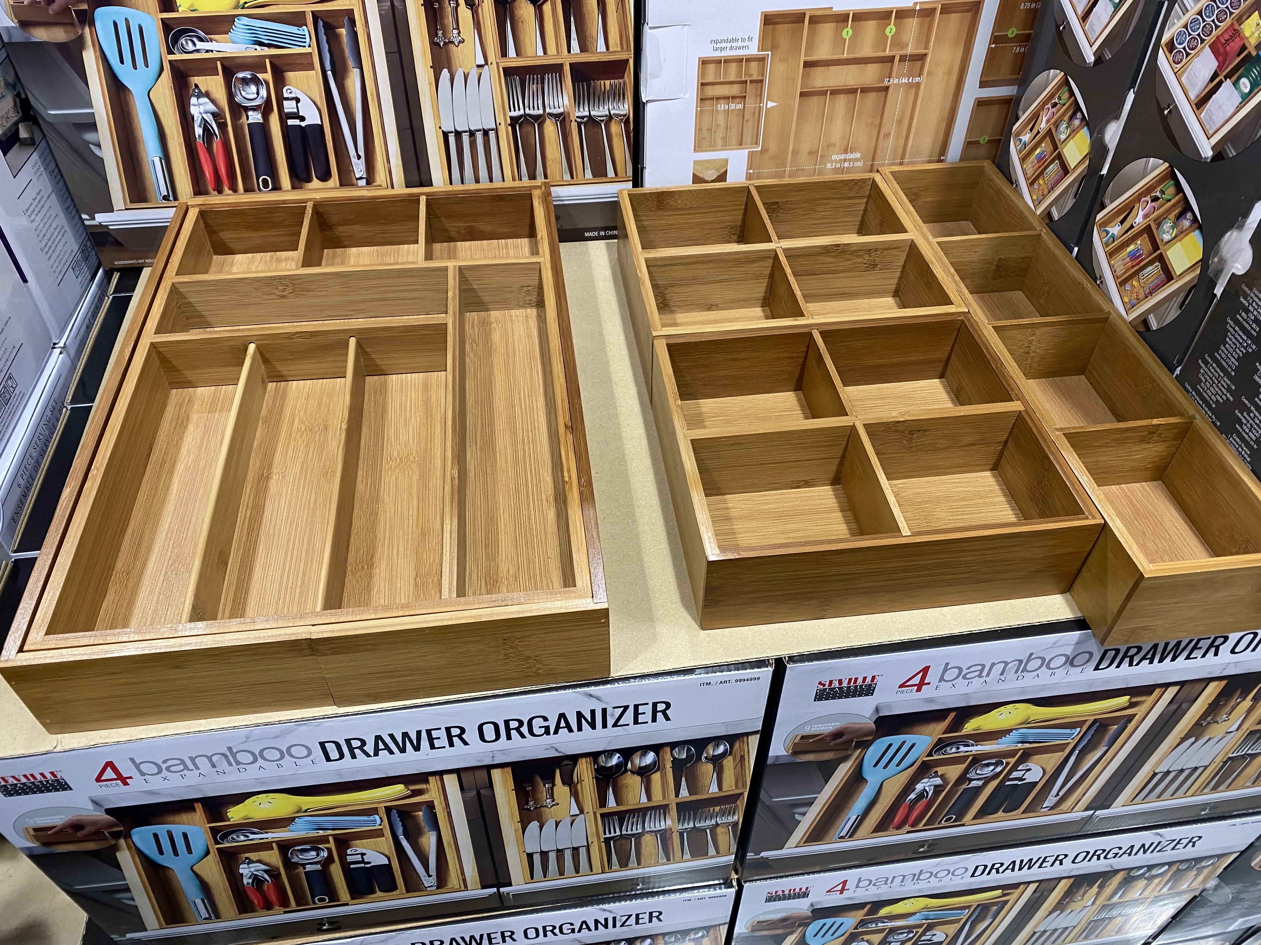 코스트코에서 가장 많이 지나가는 통로에 배치되어 있었는데 한번에 눈에 확 들어오더군요. 수저, 포크, 나이프 등을 깔끔하게 정리할 수 있을 것 같습니다. 왼쪽에 있는 게 확장형 정리함인데 밖에 있는 나무판을 옆으로 확장할 수 있어서 최대 46.5cm까지 늘어나 제법 넓은 공간을 수납할 수 있습니다. 그리고 확장형, 정사각, 직사각 할거 없이 중간에 있는 작은 나무판을 뽑아서 공간을 내가 원하는 대로 구성할 수 있습니다.