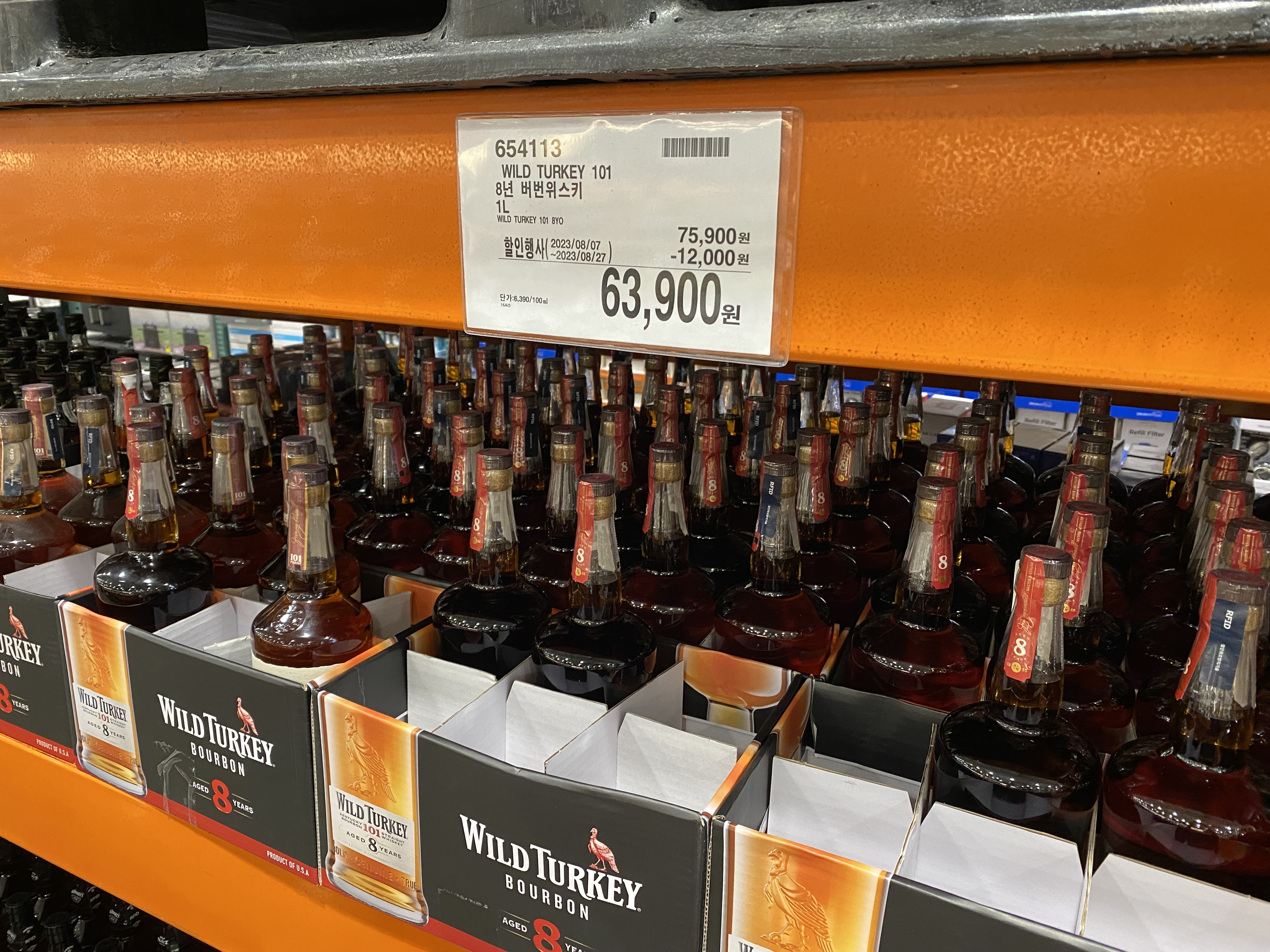 와일드 터키 WILD TURKEY 101 8년 버번 위스키 1L. 가격은 75,900원으로 조금 비싼 위스키인데 그래도 자주 할인을 하는 편입니다. 할인을 하면 6만 원 초반(정확히 63,900원, 단위가격 6,390원)에 구매할 수 있습니다.