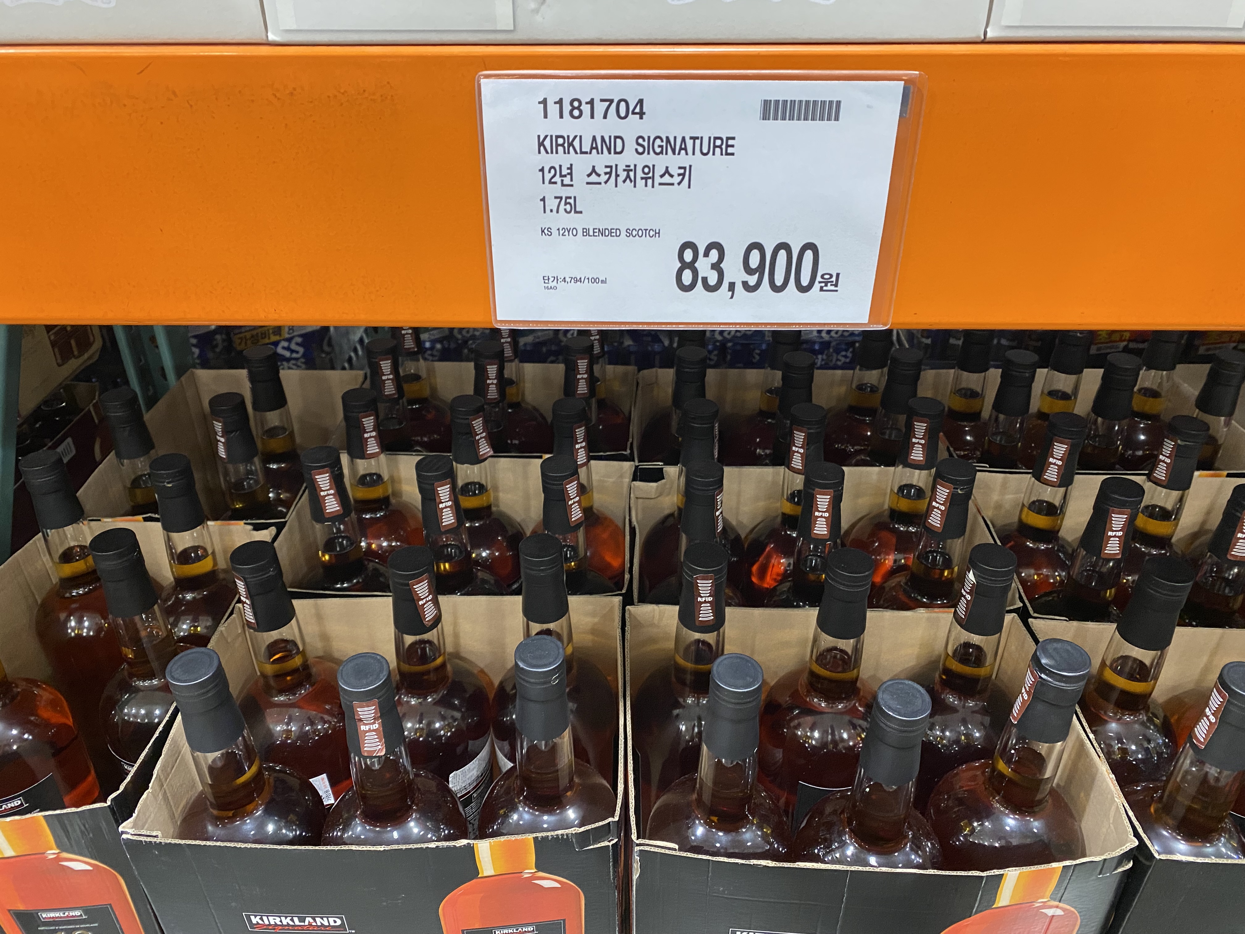 커클랜드 시그니처 KIRKLAND SIGNATURE 12년 스카치 위스키 1.75L. 이건 12년산이라 그런지 확실히 좀 비쌉니다. 가격은 83,900원(단위가격 4,794원)입니다. 이것도 맛을 몰라요.