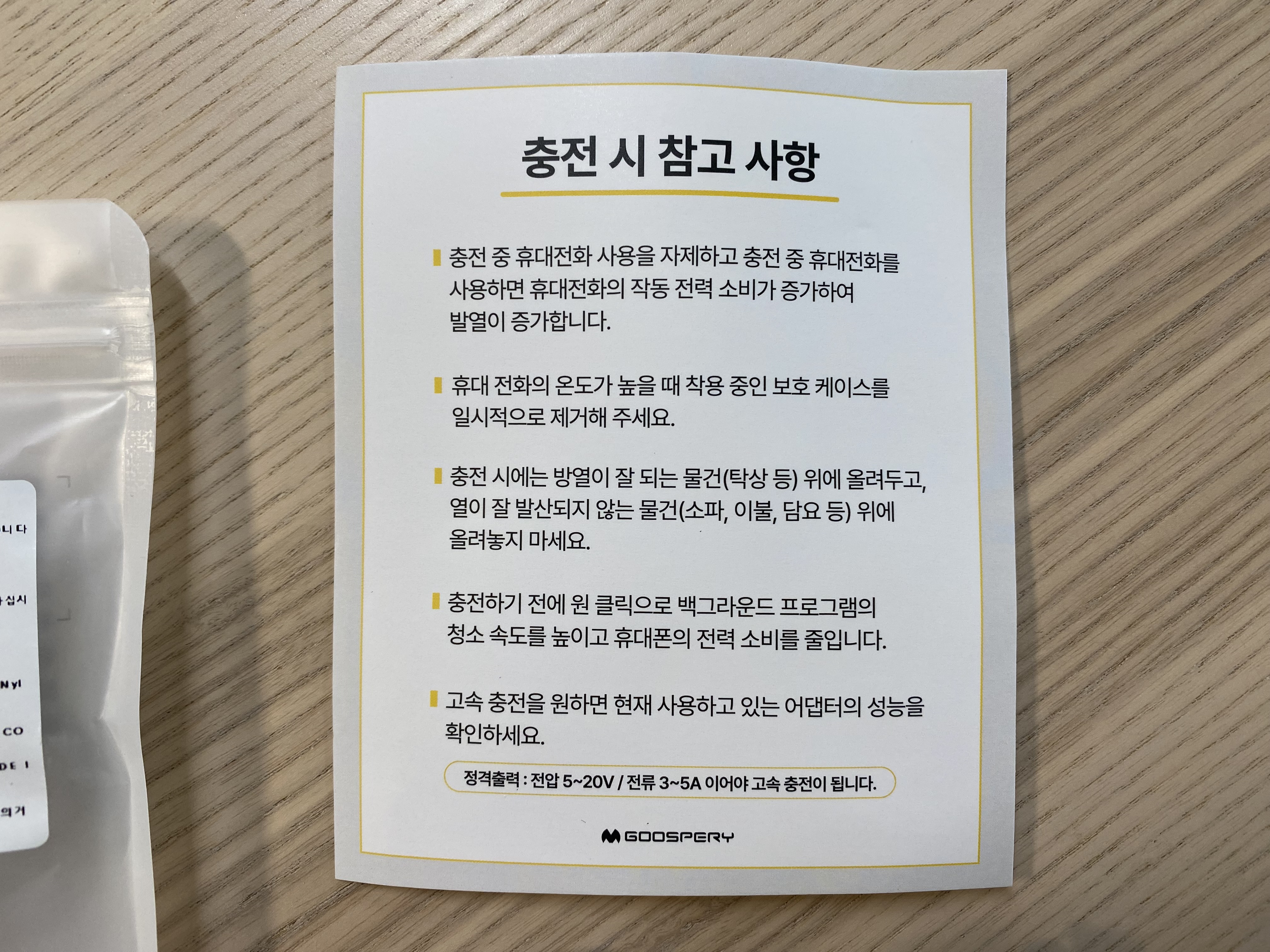 포장을 보면 주의사항, 품질표시 등을 볼 수 있습니다. 주의사항에 큰 특이점은 없네요. 이 케이블을 정확한 제품명은 '구스페리 C타입 to C타입 60W 단선방지 고속 충전케이블 2m'입니다.
