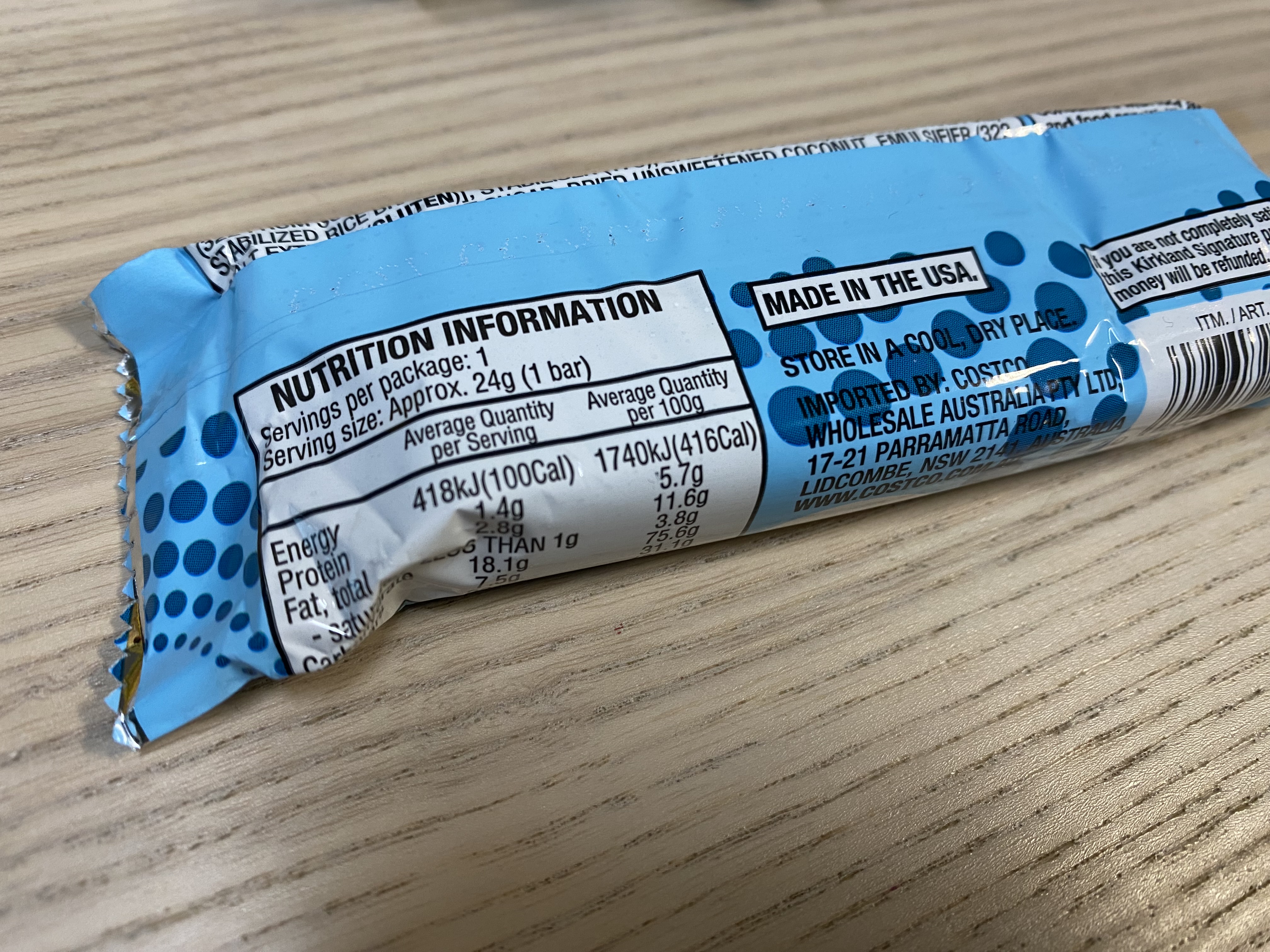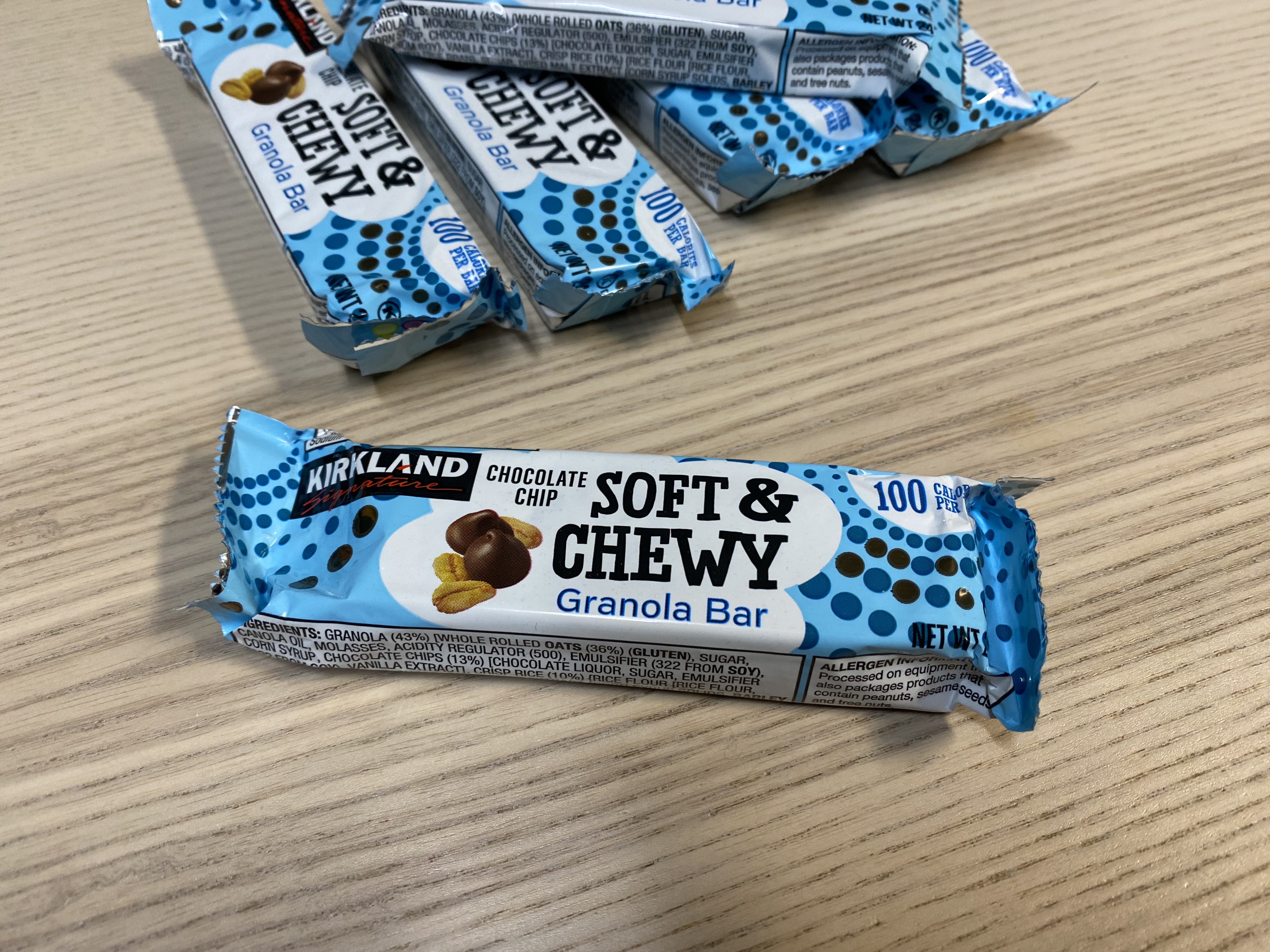 커클랜드 시그니처 소프트 앤 츄이 그래놀라 바 봉지를 깐 모습. 바삭한 식감은 전혀 아니고 그냥 부드럽고 끈적한 식감입니다. 그래놀라 바에 초코칩도 박혀 있어서 먹을만합니다. 약간 특이한 향과 맛이 느껴져서 아주 선호하는 그래놀라 바는 아닙니다. 사실 코스트코에서는 이것 말고도 맛있는 바가 많거든요. 보통은 한쪽면 전체가 초코로 되어있는 바가 맛이 좋았습니다. 맛이 너무 좋으면 건강에는 안 좋을 수도. 커클랜드 시그니춰 소프트 앤 츄이 그래놀라 바의 부드러운 식감이 도저히 적응 안 되는 분이라면 냉장고에 넣었다 드세요. 그러면 한결 낫습니다.