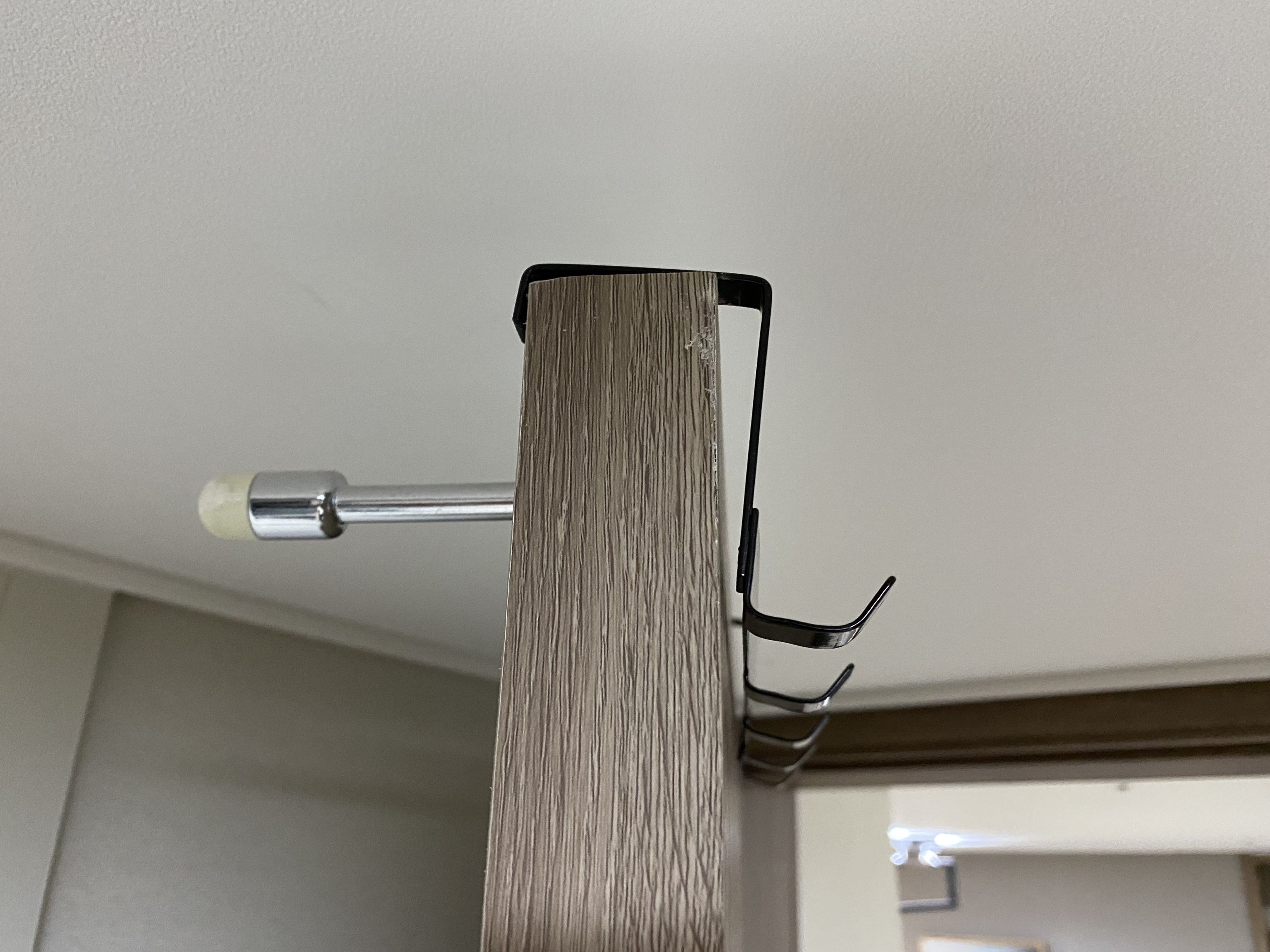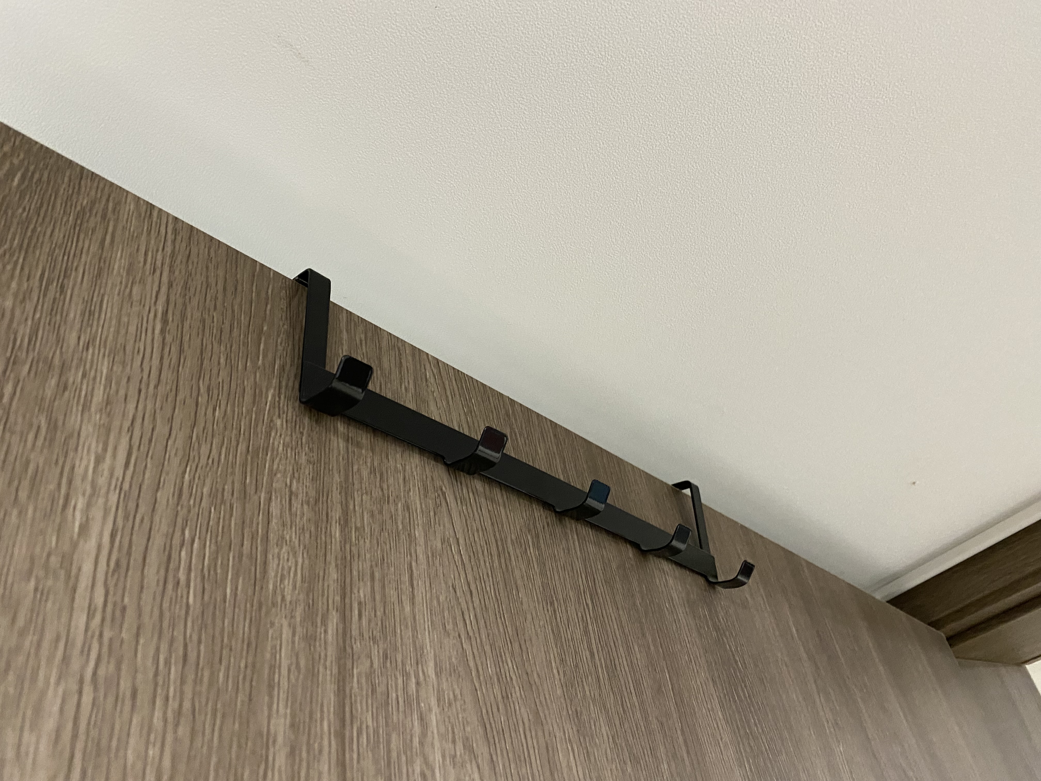 플라스틱 도어 후크가 휘어져있어도 이렇게 옷을 걸면 괜찮습니다. 천천히 펴지겠지 생각했는데 생각보다 안 펴지네요.