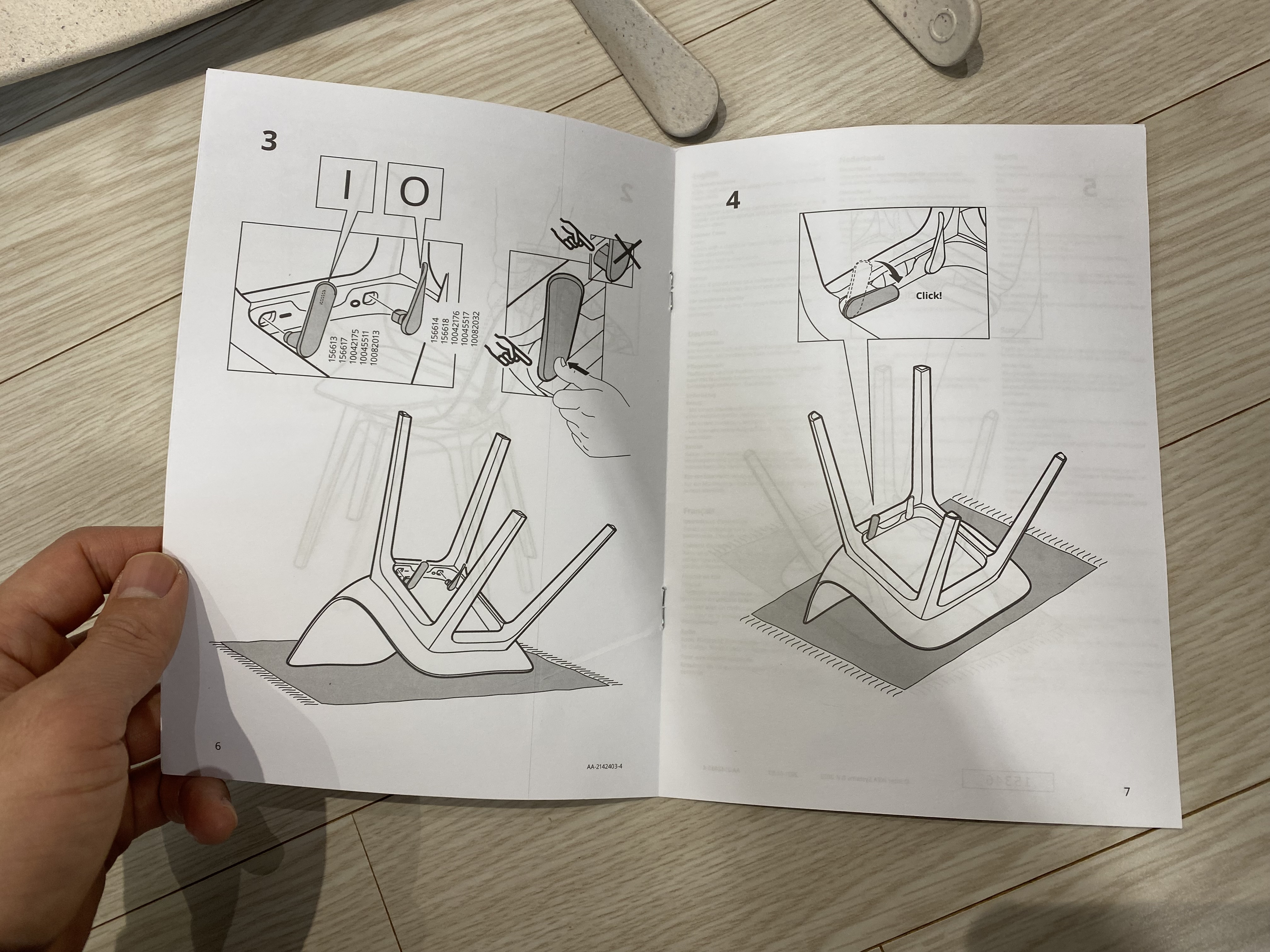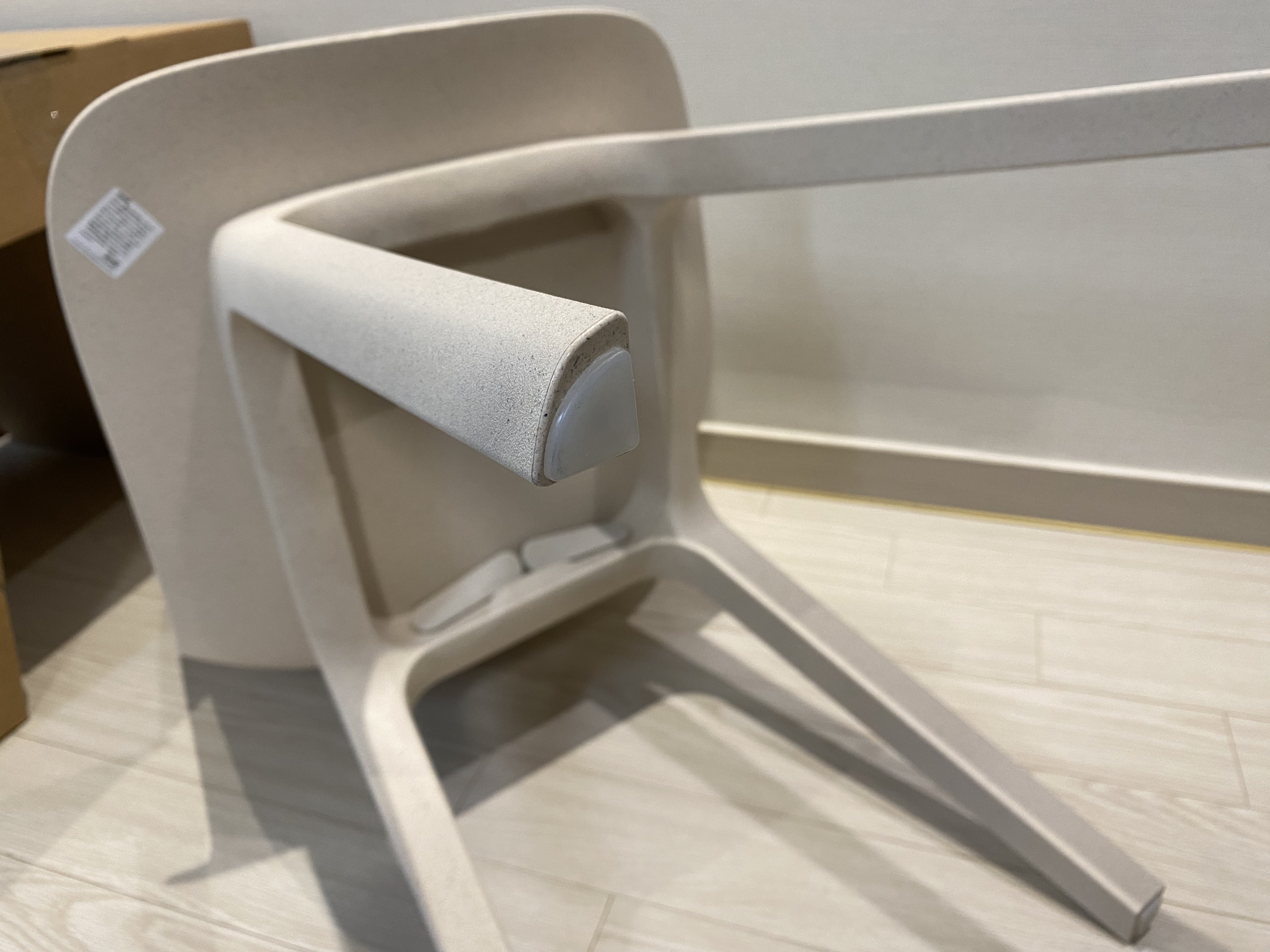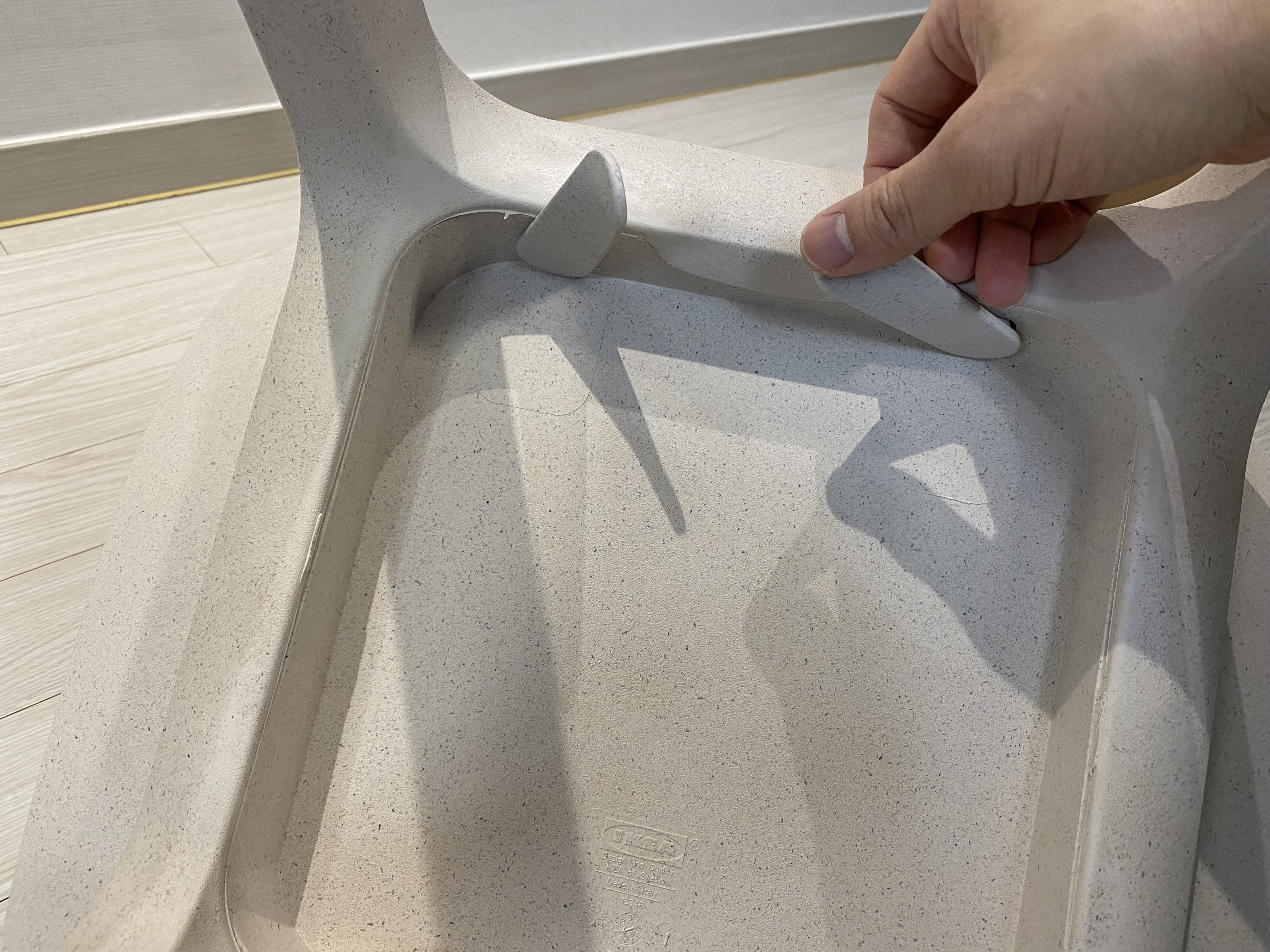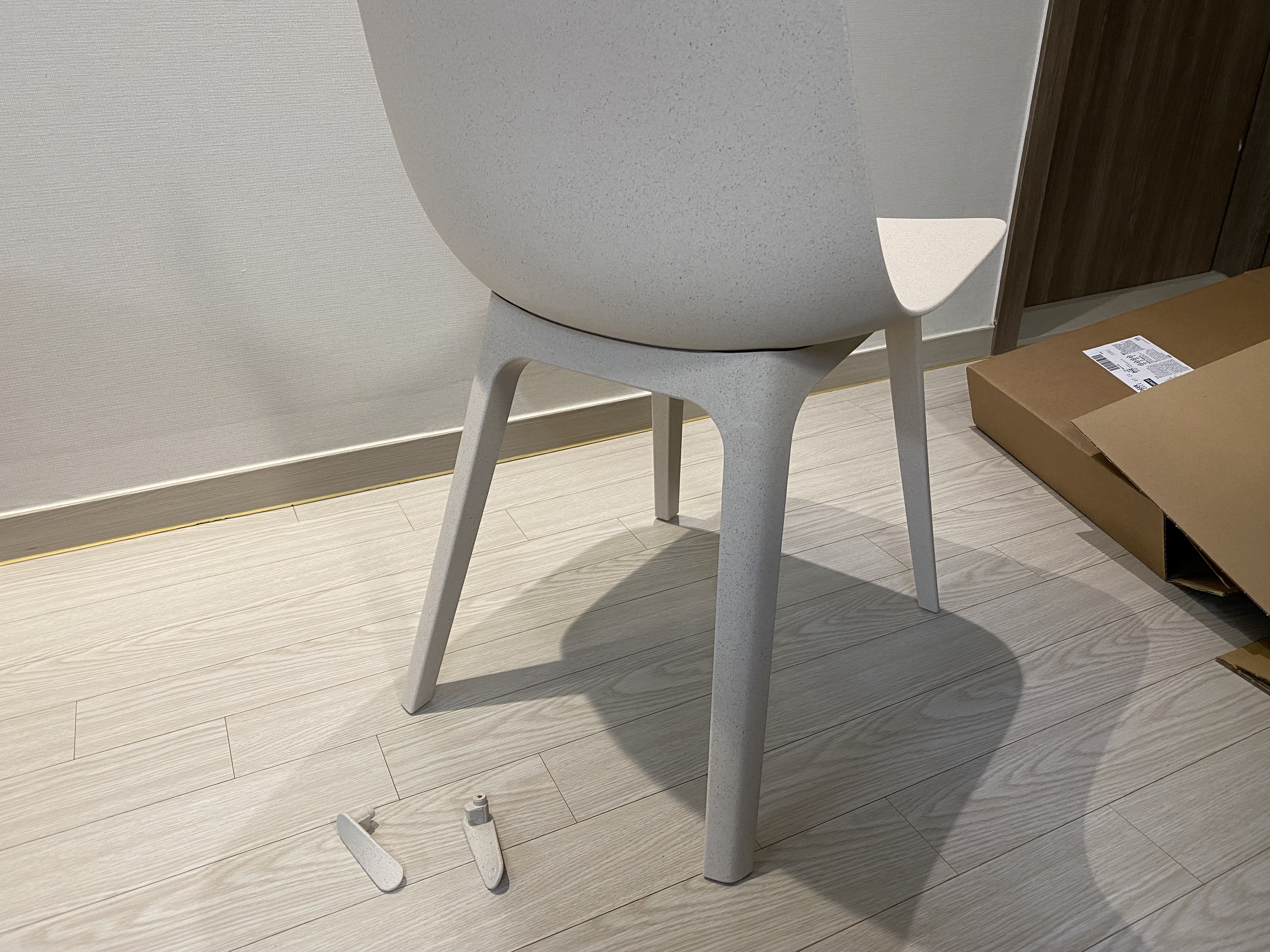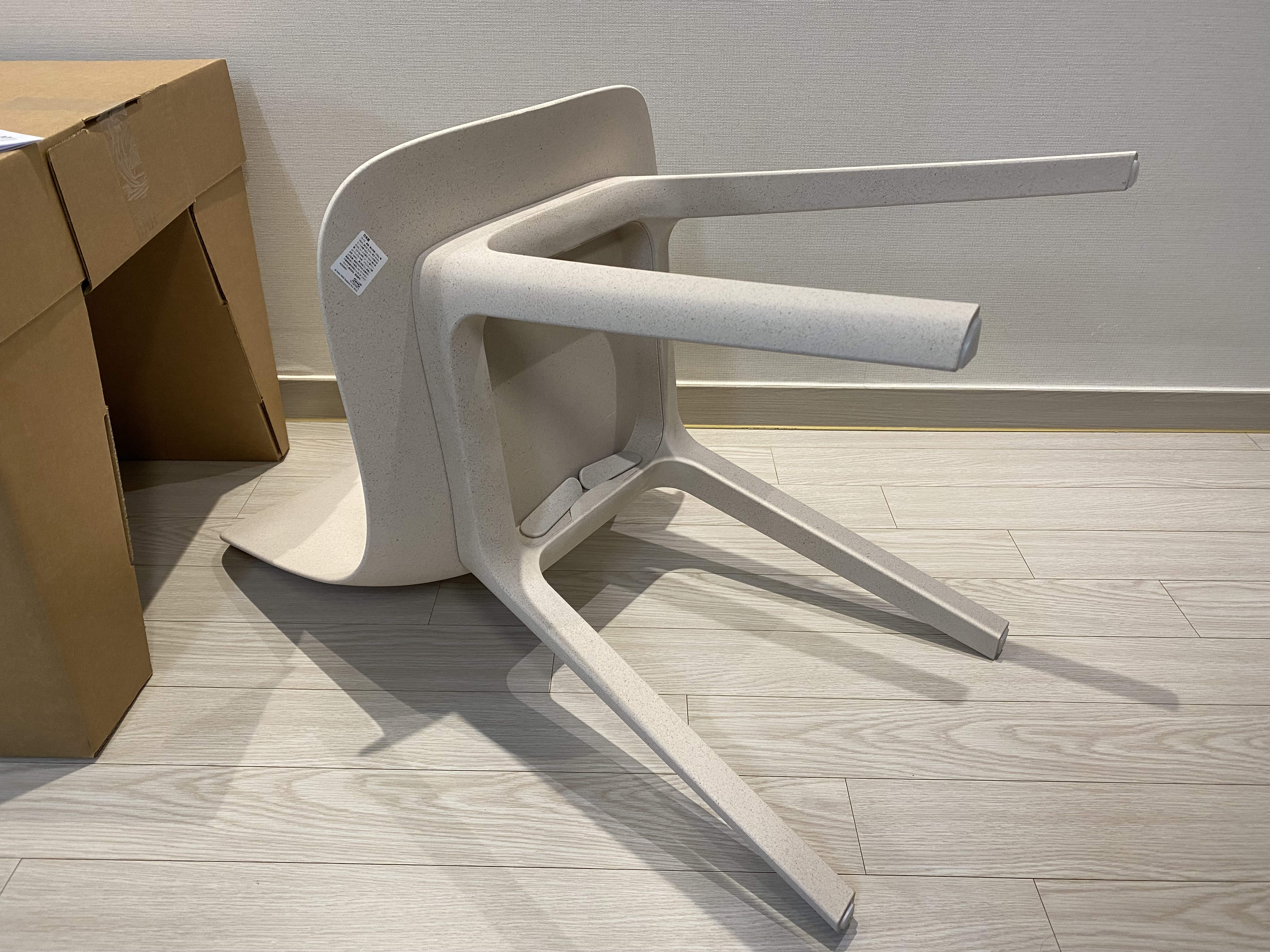 오드게르 의자 상판과 다리 부분을 연결하고 고정핀으로 눌러 고정을 하면 조립은 끝입니다. 공구 같은 건 필요 없습니다.