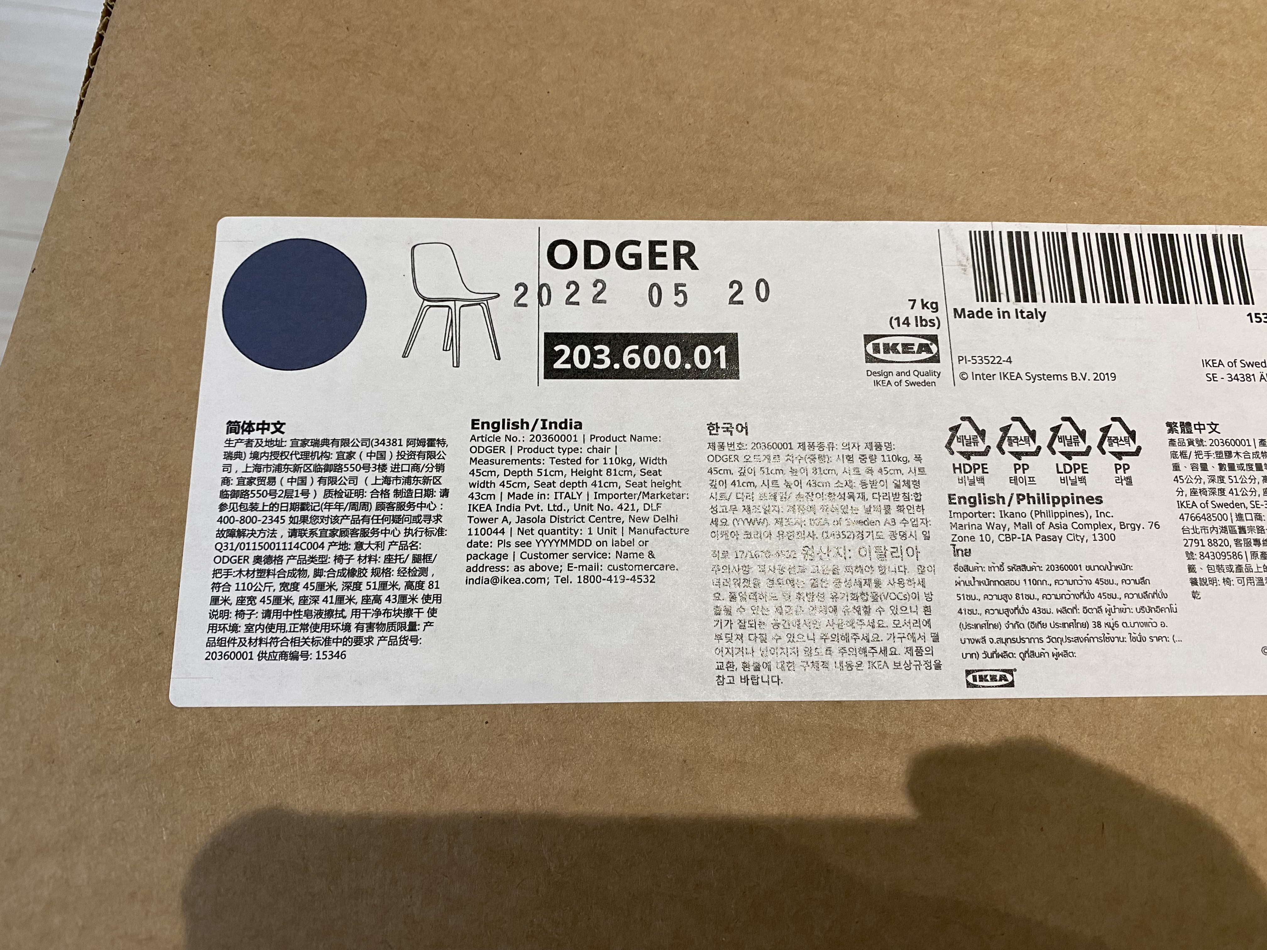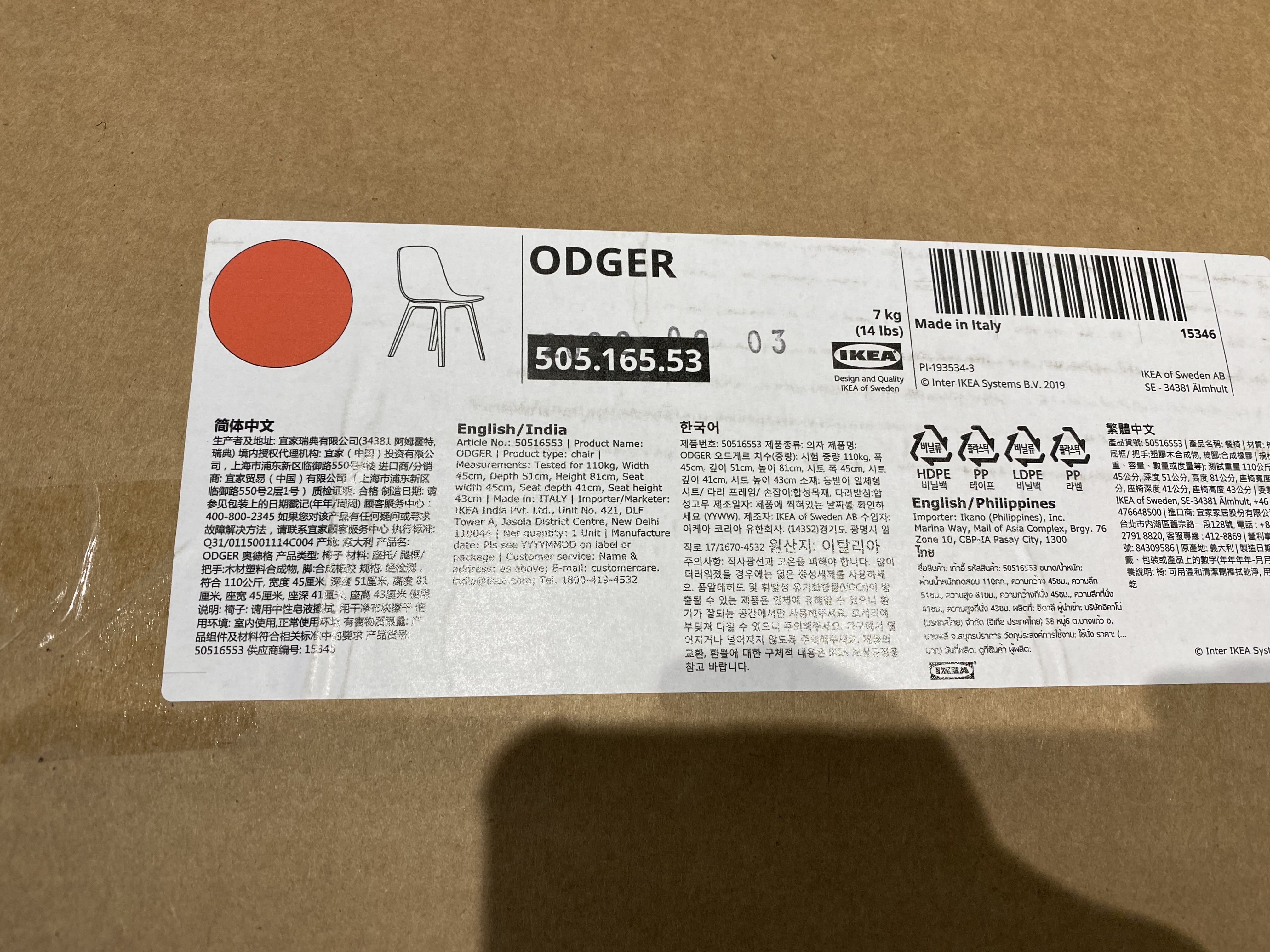 이케아 IKEA ODGER 오드게르 의자의 박스 포장이 이렇게 생겼습니다. 오드게르 의자 1개당 가격은 109,000원으로 저렴하지는 않습니다. 예전에 89,000원 정도 할 때 구매를 할걸 후회 중입니다. 역시 이런 공산품은 필요한 순간 빨리 구매를 하는 게 좋은 것 같습니다. 인플레이션으로 정말 가격이 많이 올랐습니다. 가끔 할인도 하는데 할인을 기다리다 가격이 오를 수 있으니 조심하세요. ㅎㅎ