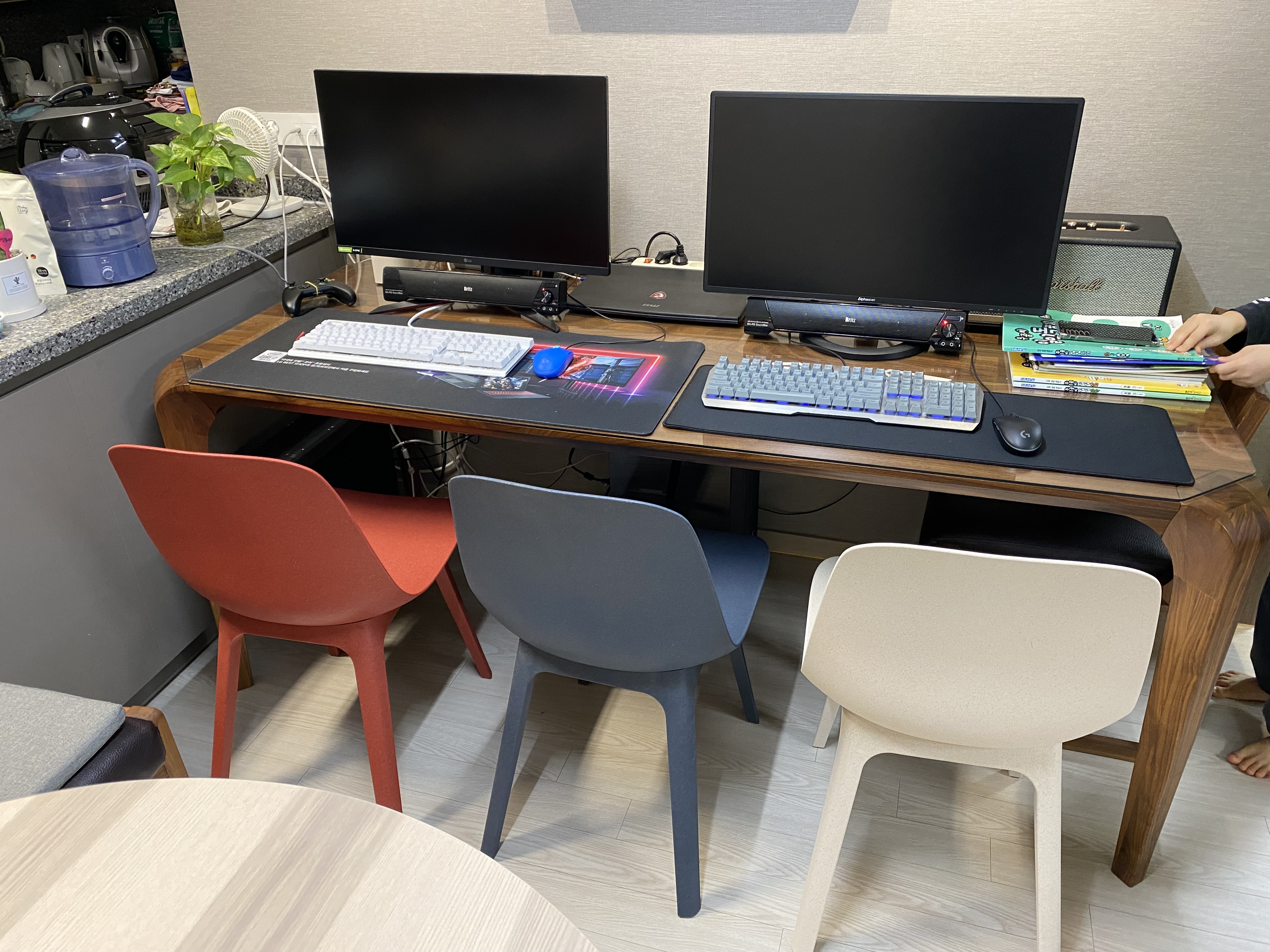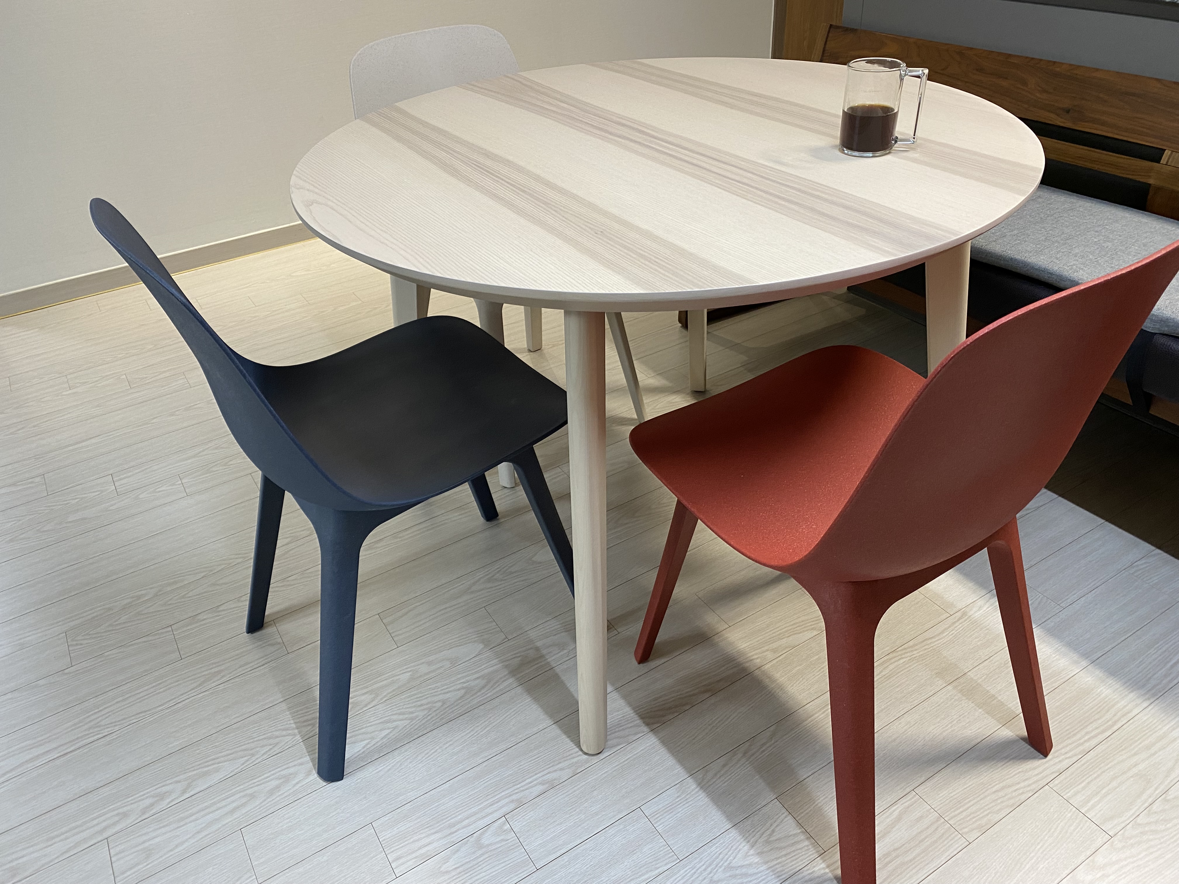 이케아 리사보 원형 테이블에 오드게르 의자를 비치한 모습입니다. 리사보 의자도 있지만 이 오드게르도 디자인이 무난해서 리사보와 잘 어울립니다. 의자에 따로 쿠션이 없어서 엉덩이 부분이 딱딱하다고 느껴지면 방석을 사용하세요. 저는 딱딱한 걸 좋아해서 그냥 씁니다.