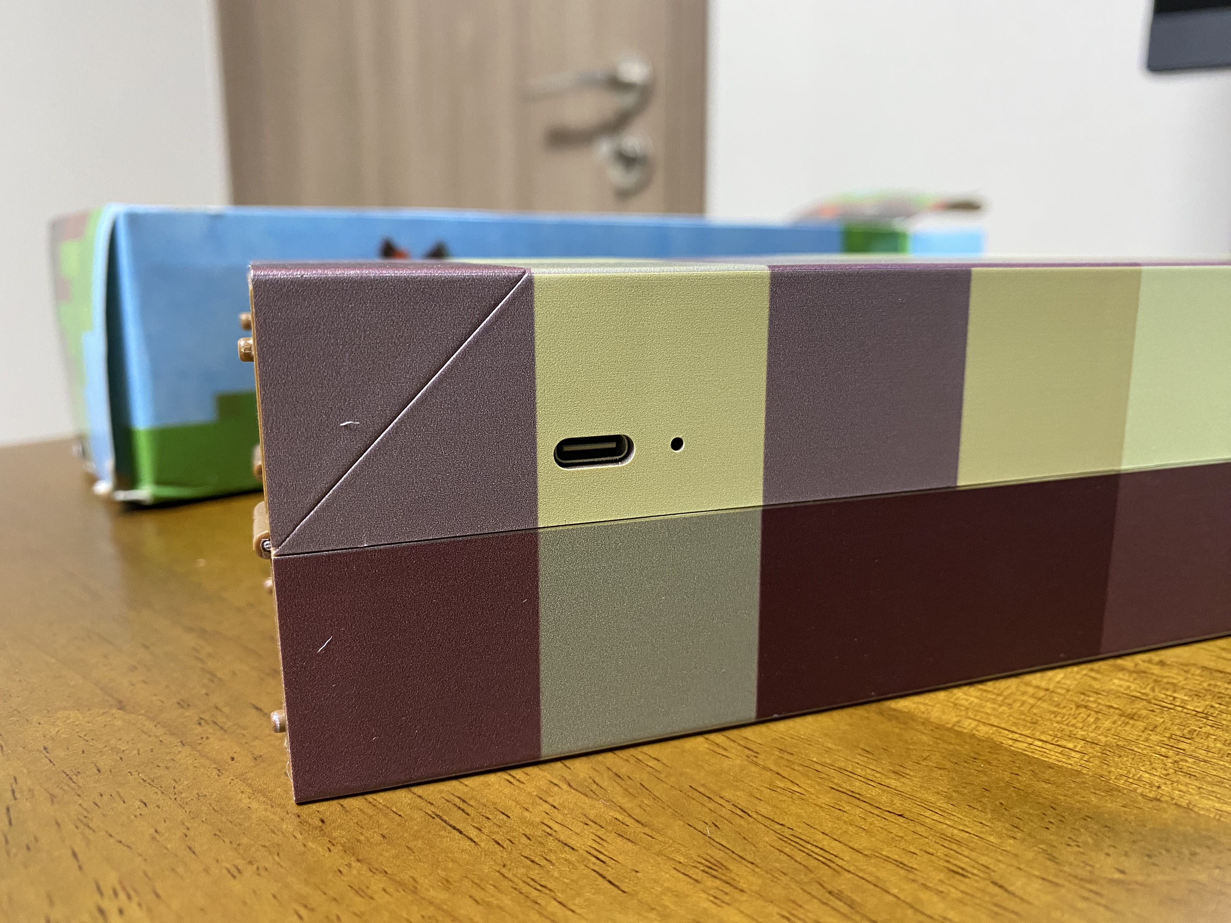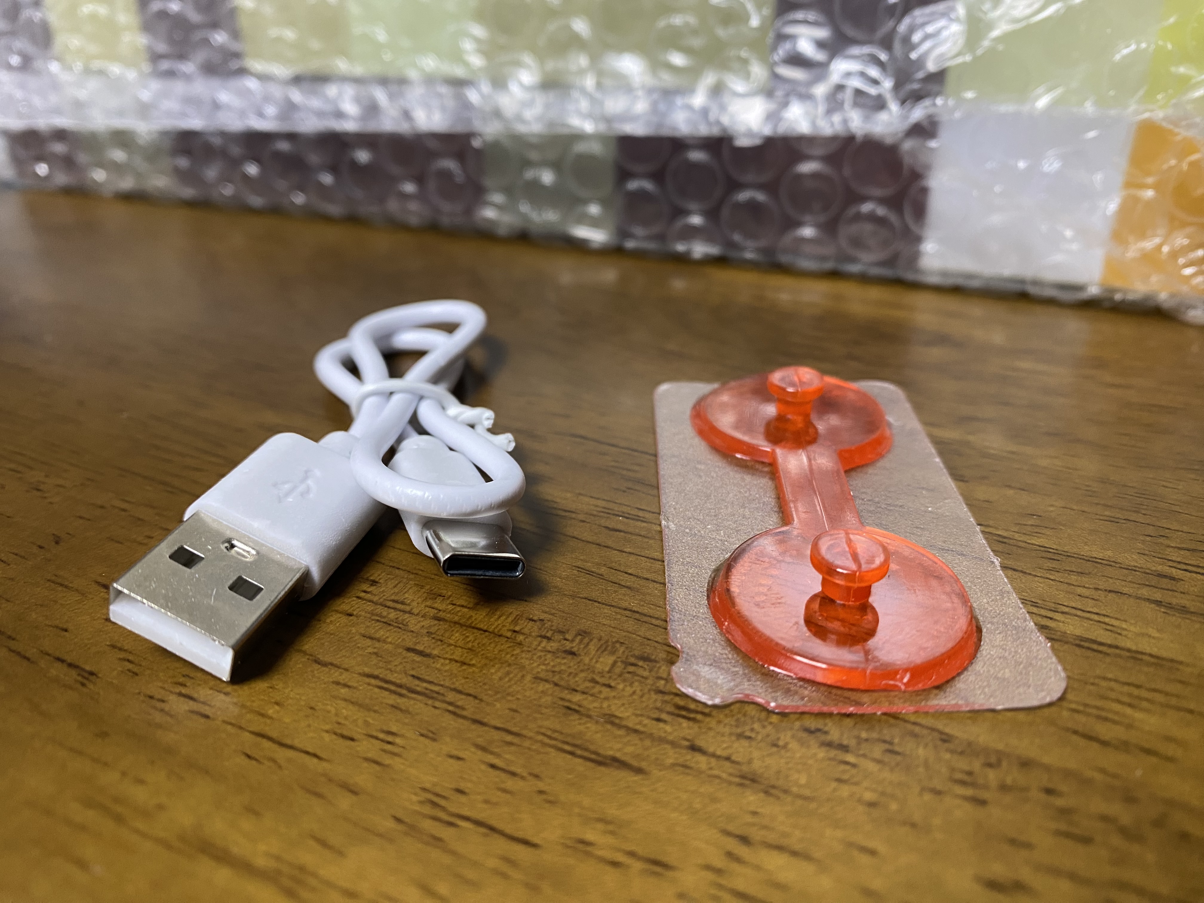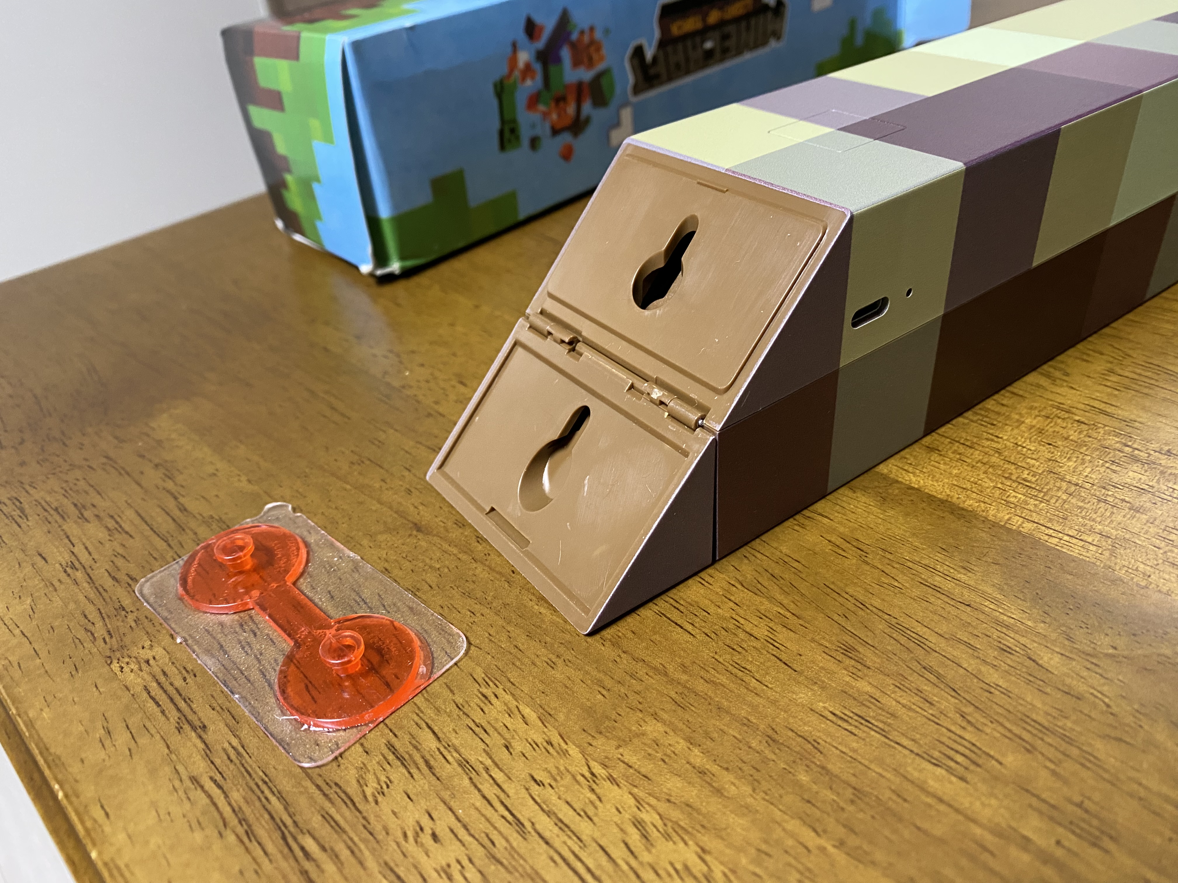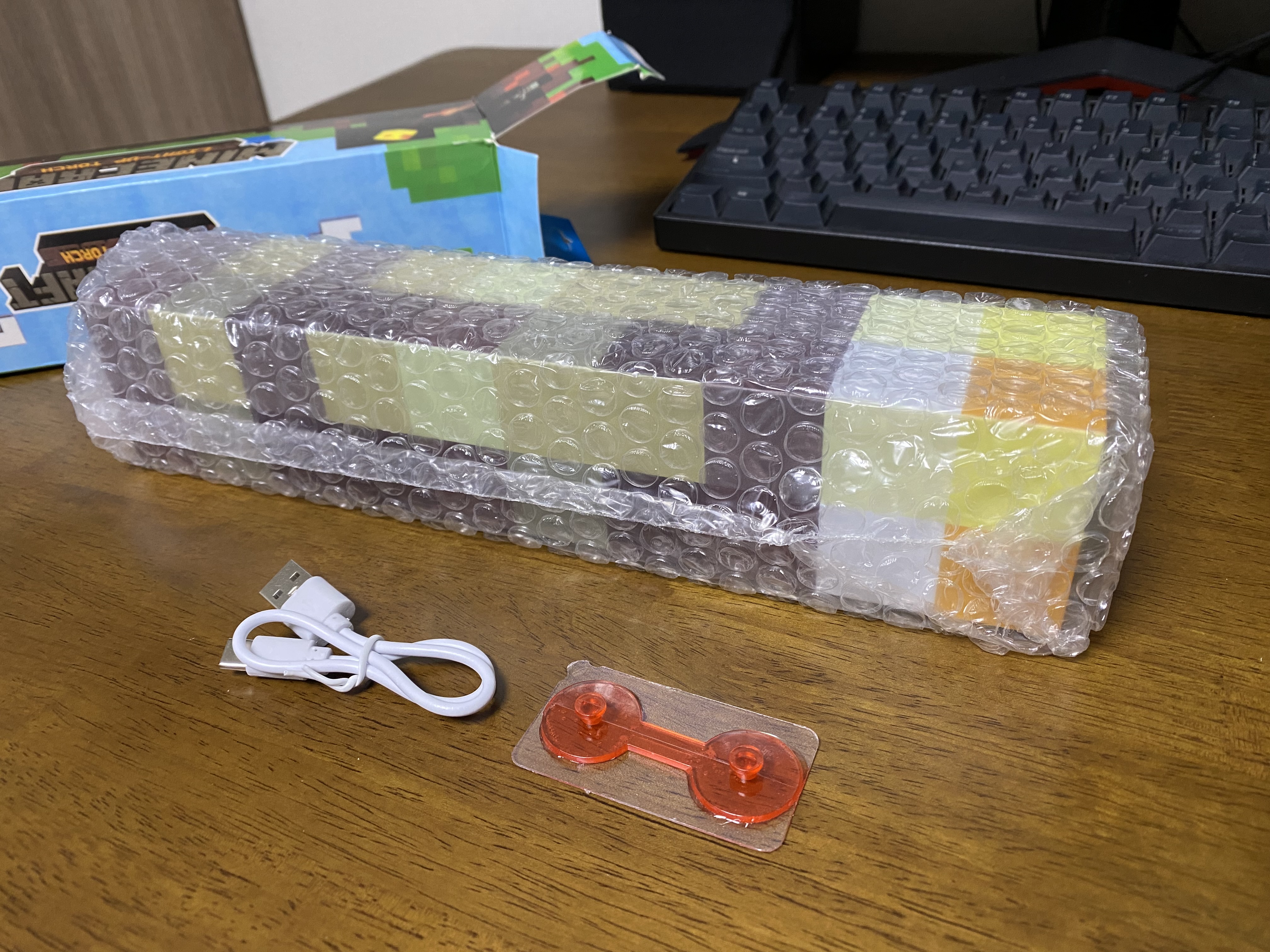 알리 마인크래프트 횃불 장난감 조명을 개봉한 모습입니다. 마인크래프트 횃불과 충전 케이블, 벽에 부착할 수 있는 부품이 들어있습니다.