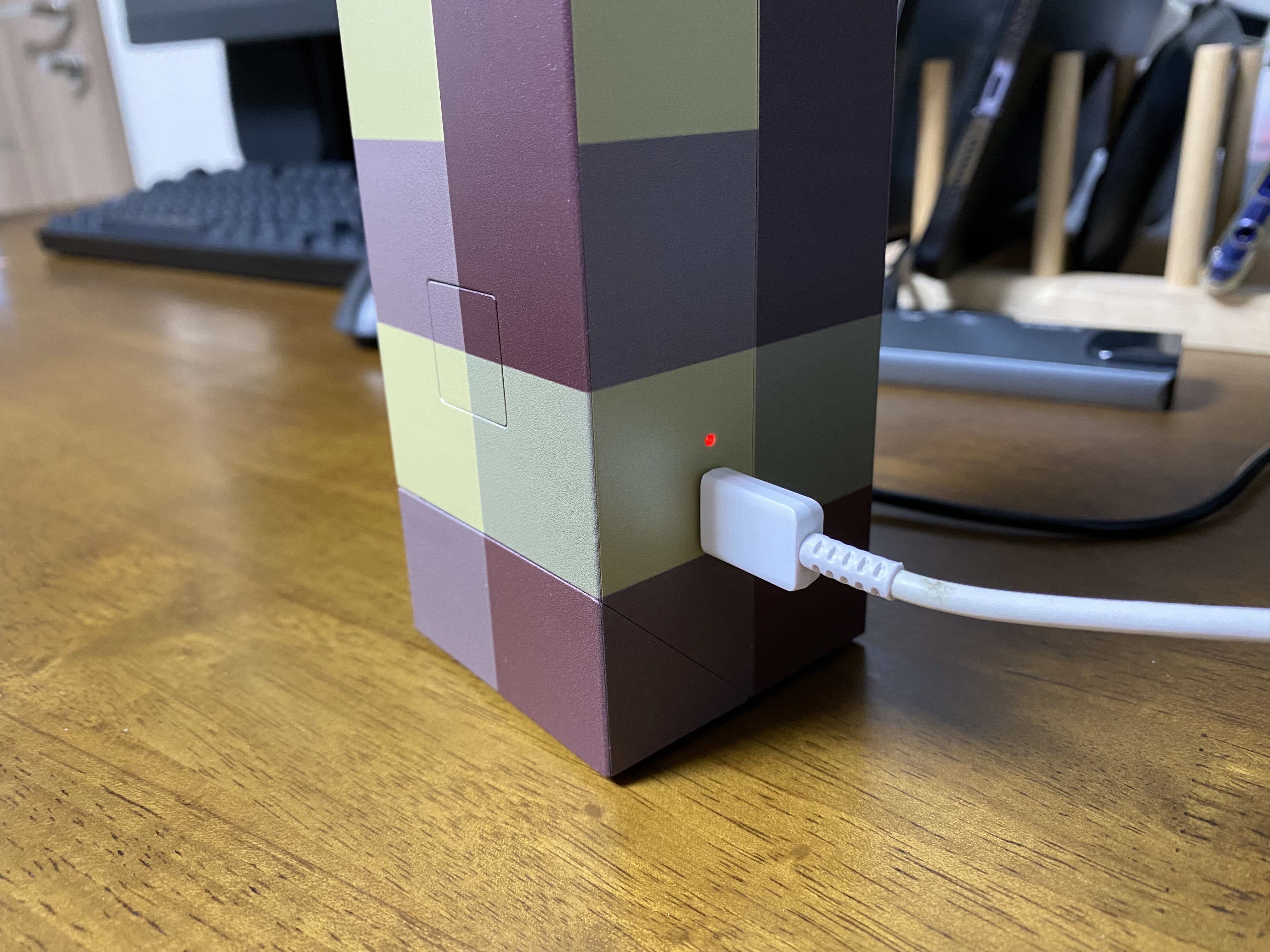마인크래프트 횃불 조명을 충전하는 모습. 충전 중일 때는 빨간불이 완충되면 파란불이 들어옵니다.