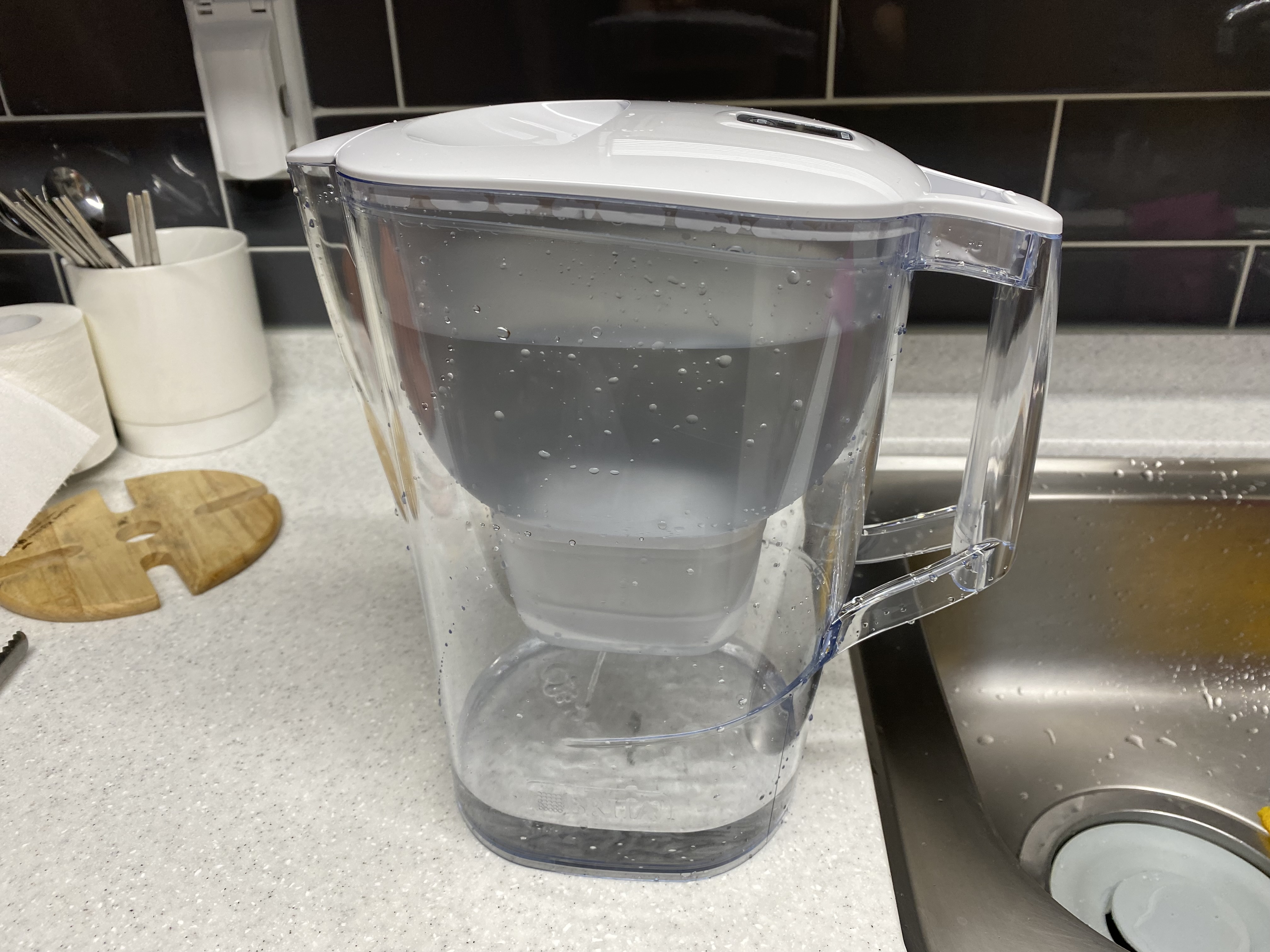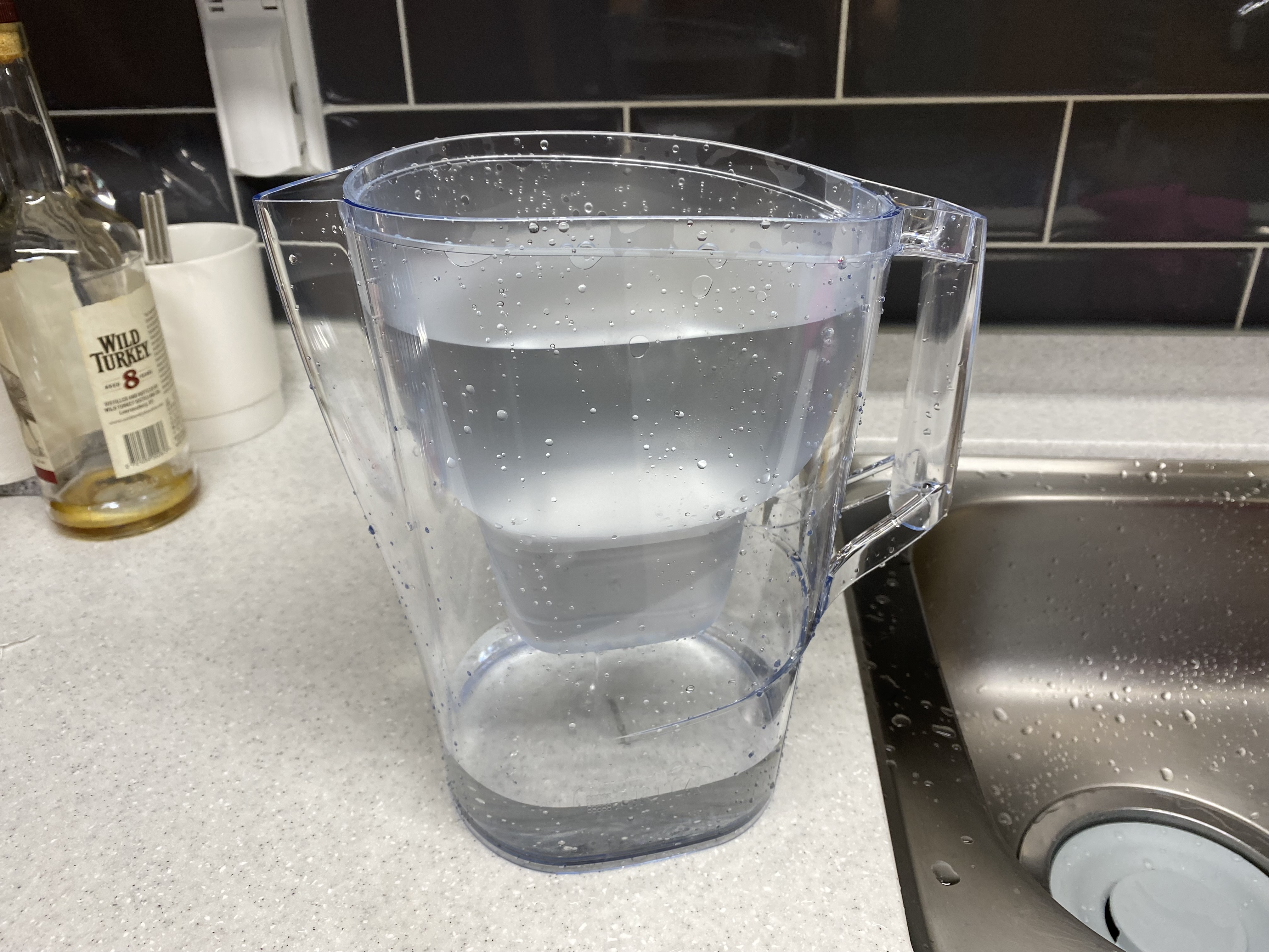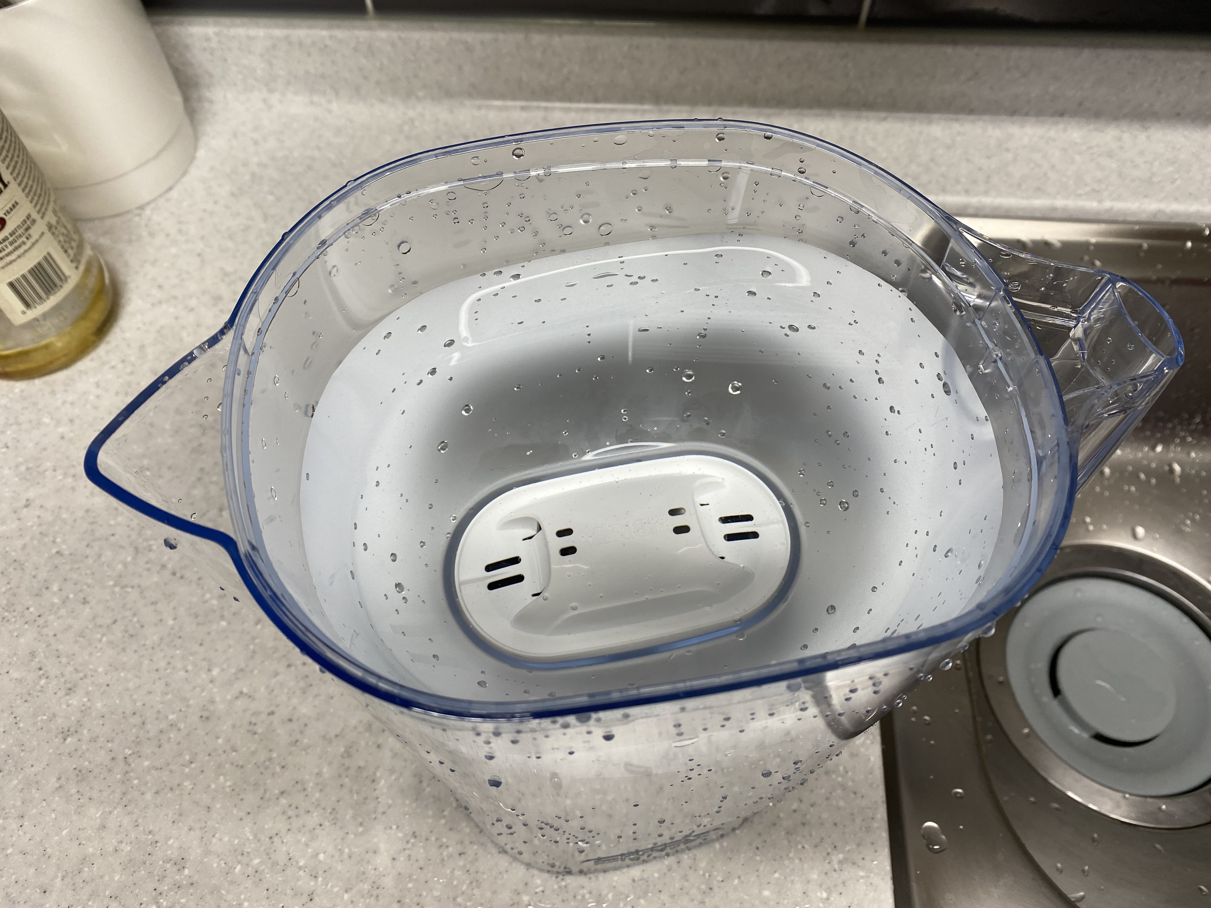 브리타 정수용기를 세척하고, 필터를 물속에서 충분히 흔든 후 장착하여 수돗물까지 넣은 모습입니다.