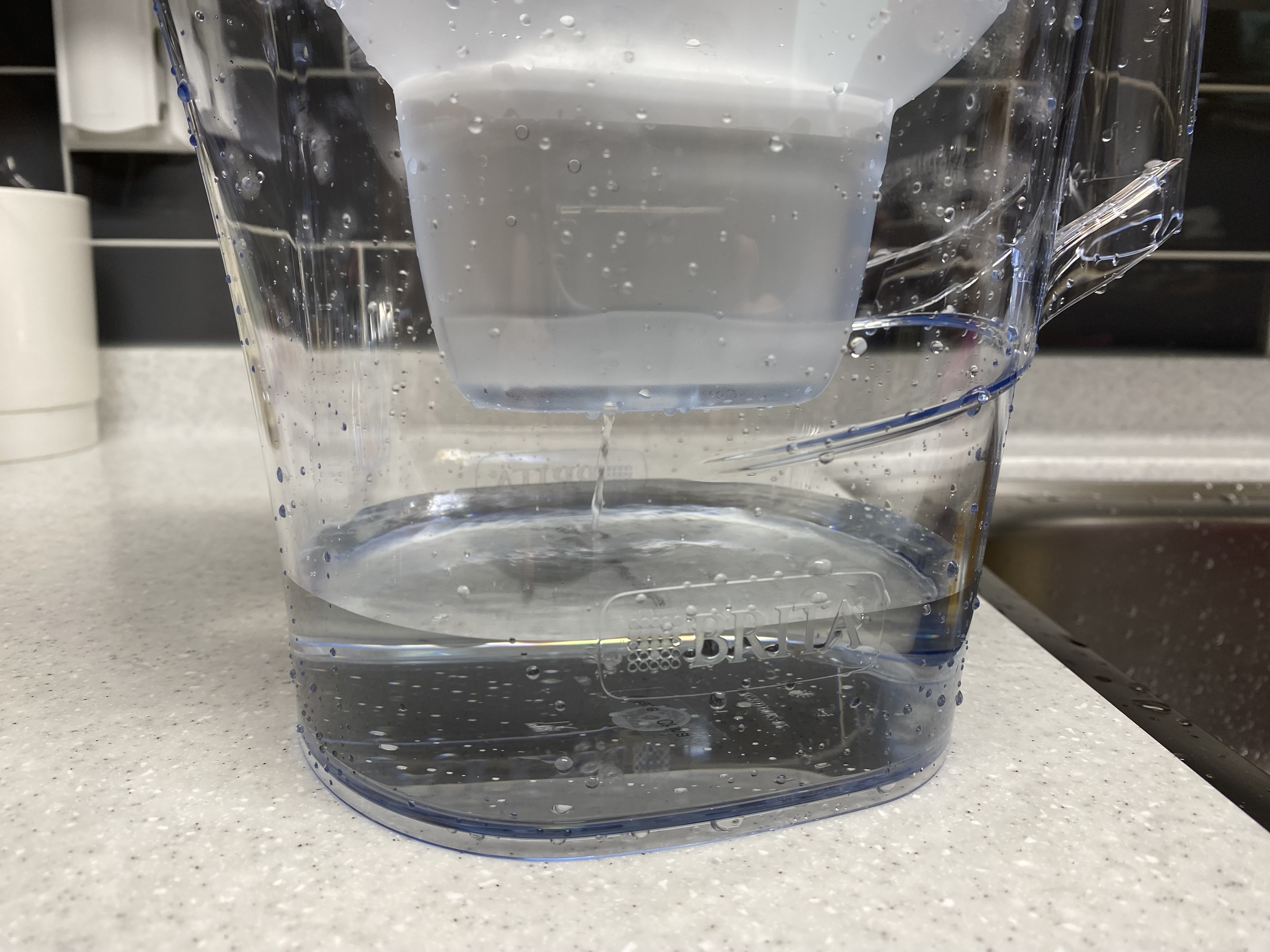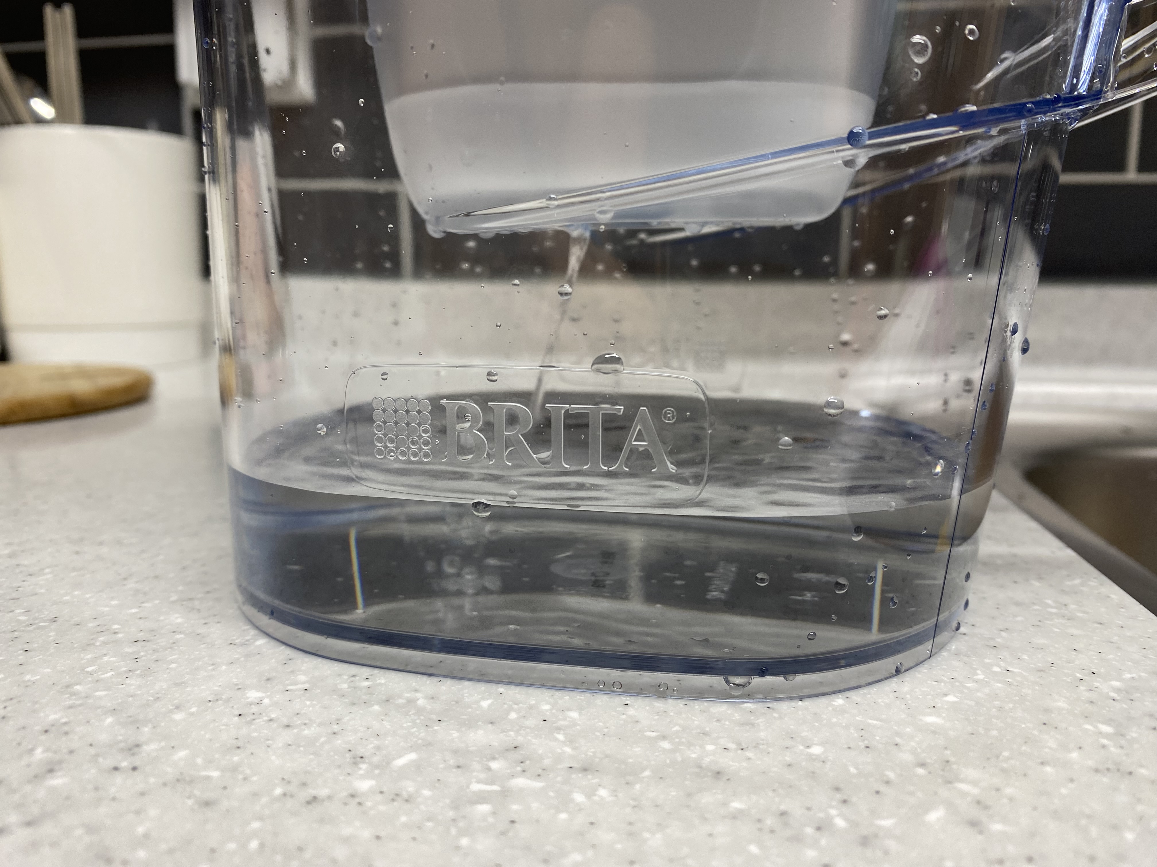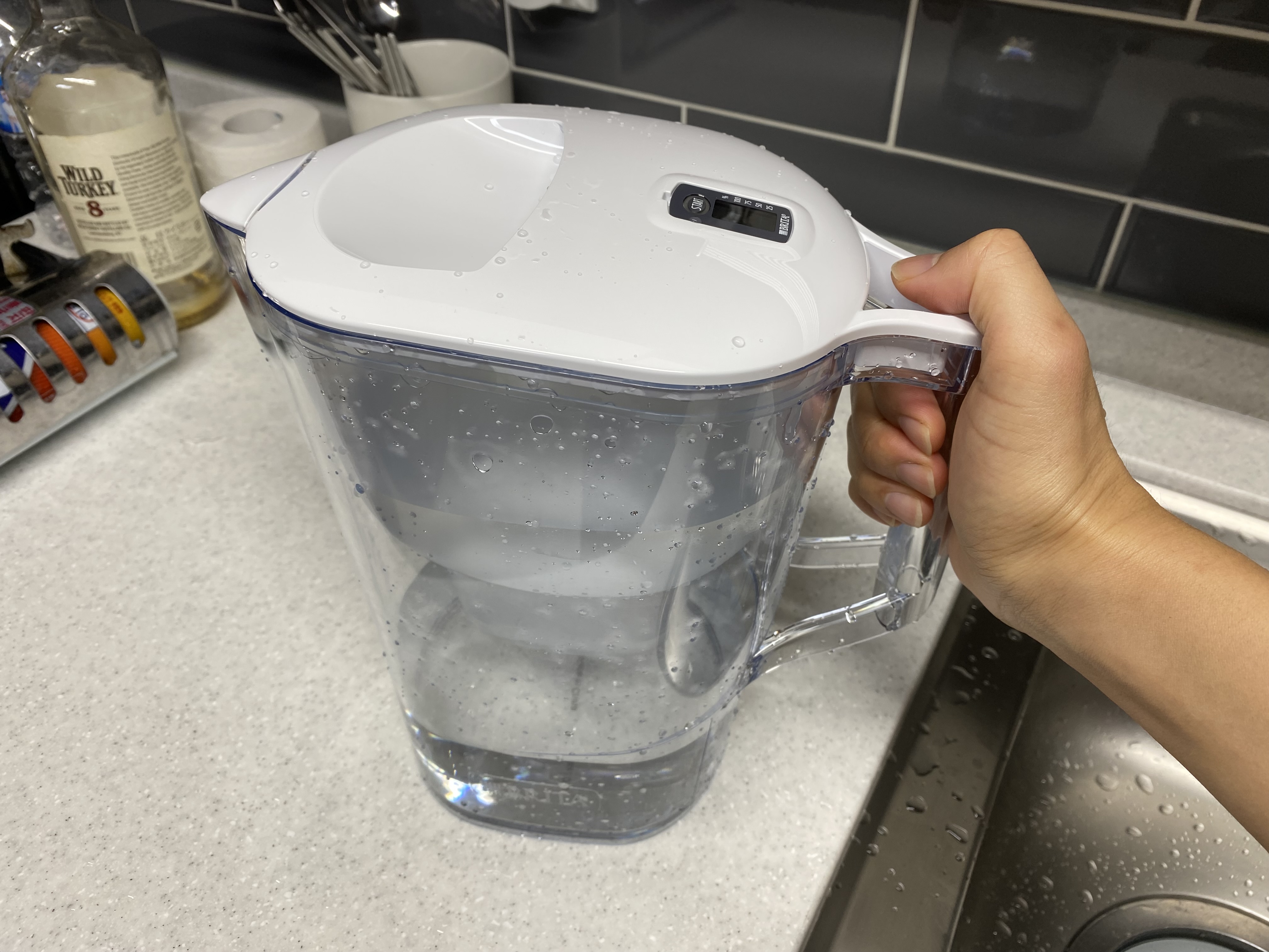 브리타 정수용기를 세척하고, 필터를 물속에서 충분히 흔든 후 장착하여 수돗물까지 넣은 모습입니다.