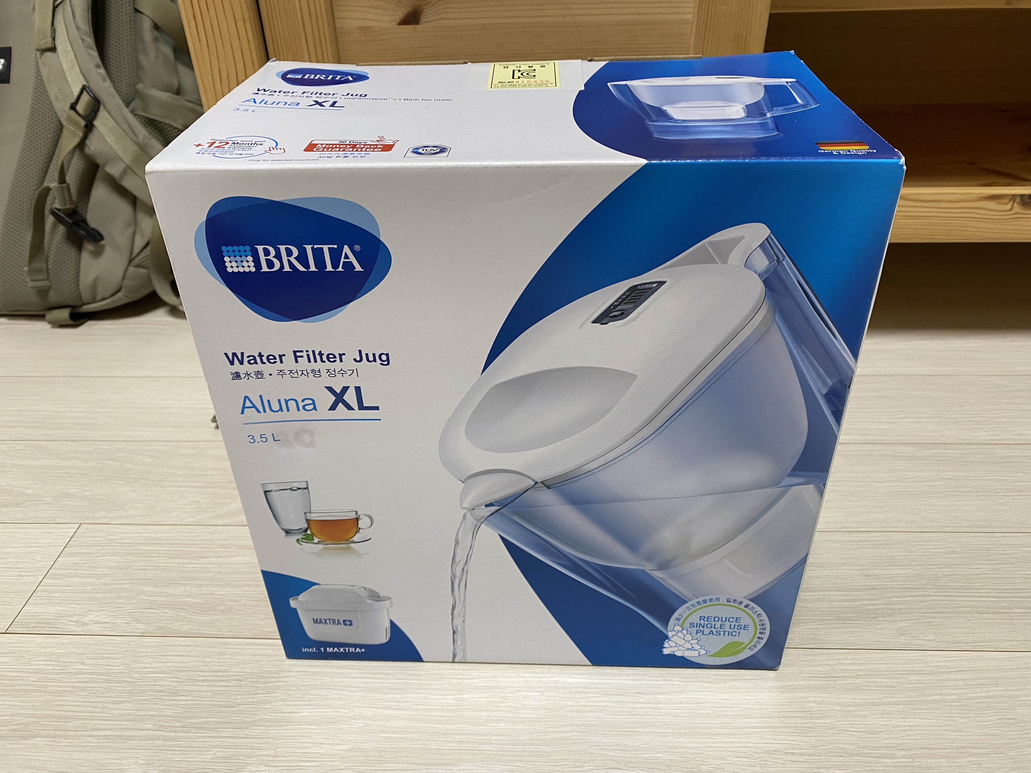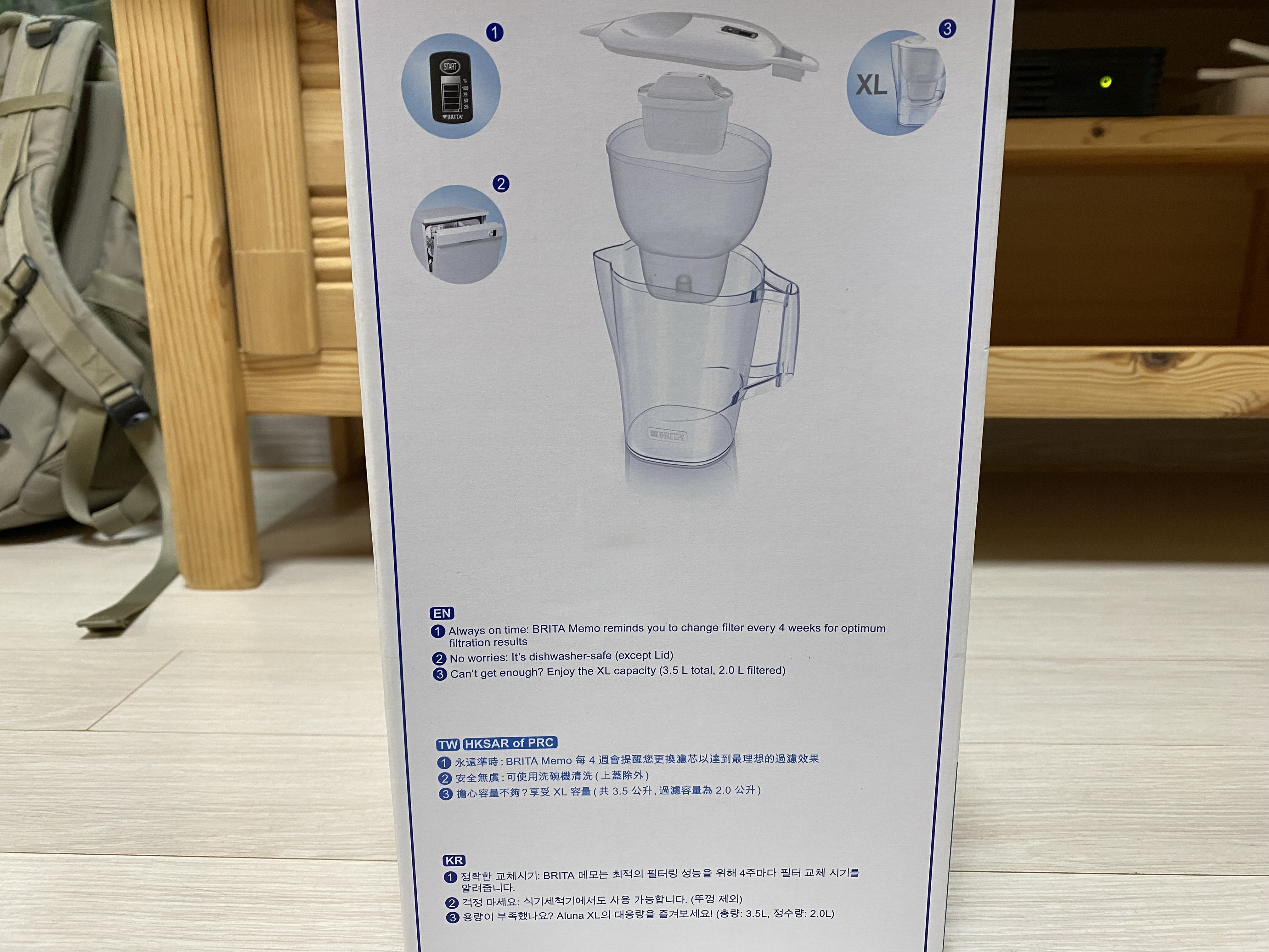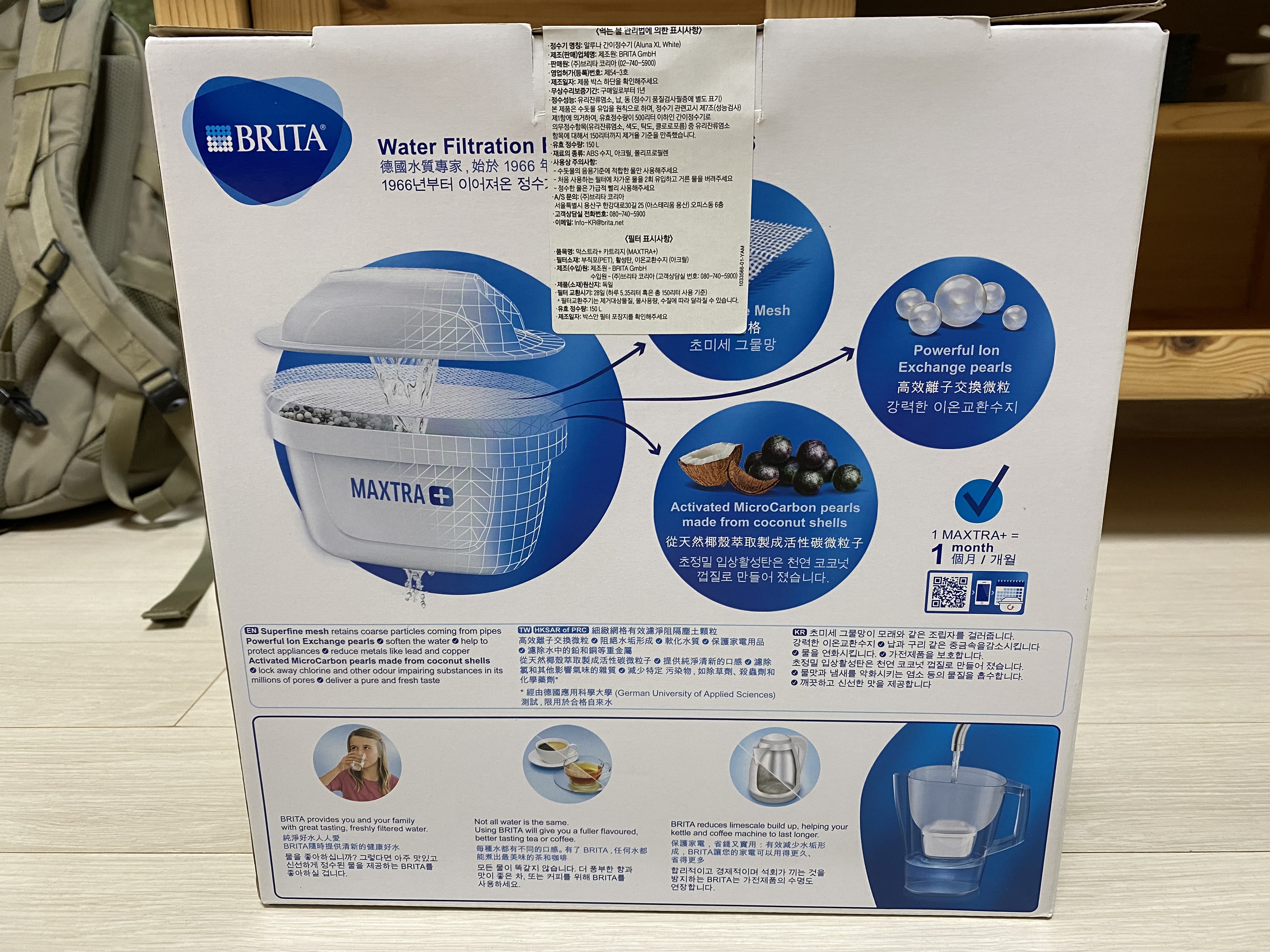 이 브리타 정수기의 정확한 명칭은 브리타 알루나 간이정수기(Aluna XL)입니다. 박스에 적힌 브리타 정수기의 특징은 아래와 같습니다.