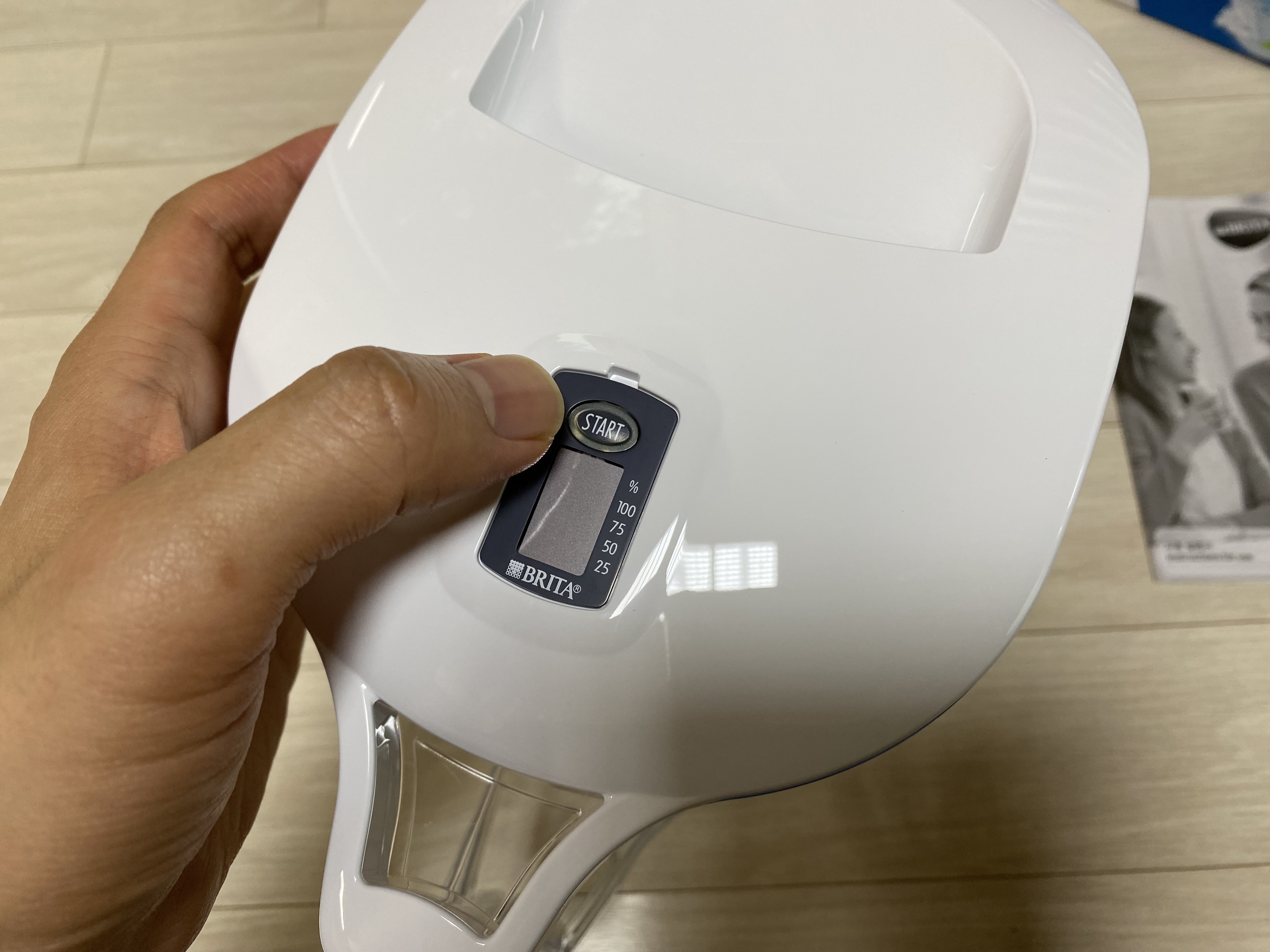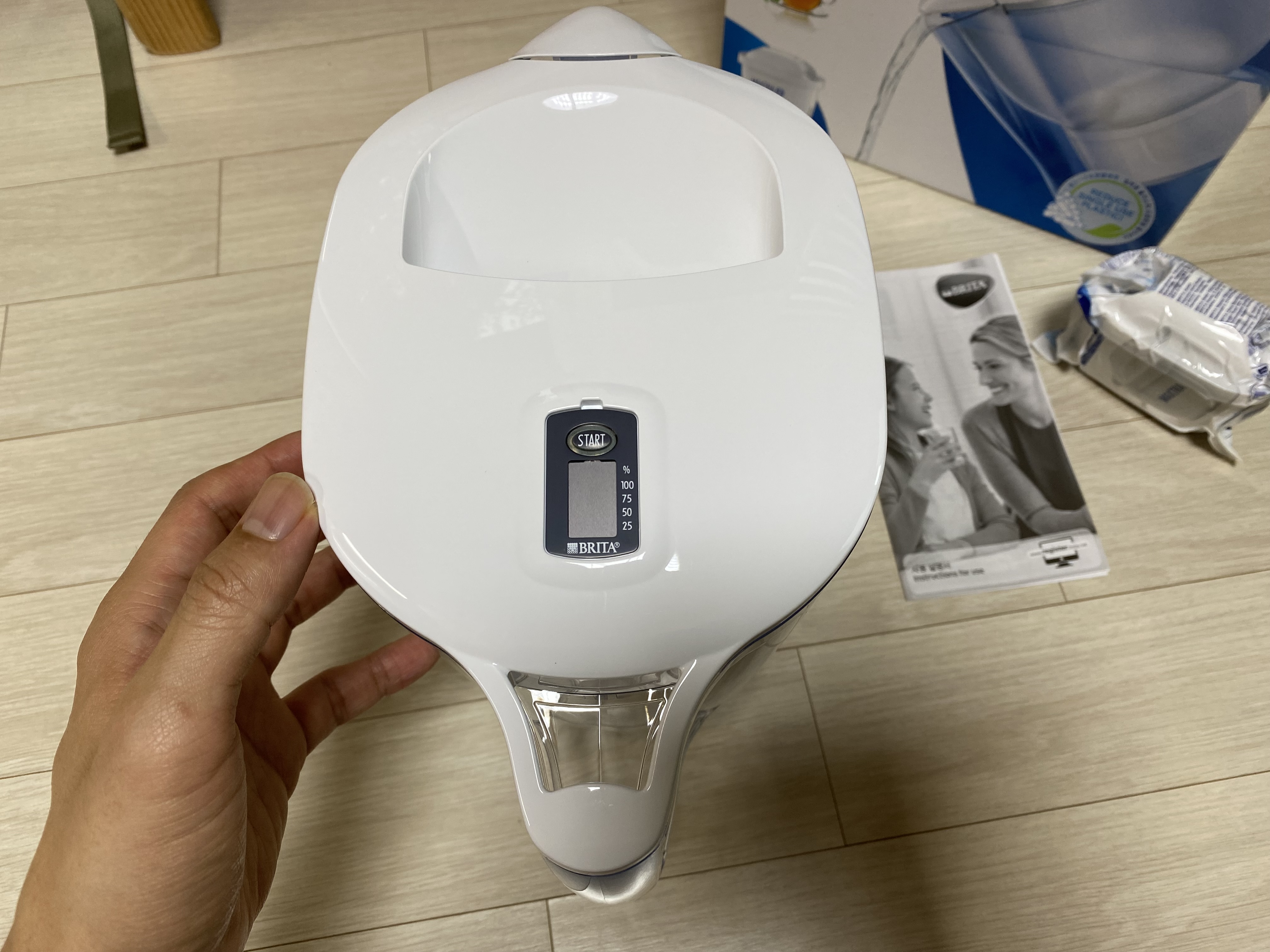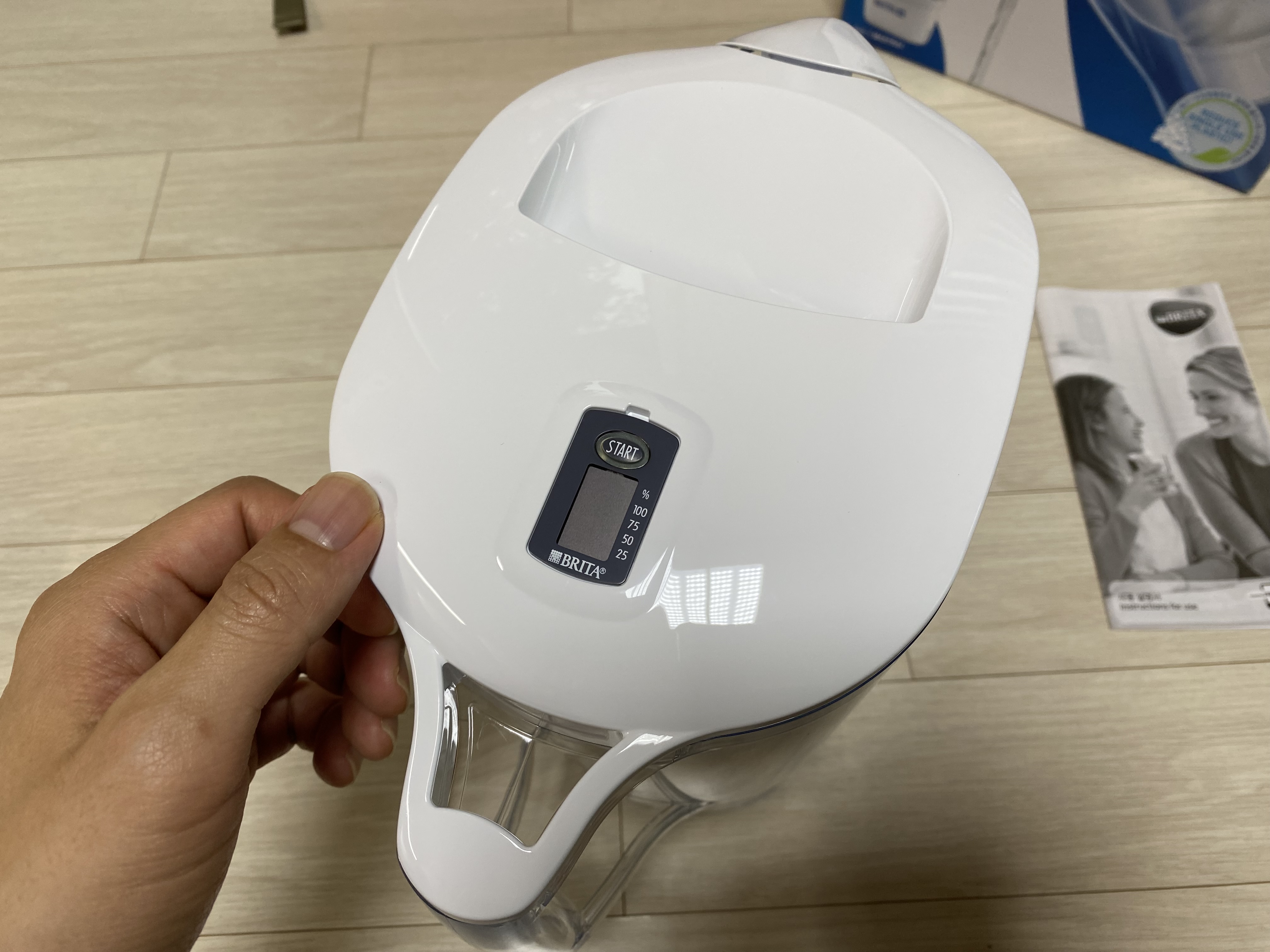 브리타 정수기 뚜껑. 위쪽에 있는 액정으로 필터 교체 시기를 알 수 있습니다.