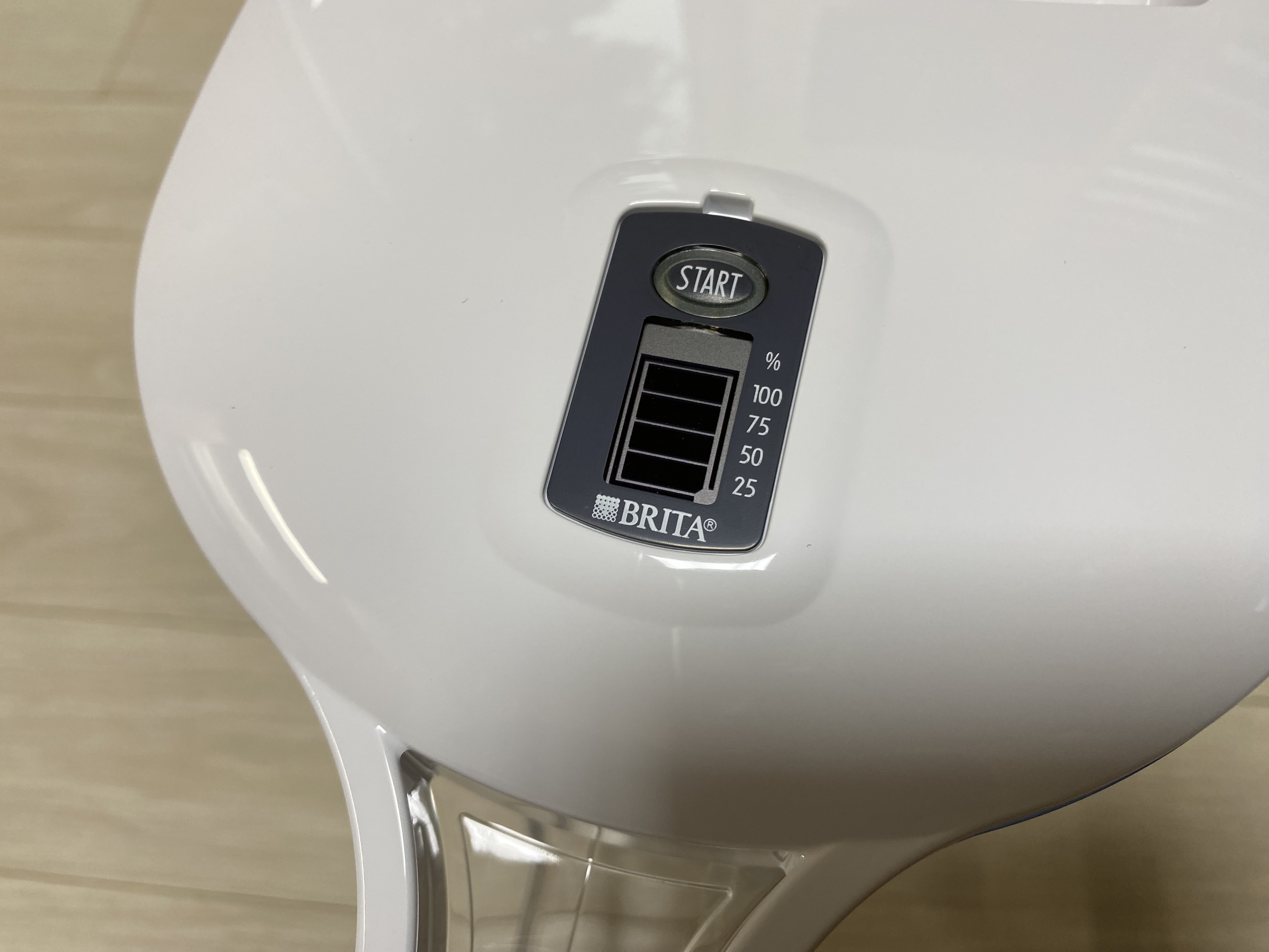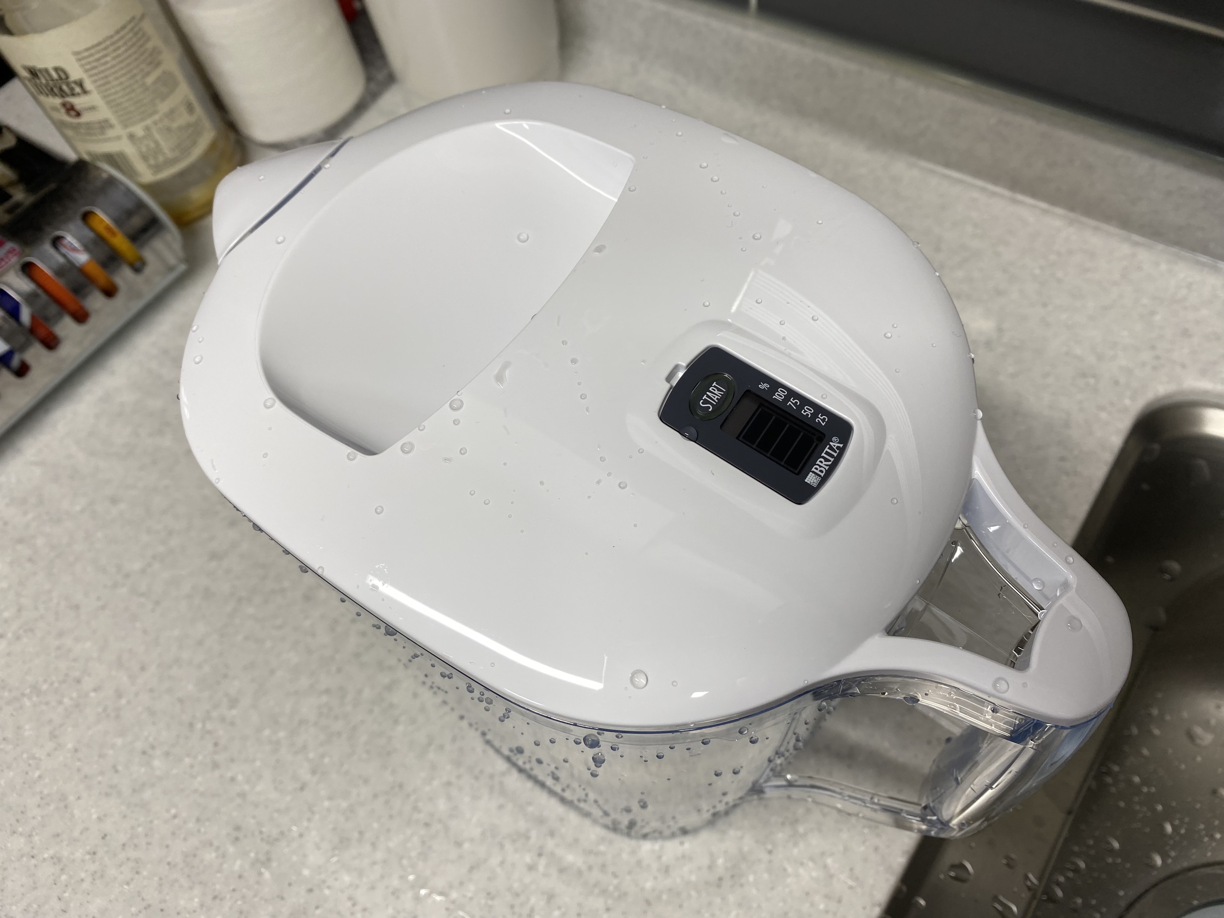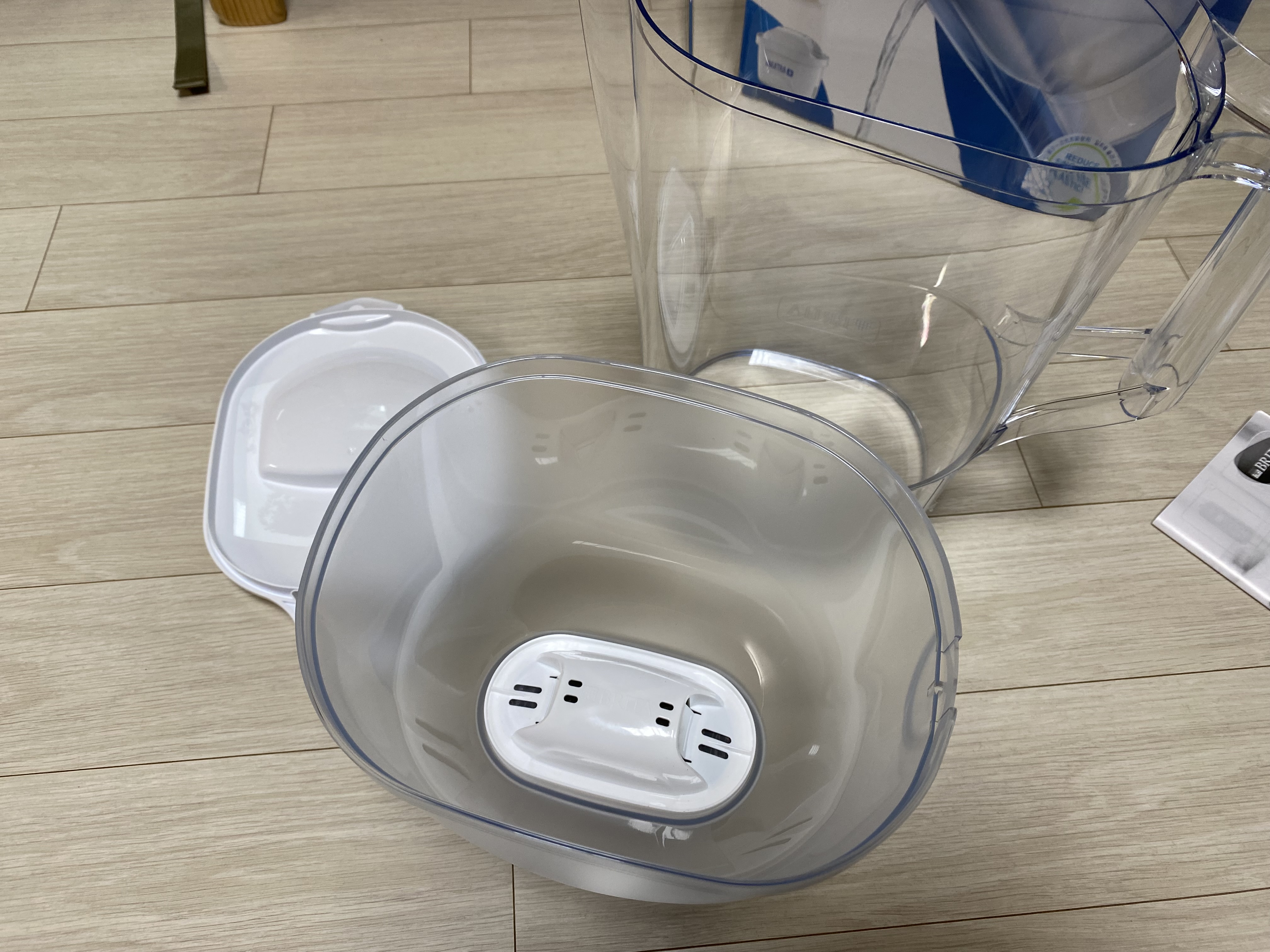 브리타 정수기 뚜껑. 위쪽에 있는 액정으로 필터 교체 시기를 알 수 있습니다.
