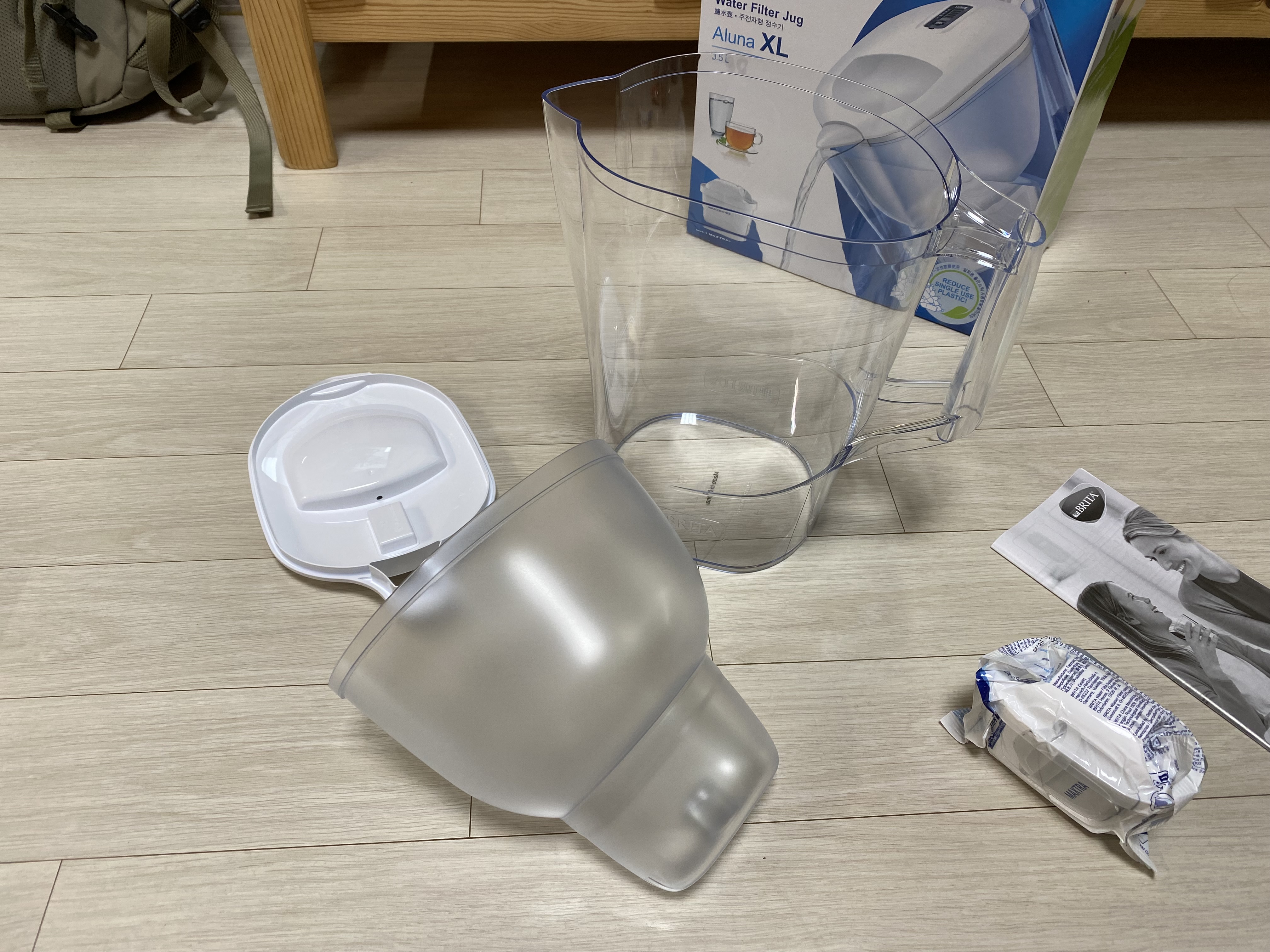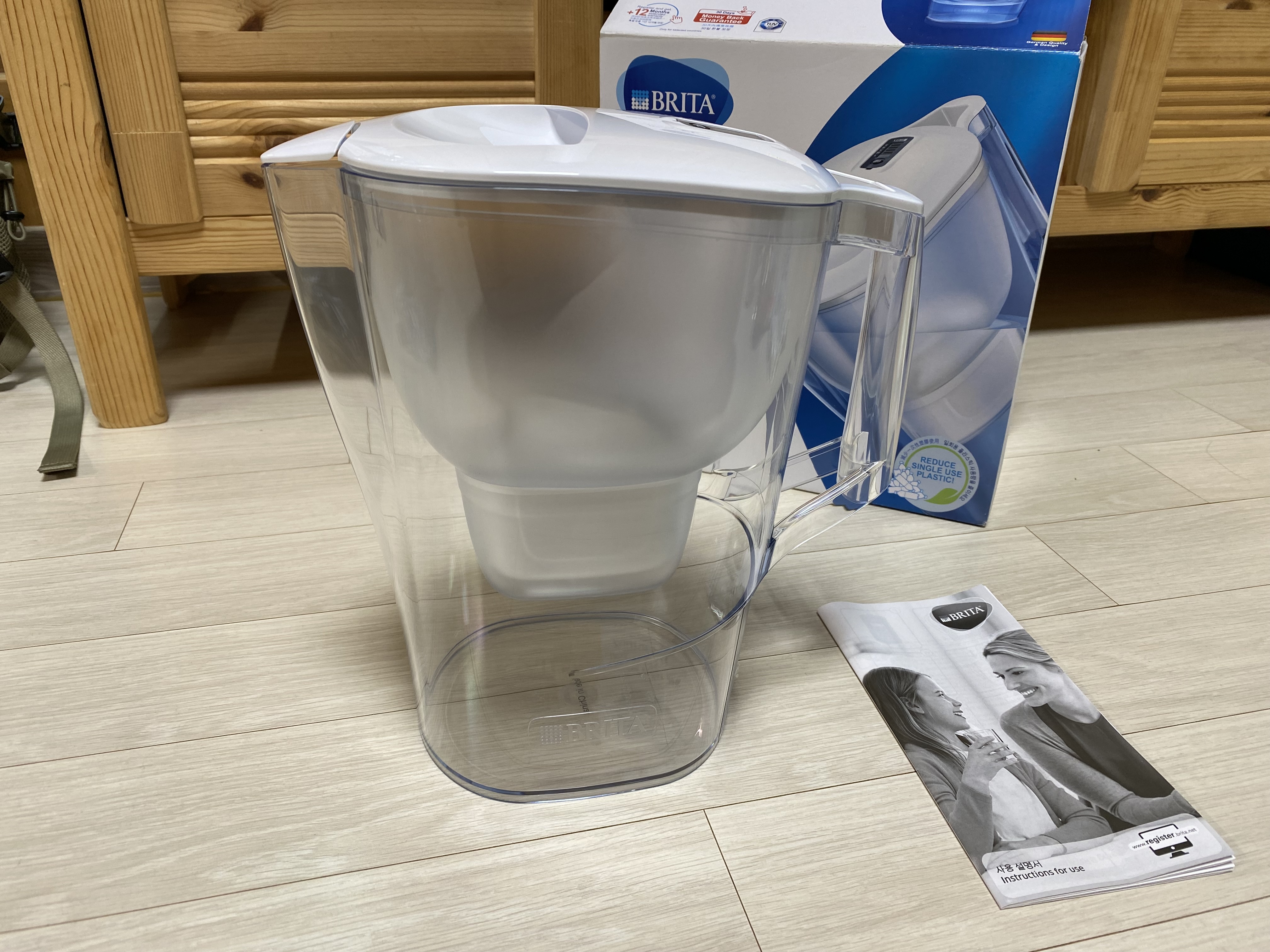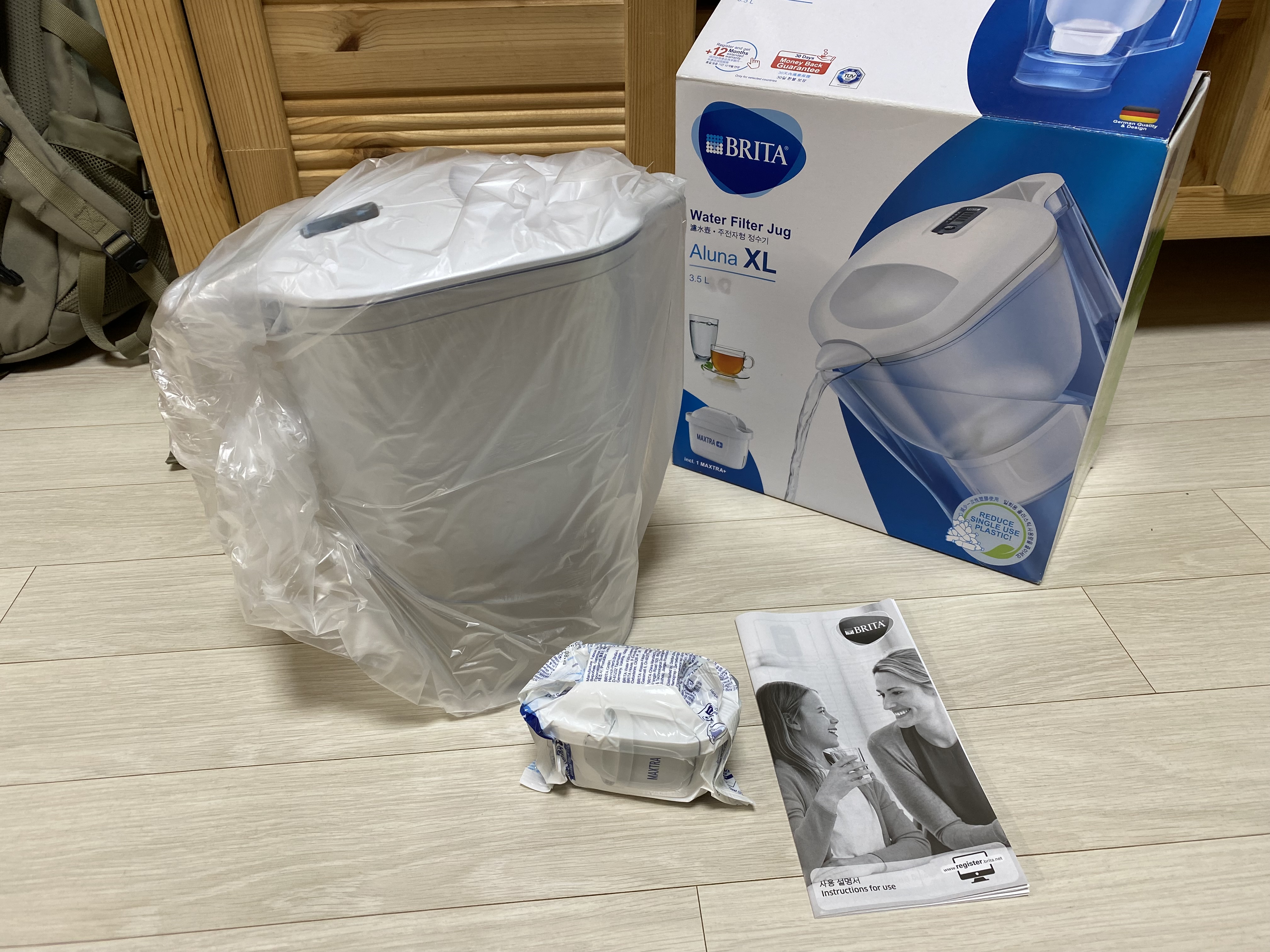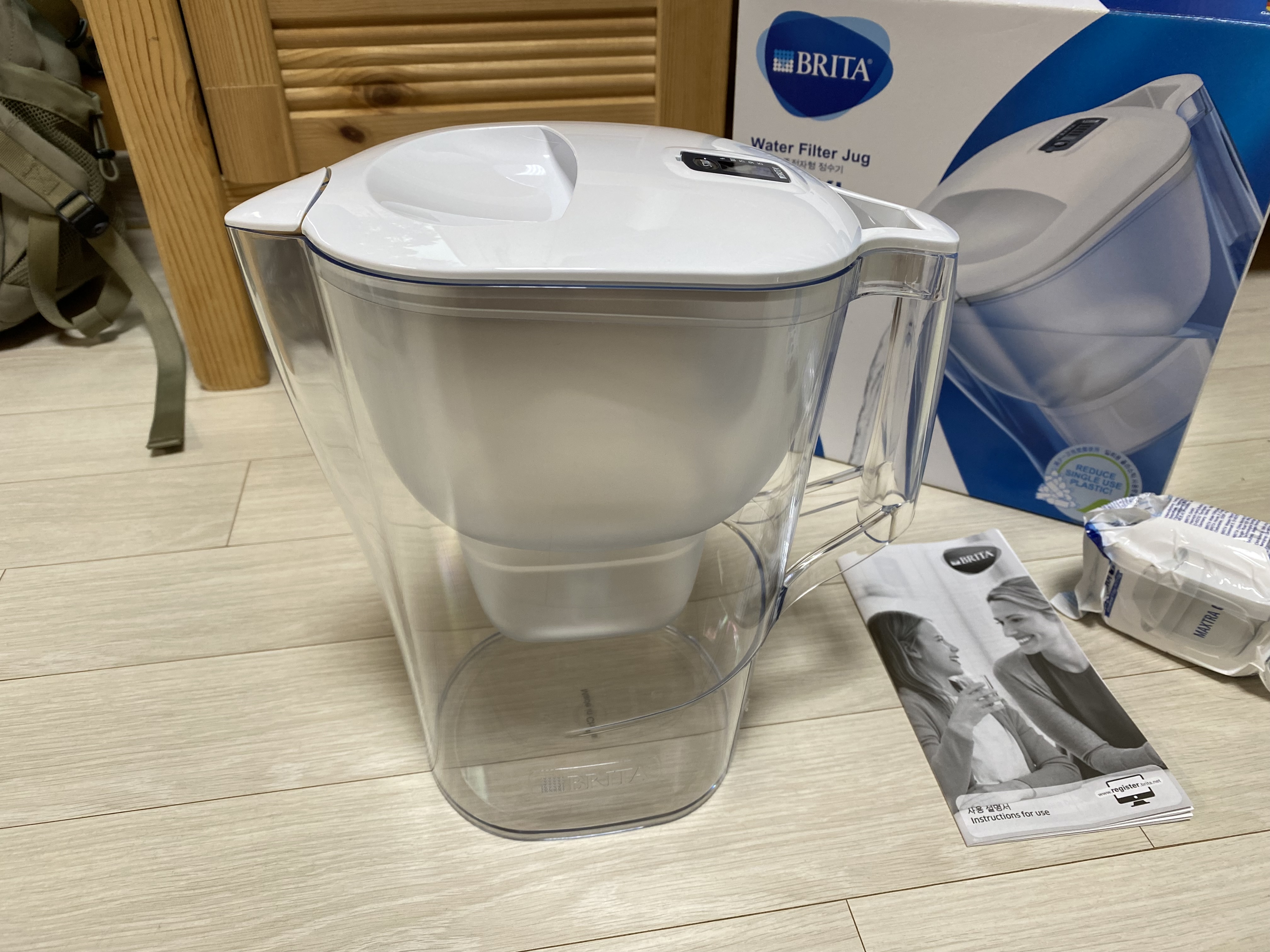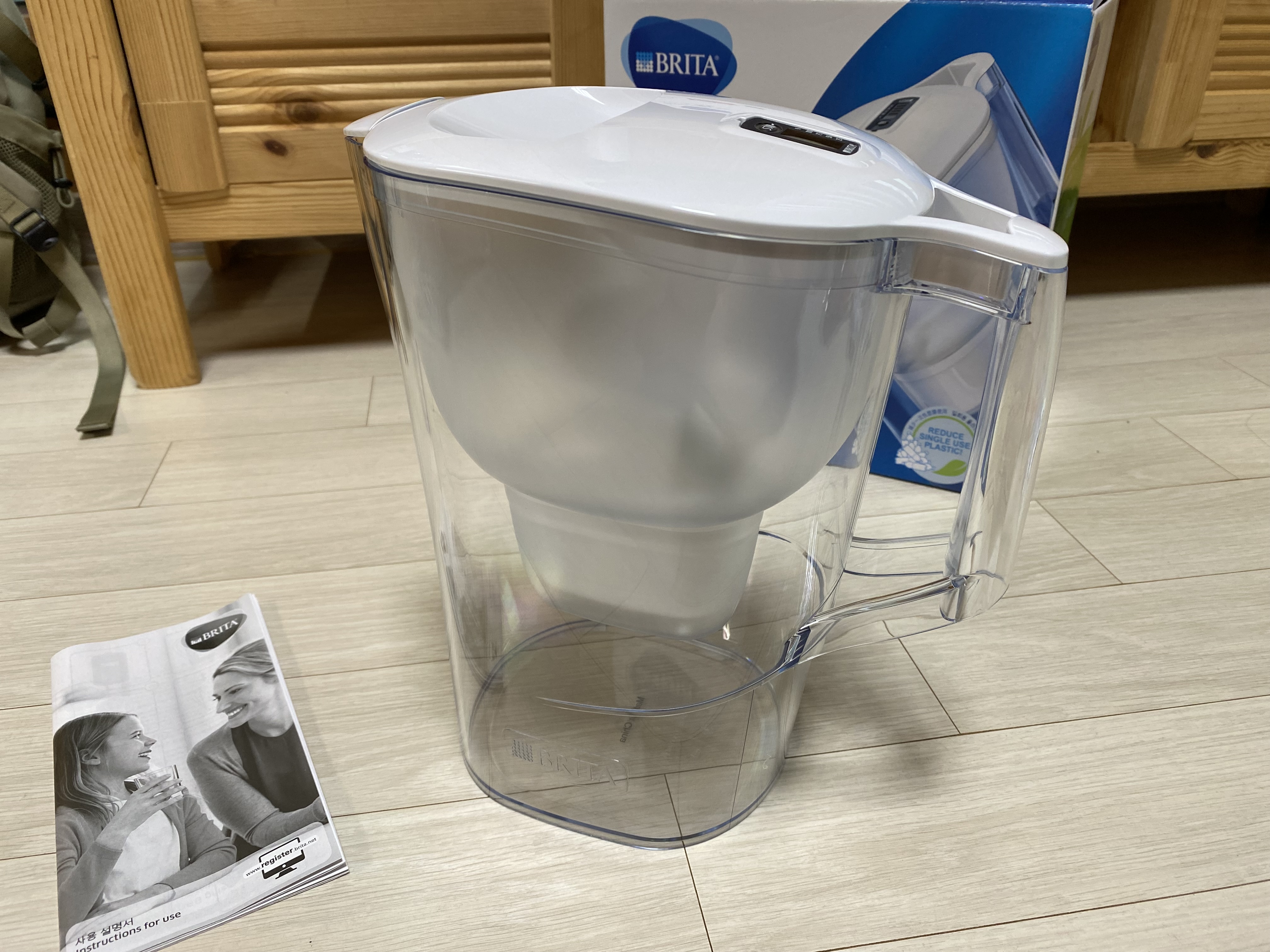 브리타 정수기를 개봉한 모습입니다. 정수기와 필터 1개, 설명서가 들어있습니다. 최근에는 필터 2개 들어있는 구성도 있으니 참고하세요.