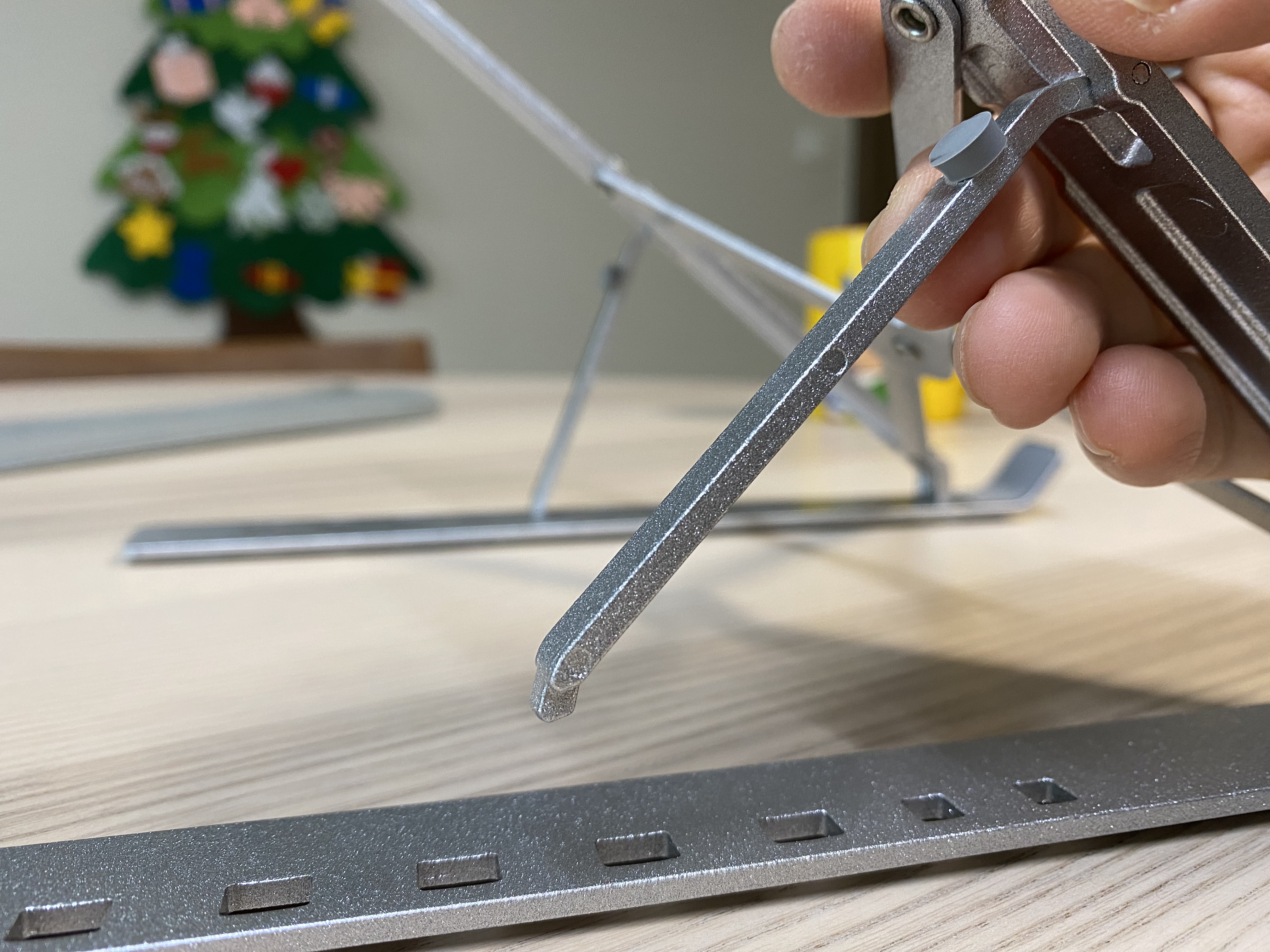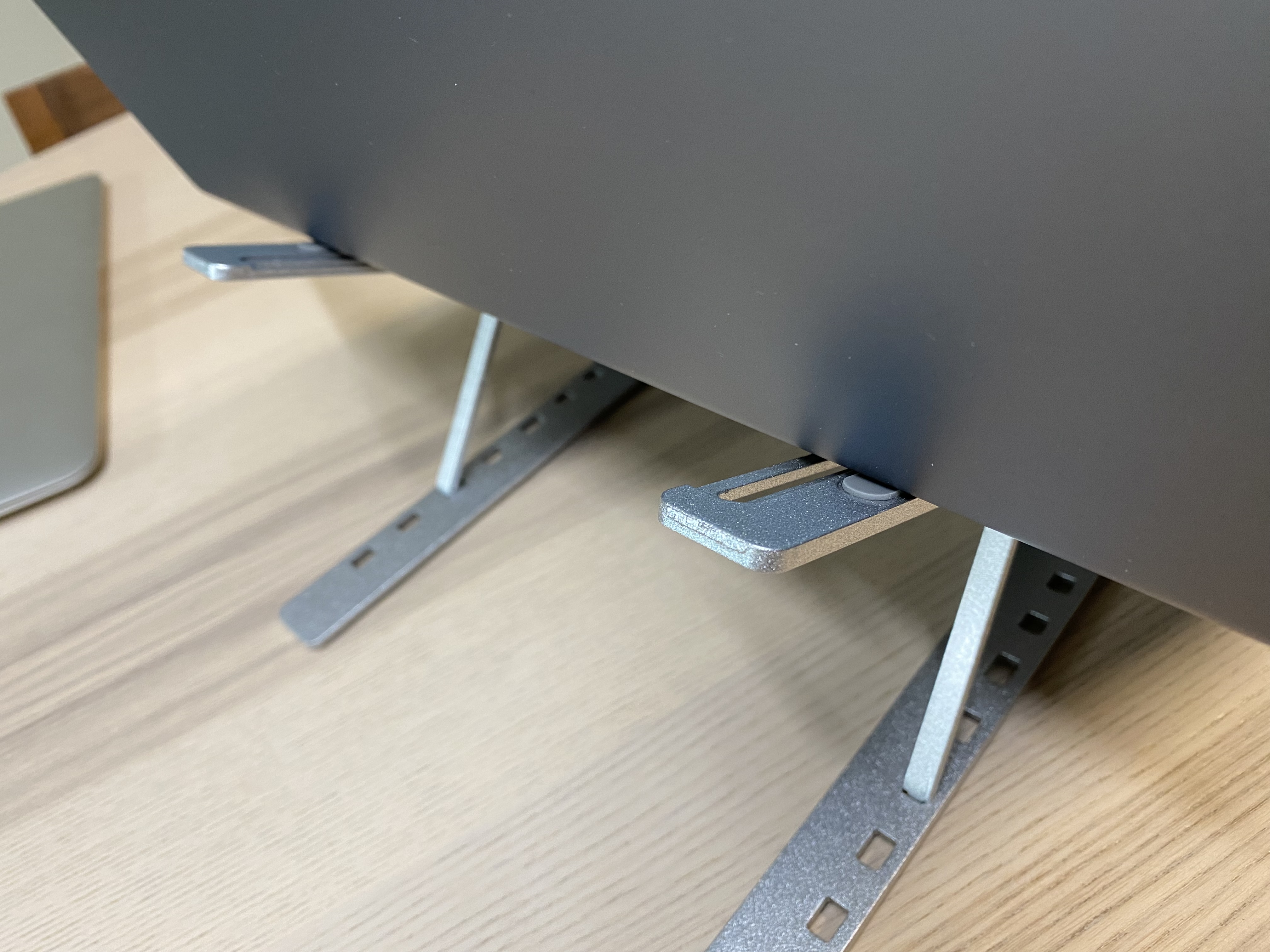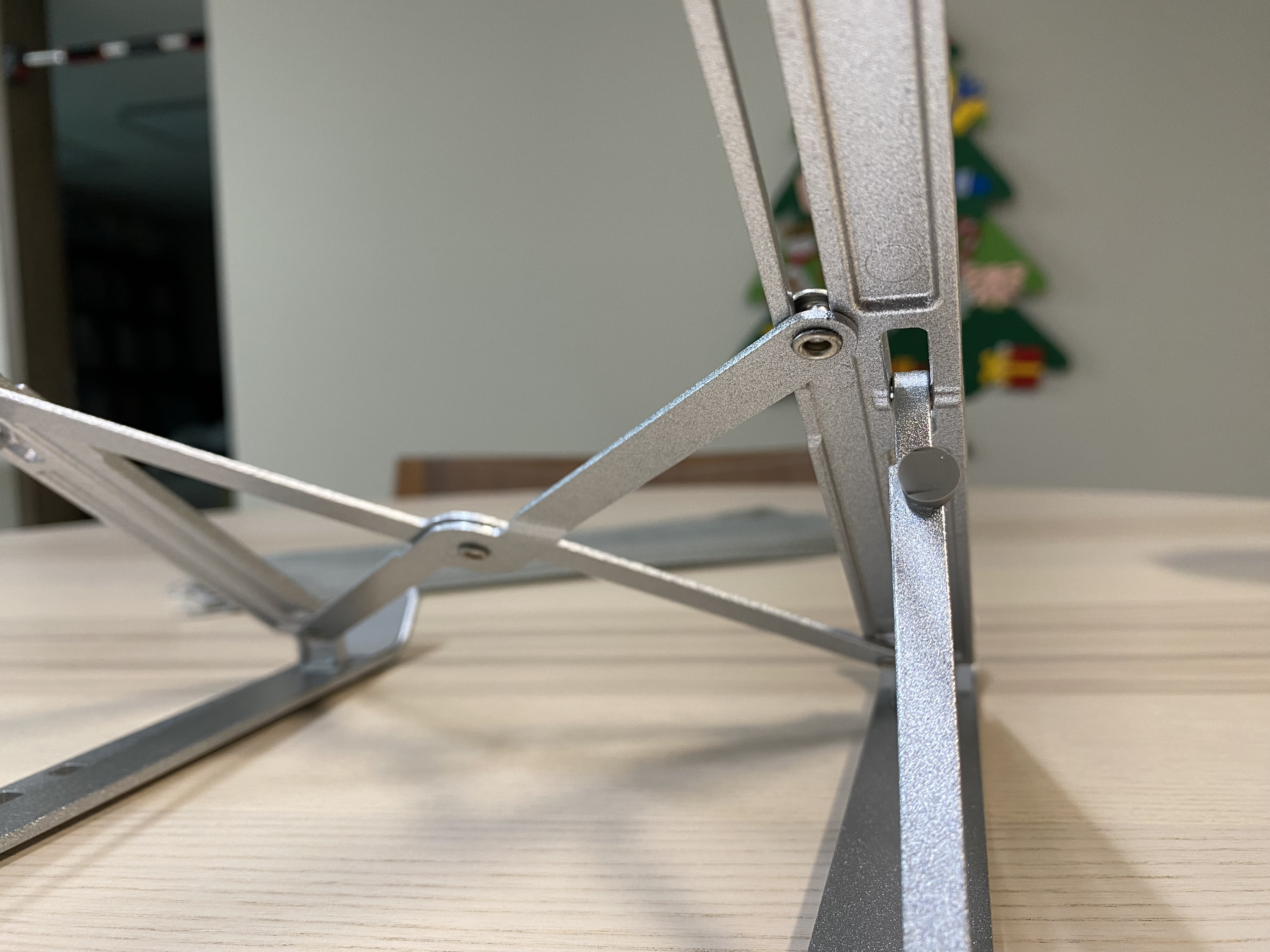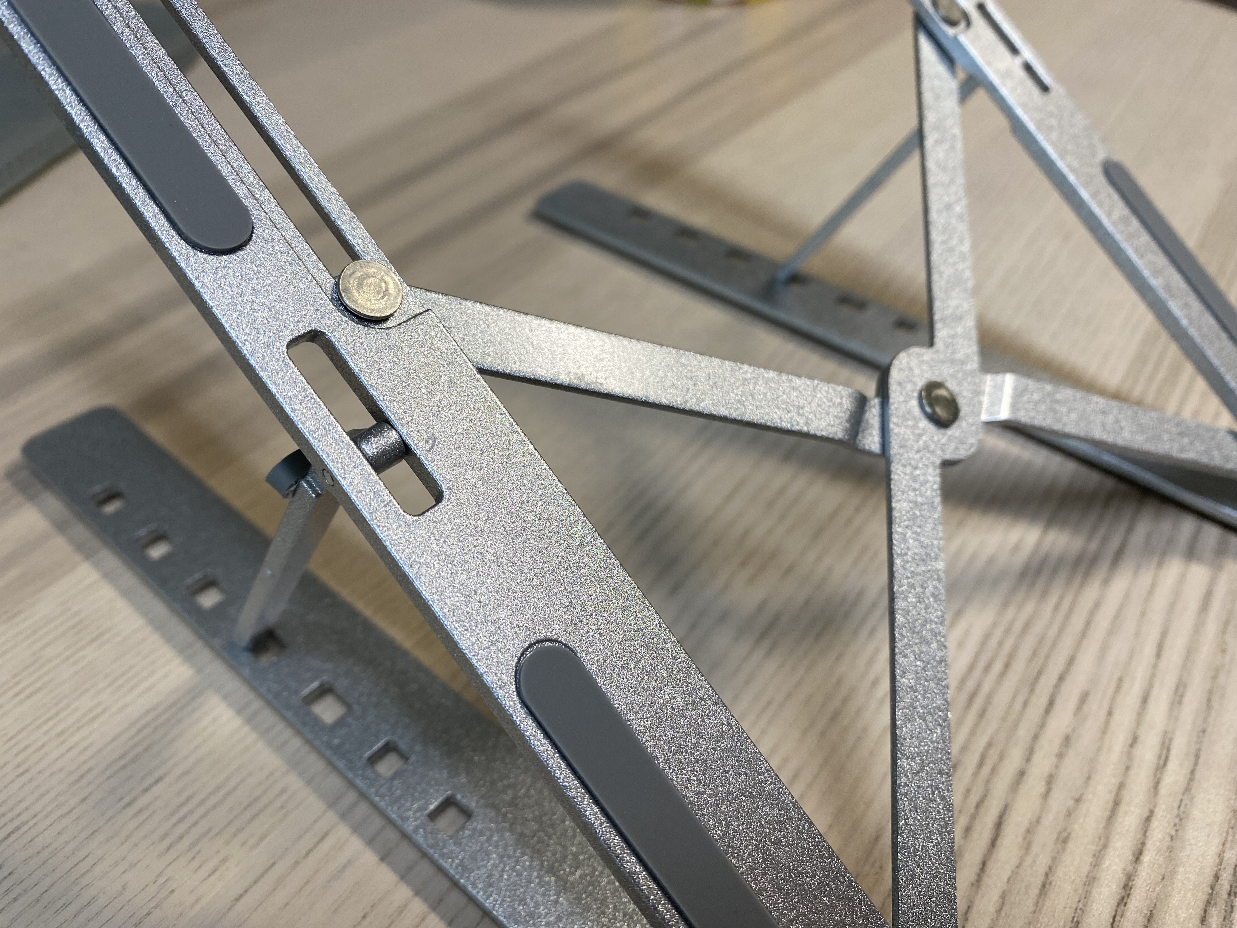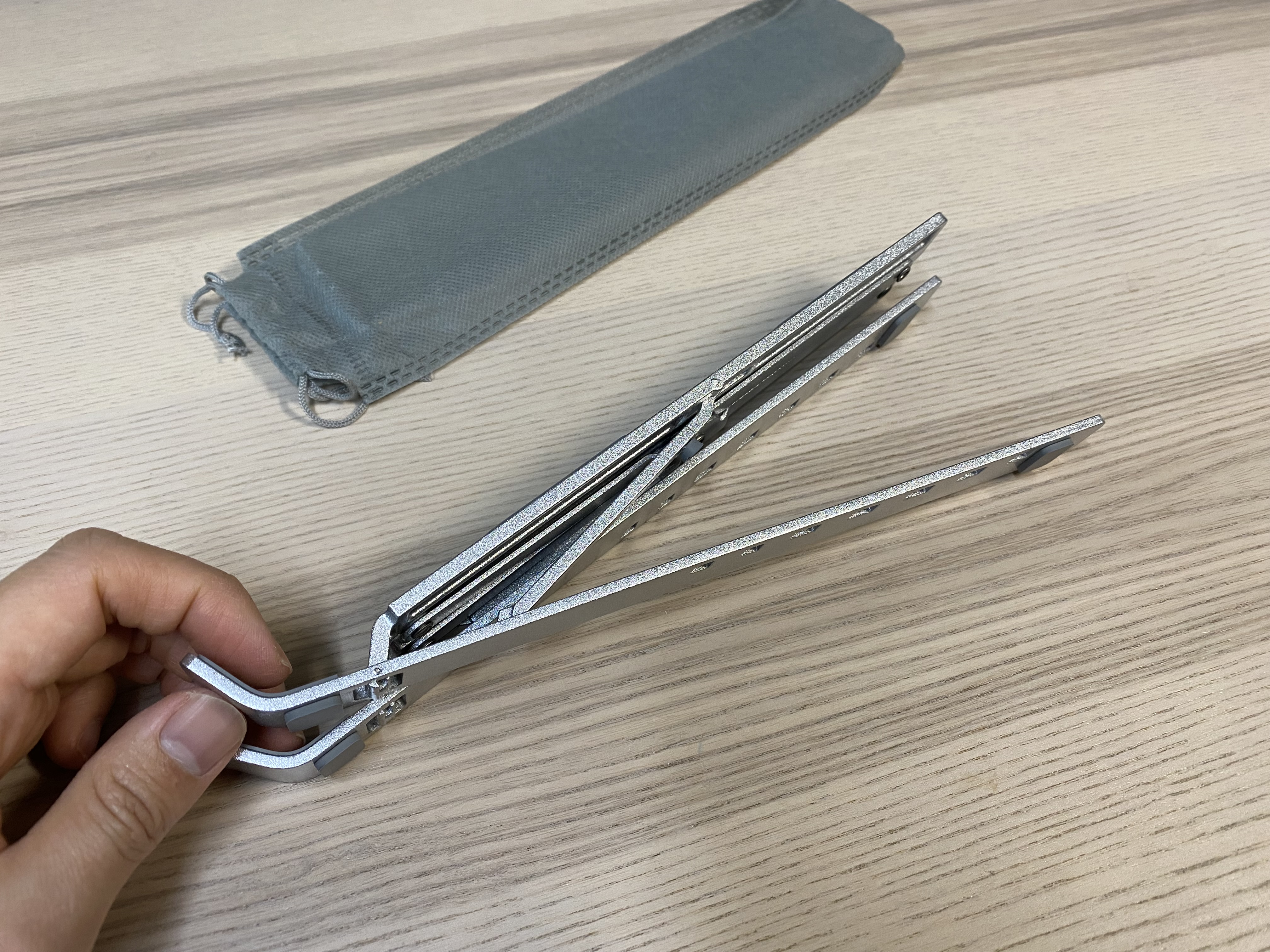 알리 휴대용 알루미늄 노트북 스탠드의 모습입니다. 휴대용이라 접었다 폈다 할 수 있습니다. 아무리 휴대용이라고는 하지만 금속으로 된 제품이라 약간의 무게는 있습니다. 다만 금속치고는 가볍다 생각합니다.