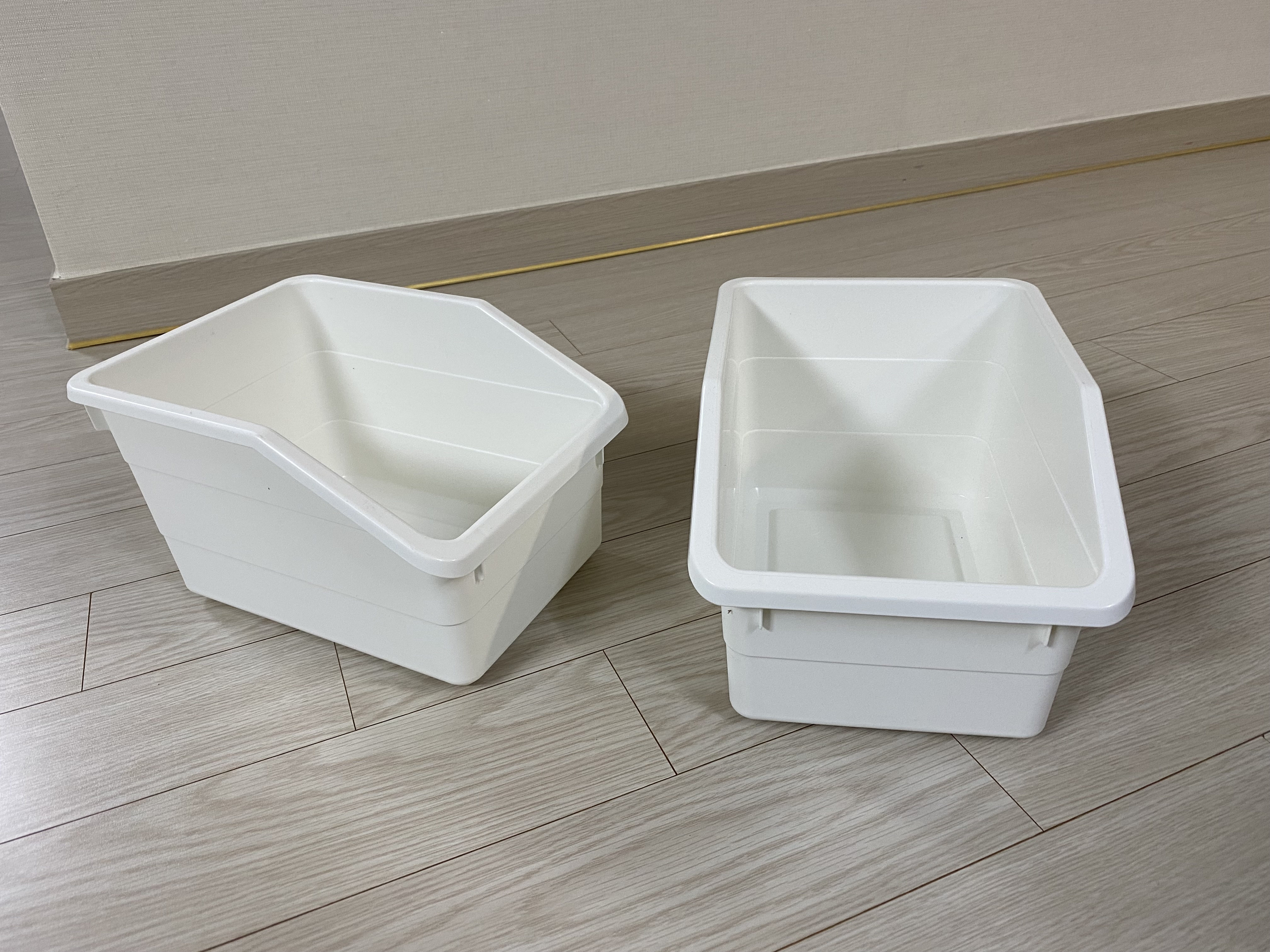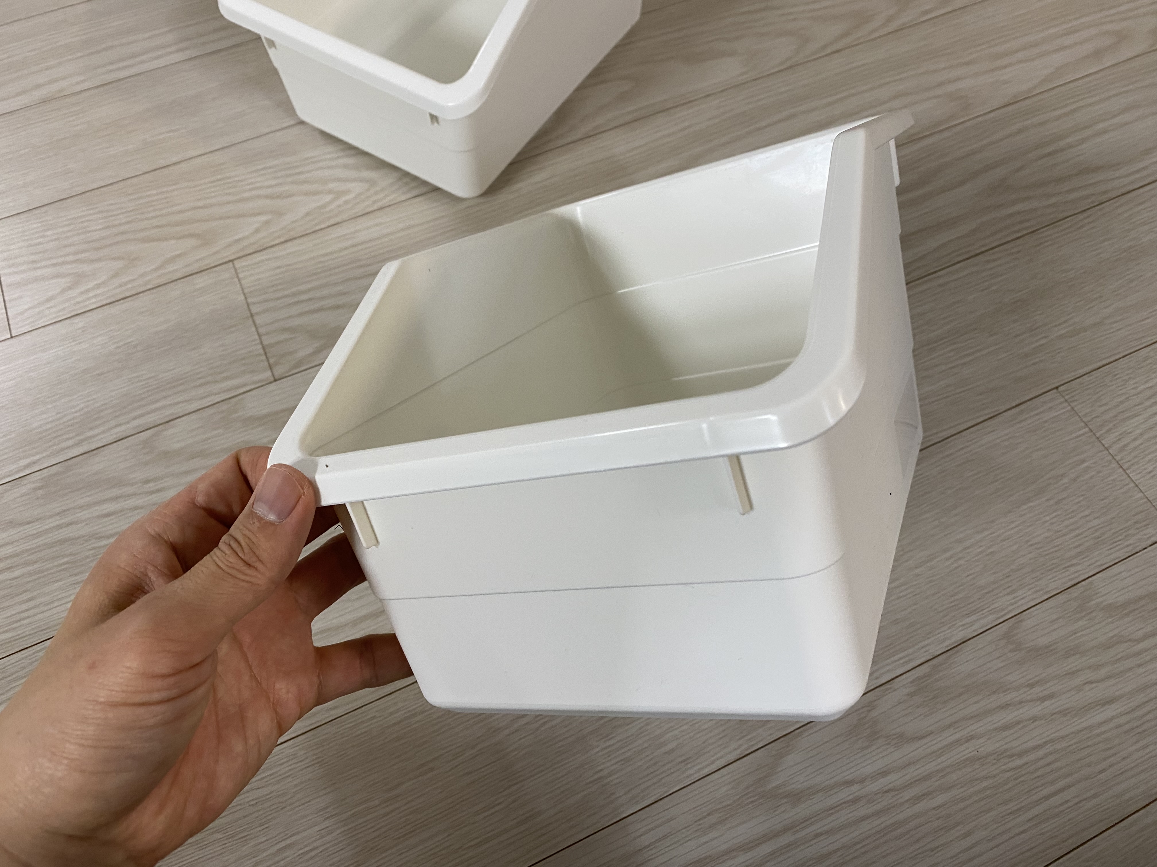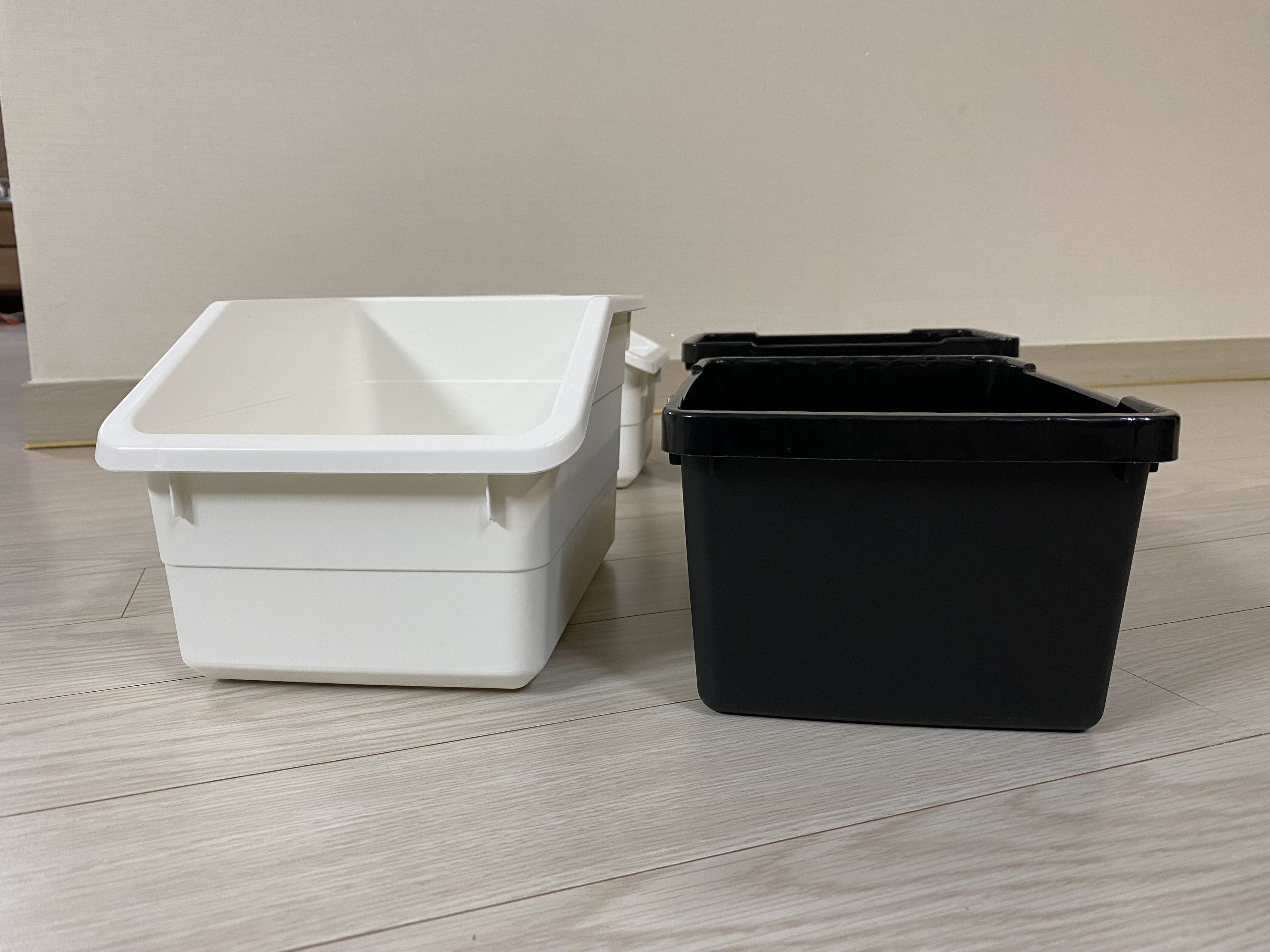 다른 이케아 제품인 웁스노프사드 수납상자(1000원)와 비교 사진입니다. 소케르비트 수납함 가격이 2배 가까이 비싸서 그런지 퀄리티, 튼튼함 면에서 웁스노프사드 수납상자보다 낫습니다. 근데 웁스노프사드는 위로 쌓을 수 있는 구조라 나름 장점도 있습니다. 창고에는 웁스노프사드가 더 어울릴 것 같습니다.