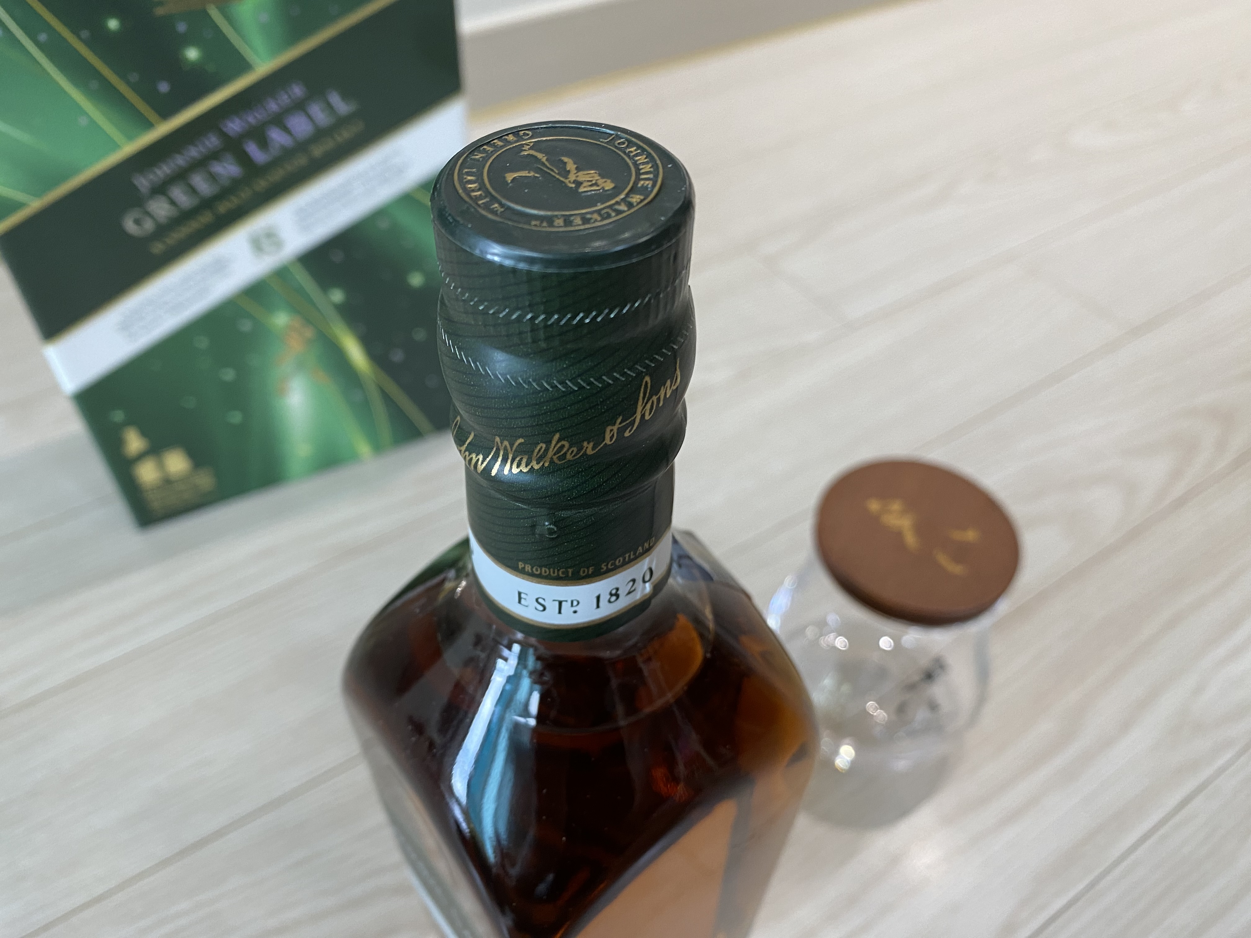 조니워커 그린 1병, 전용 유리잔, 뚜껑이 들어있습니다.