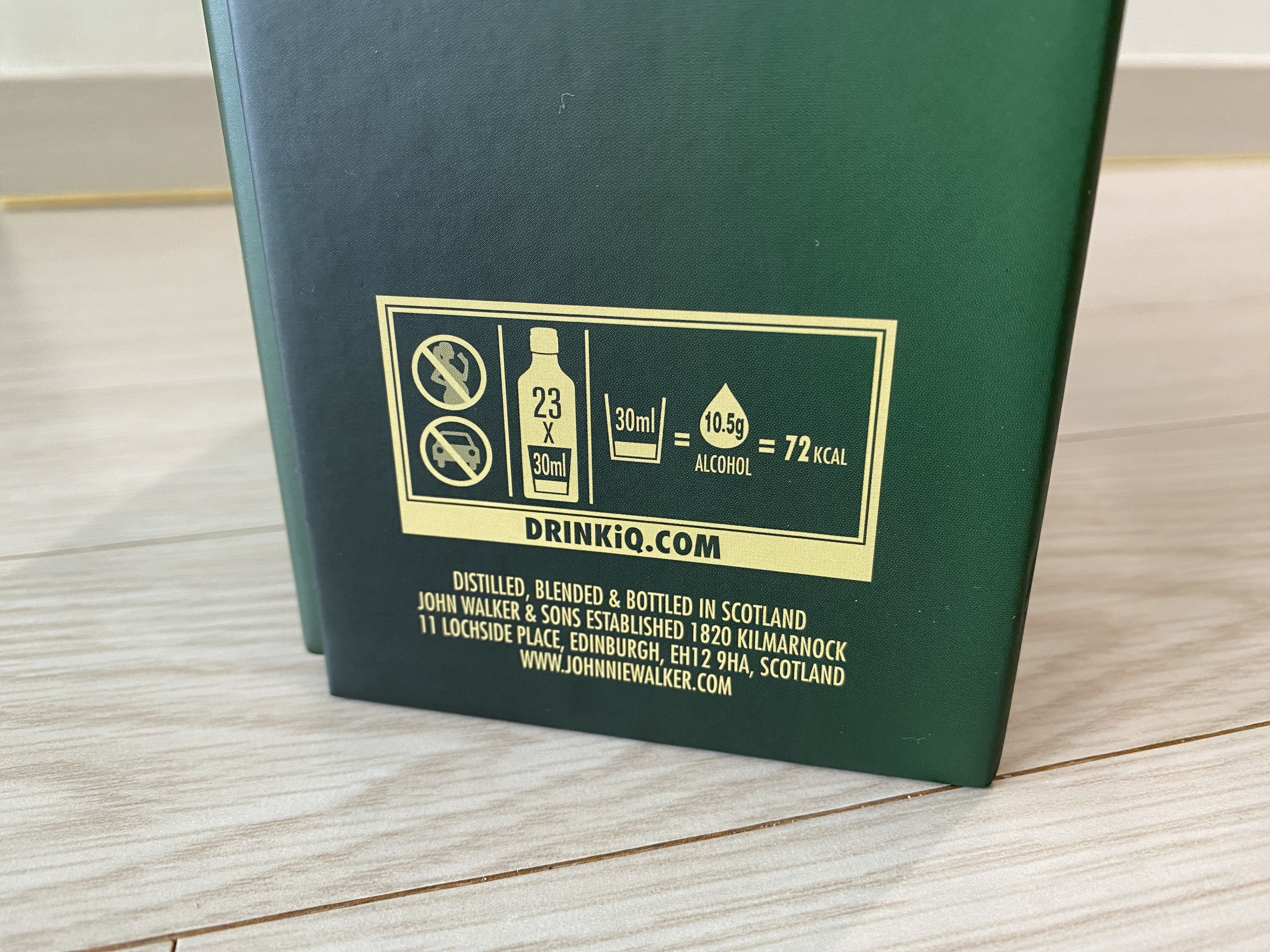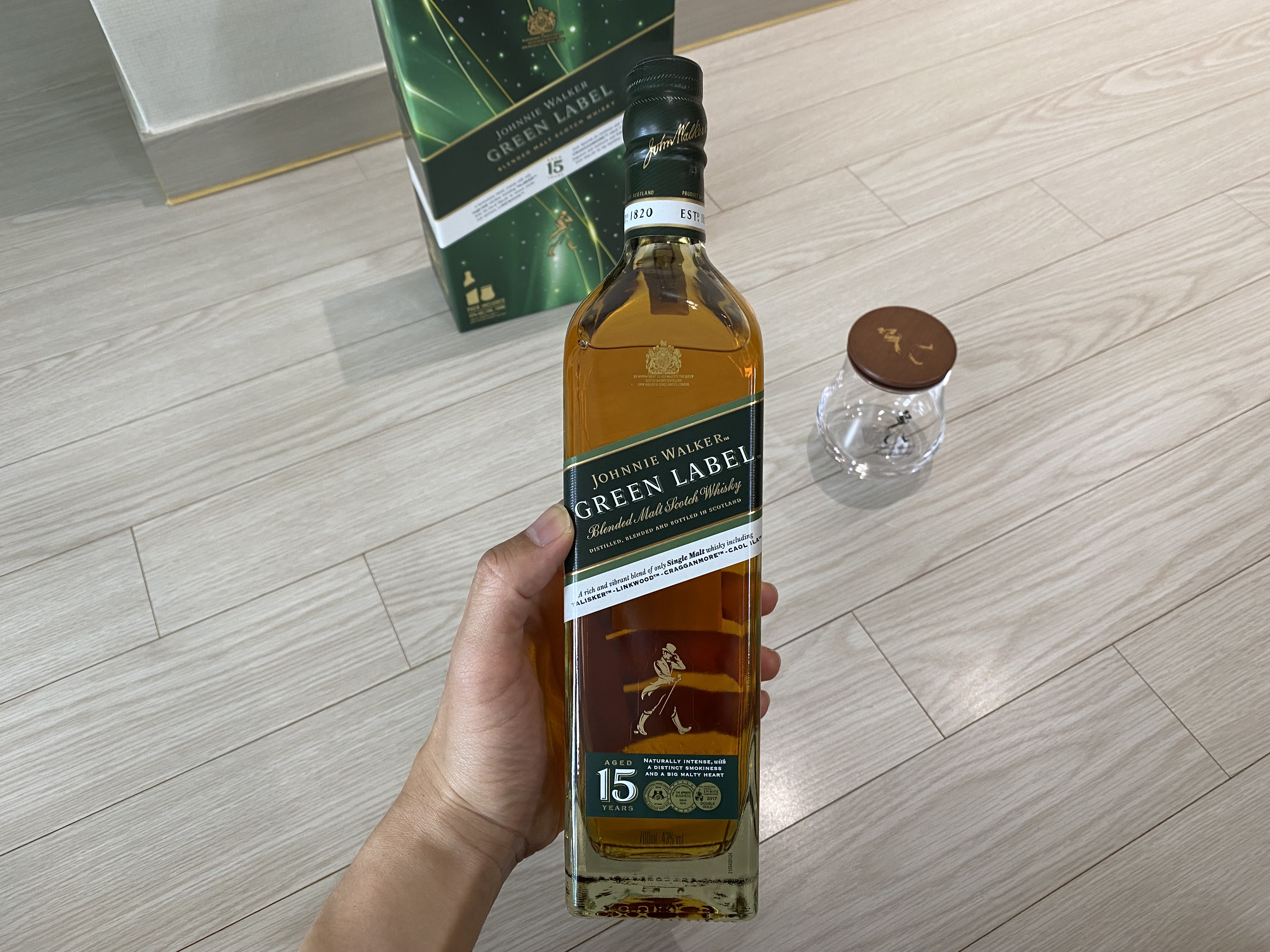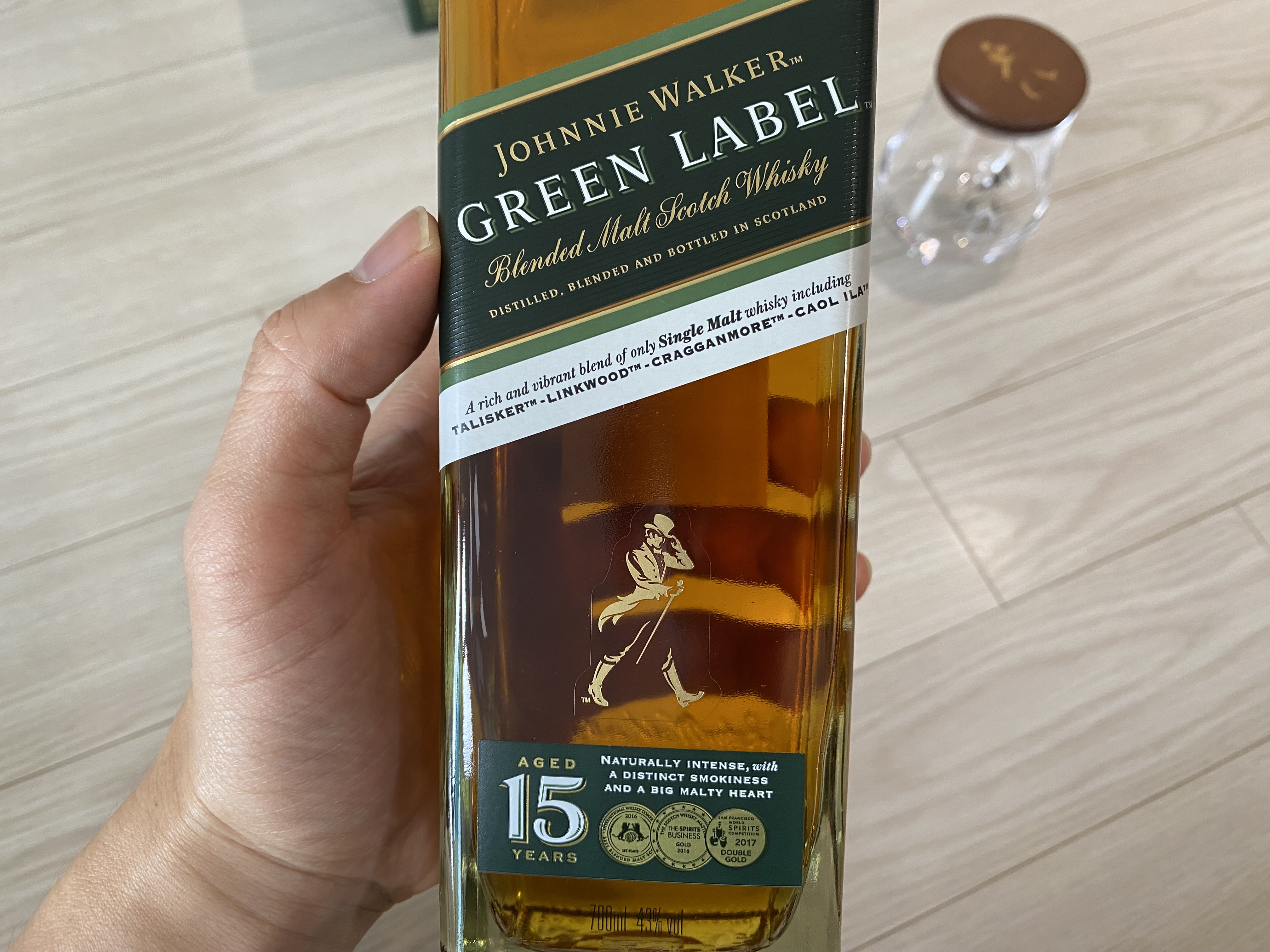이게 바로 조니워커 그린라벨. 사실 조니워커 그린라벨은 자주 팔리는 제품은 아닙니다. 보통 JOHNNIE WALKER 조니워커 등급을 따지자면 레드, 블랙, 골드, 블루 순서로 고급이고 가격이 비쌉니다. 보통 레드, 블랙을 자주 마시고 하이볼을 만들어 먹을 때도 레드, 블랙을 주로 사용한다고 보면 됩니다. 이 병에 적힌 조니워커 그린라벨의 특징을 보니 15년 숙성이며 싱글몰트 위스키로만 섞어서 만드는 거 같습니다.