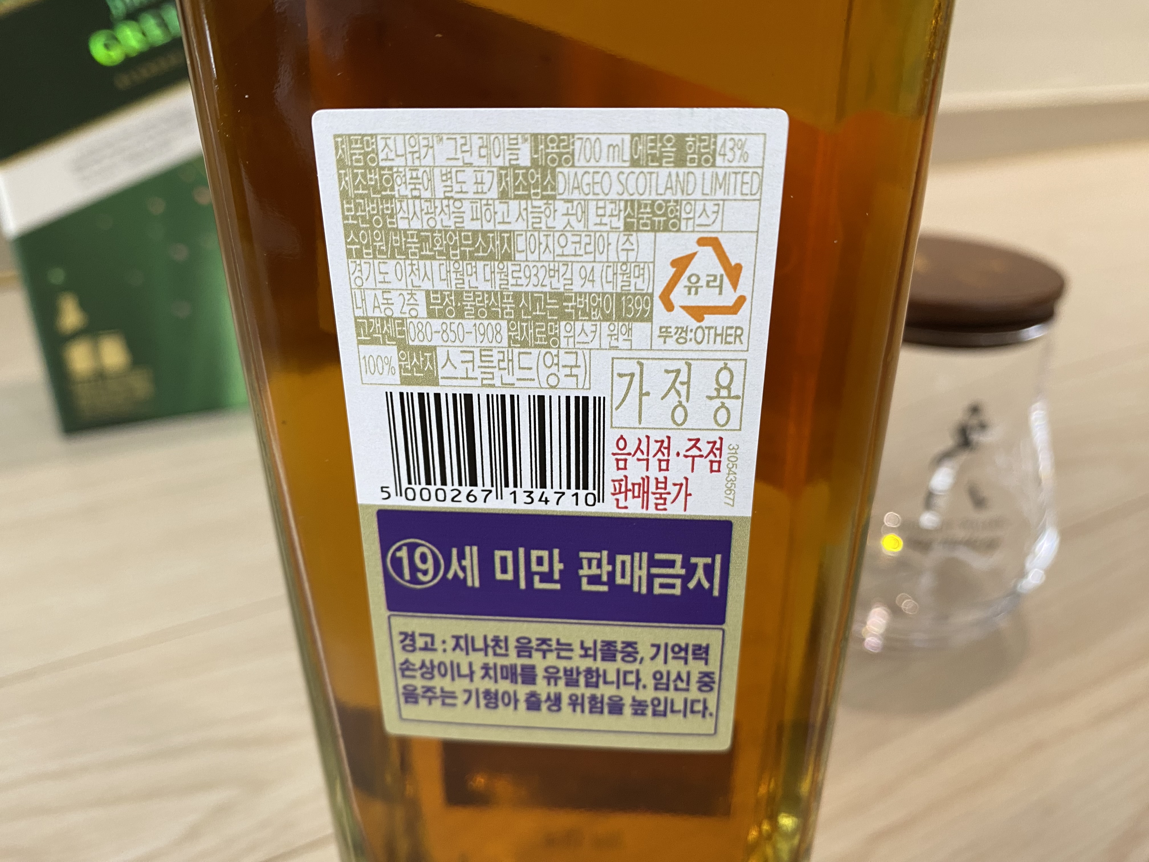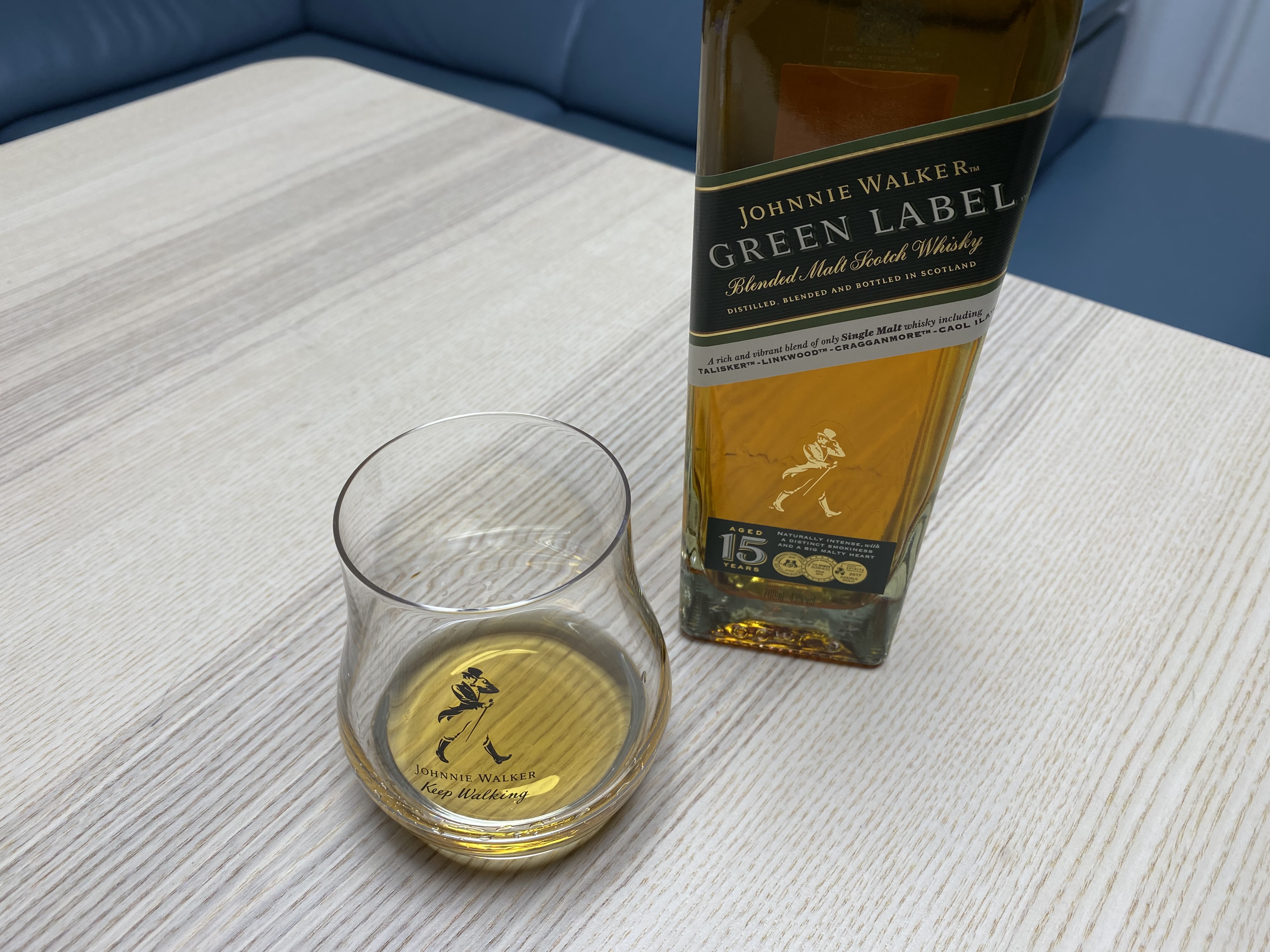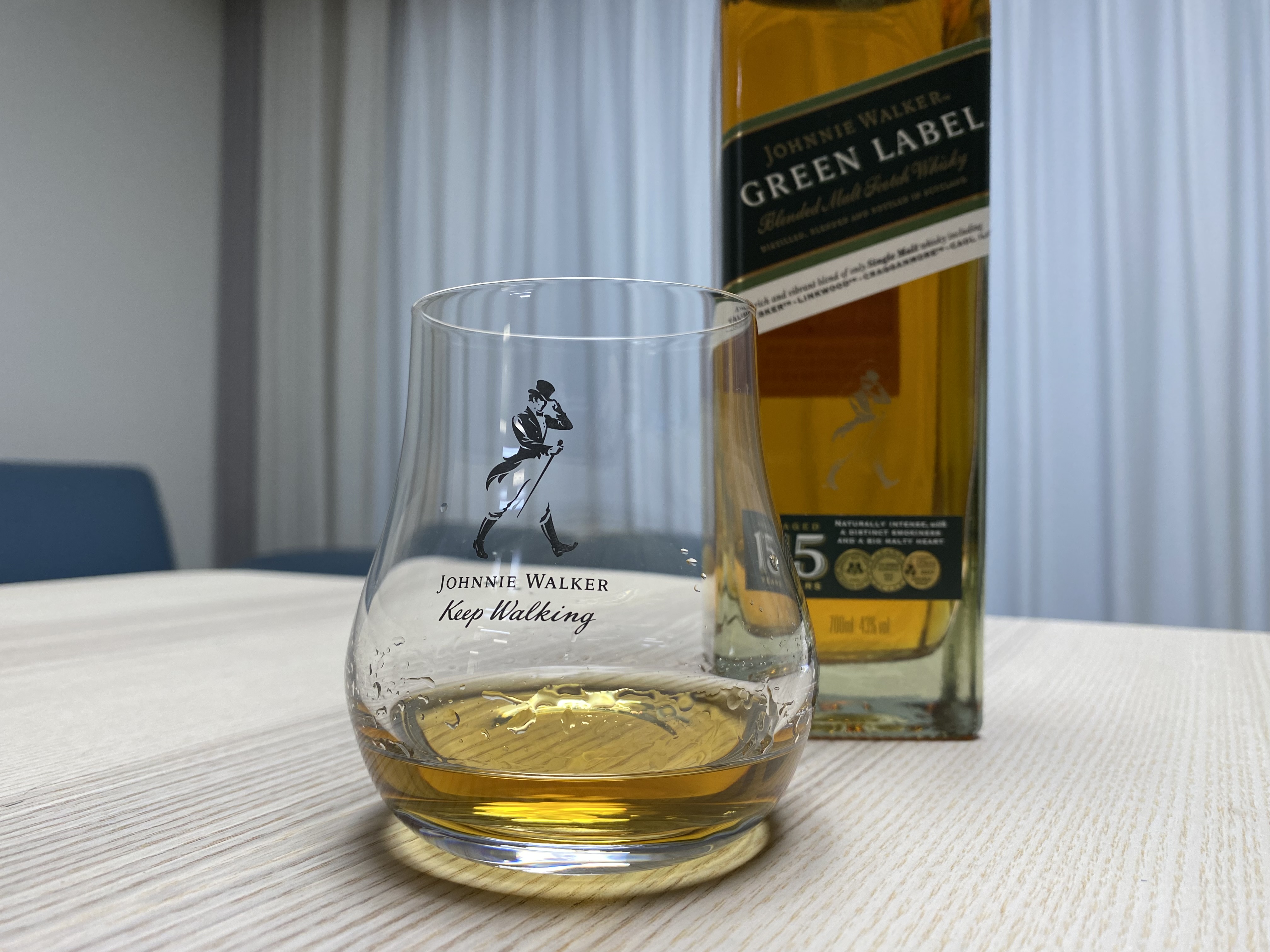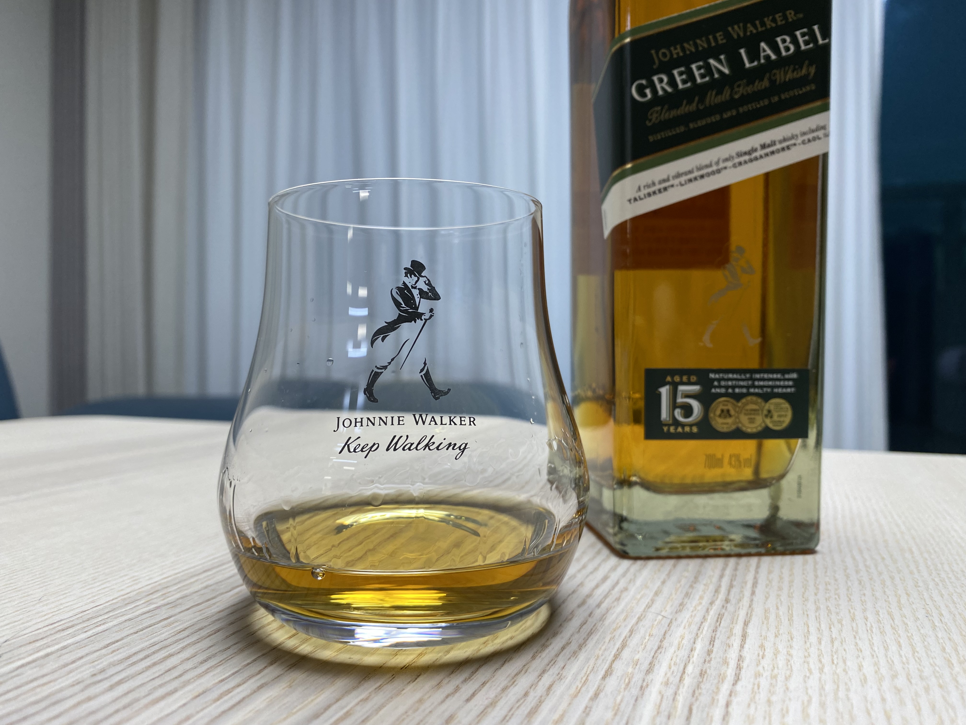 이게 바로 조니워커 그린라벨. 사실 조니워커 그린라벨은 자주 팔리는 제품은 아닙니다. 보통 JOHNNIE WALKER 조니워커 등급을 따지자면 레드, 블랙, 골드, 블루 순서로 고급이고 가격이 비쌉니다. 보통 레드, 블랙을 자주 마시고 하이볼을 만들어 먹을 때도 레드, 블랙을 주로 사용한다고 보면 됩니다. 이 병에 적힌 조니워커 그린라벨의 특징을 보니 15년 숙성이며 싱글몰트 위스키로만 섞어서 만드는 거 같습니다.