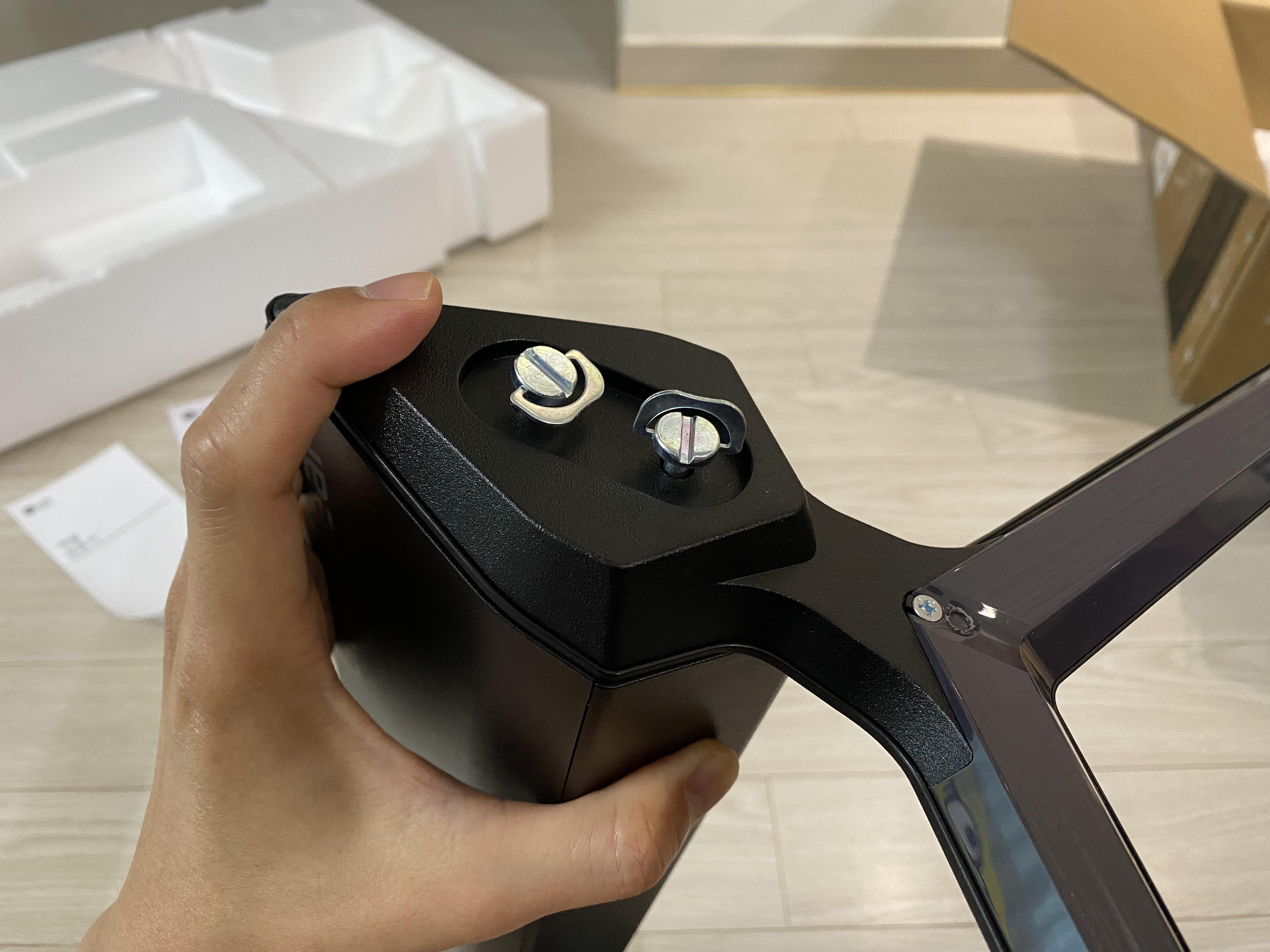 잡아보면 묵직한 모니터 스탠드. 아래쪽은 조여주면 바닥과 목이 고정됩니다.
