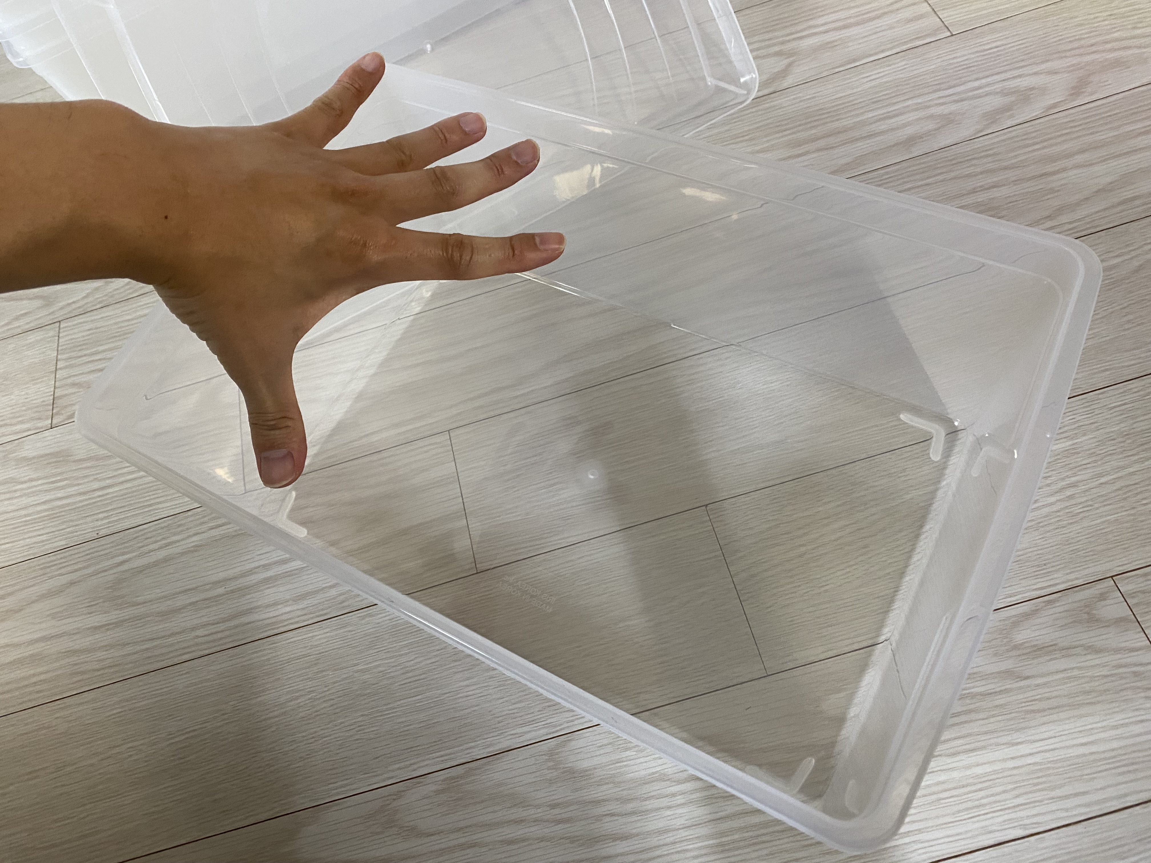 바닥은 이렇게 생겼습니다. 아이리스 보관함을 차곡차곡 쌓을 수 있는 구조입니다. 안에 너무 무거운 물건을 넣으면 아래 박스 또는 뚜껑이 휘어질 수 있으니 참고하세요.