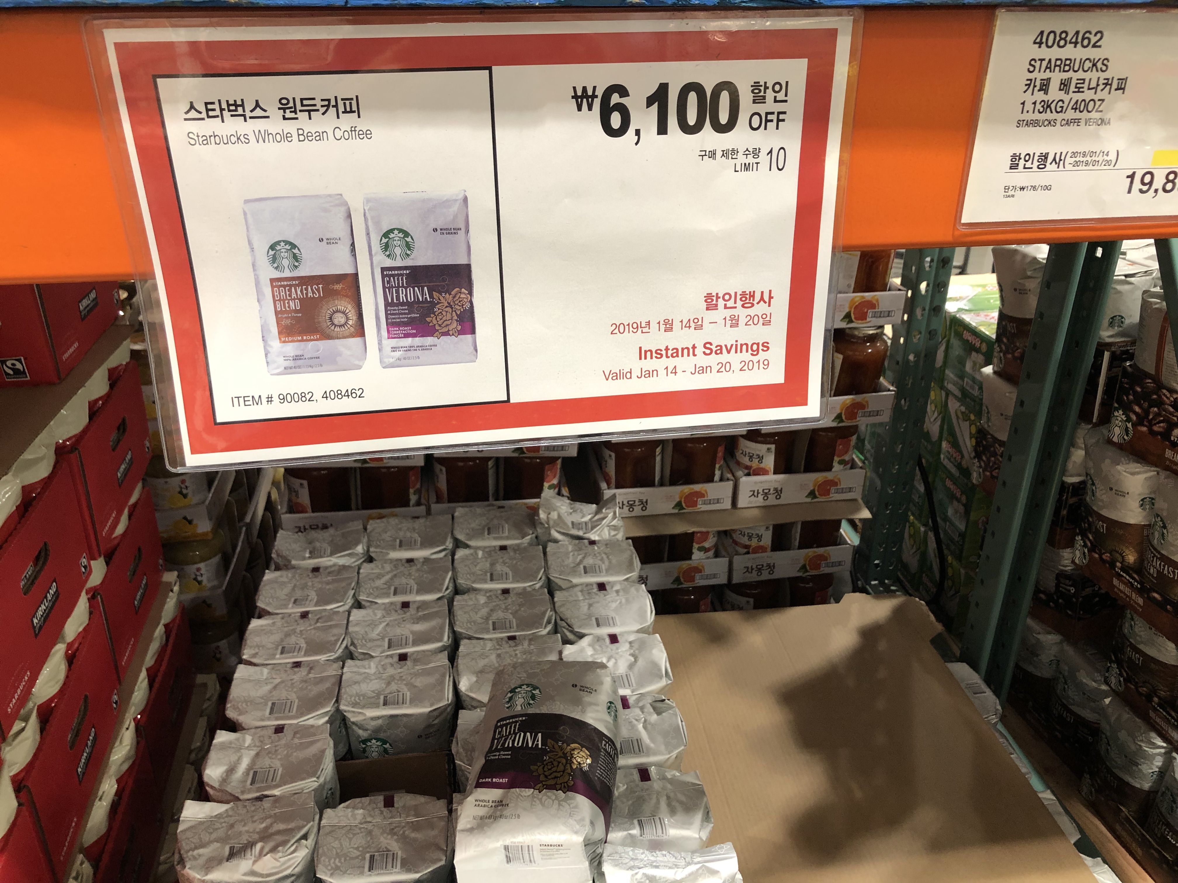 코스트코에서는 가끔 스타벅스 원두를 할인합니다. 가장 자주 할인하는 제품이 블랙퍼스트와 카페 베로나 원두입니다. 할인을 할 때 구매하면 2만원도 안하는 가격에 스타벅스 원두를 살 수 있습니다.