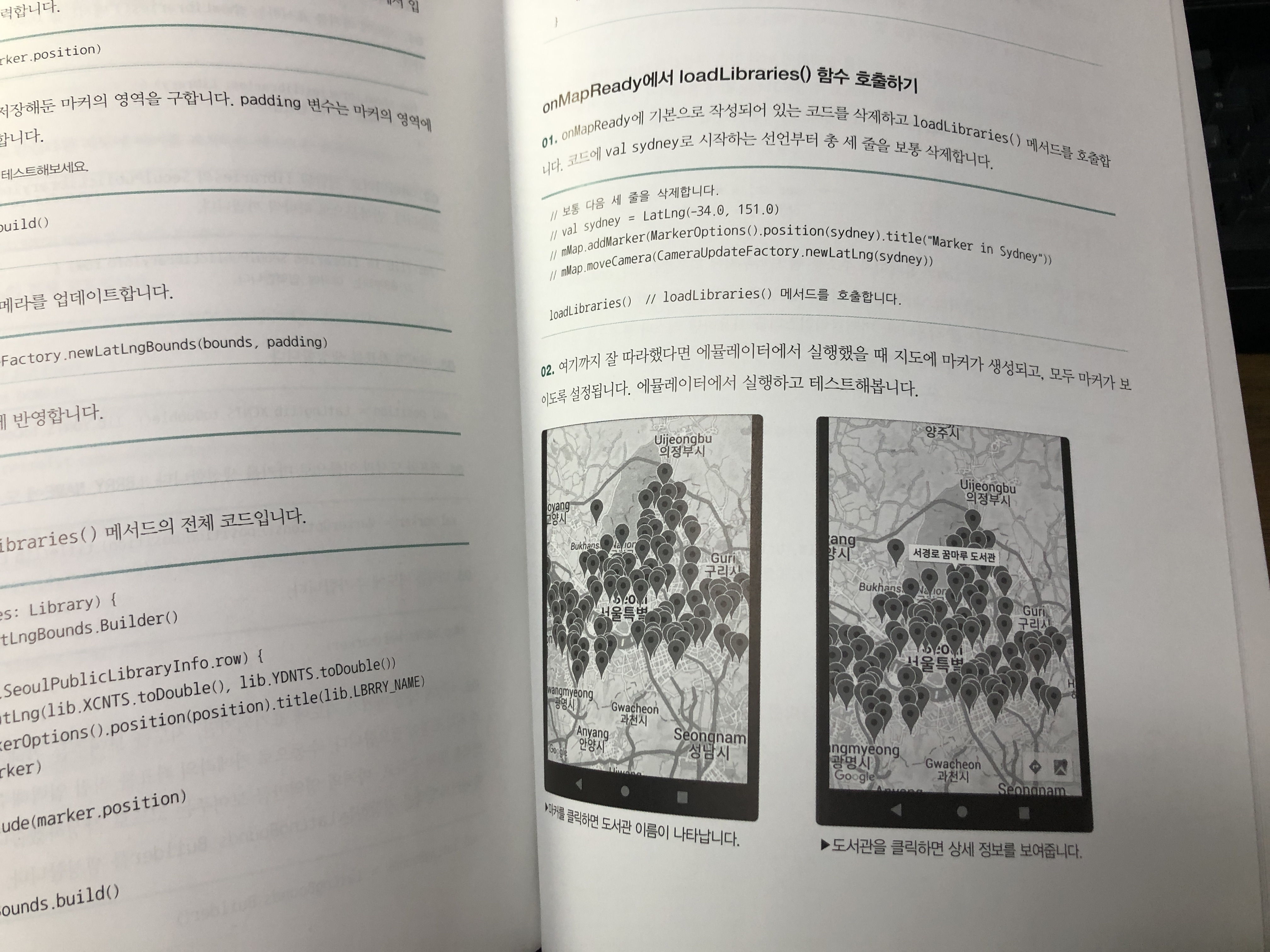 입문서라 아주 복잡한 프로젝트를 다루지는 않습니다. 그래도 구글지도와 Open API를 이용해서 간단한 공공도서관 앱을 개발하는 방법은 책에서 다루고 있습니다. 안드로이드 개발은 정말 다양한 변수가 있어서 아무리 책을 읽어도 결론은 구글링이 될 수 밖에 없습니다. 책은 초보적인 시행착오를 줄이고 핵심만 짚고 넘어간다는 마음으로 보는 것이 좋겠습니다.