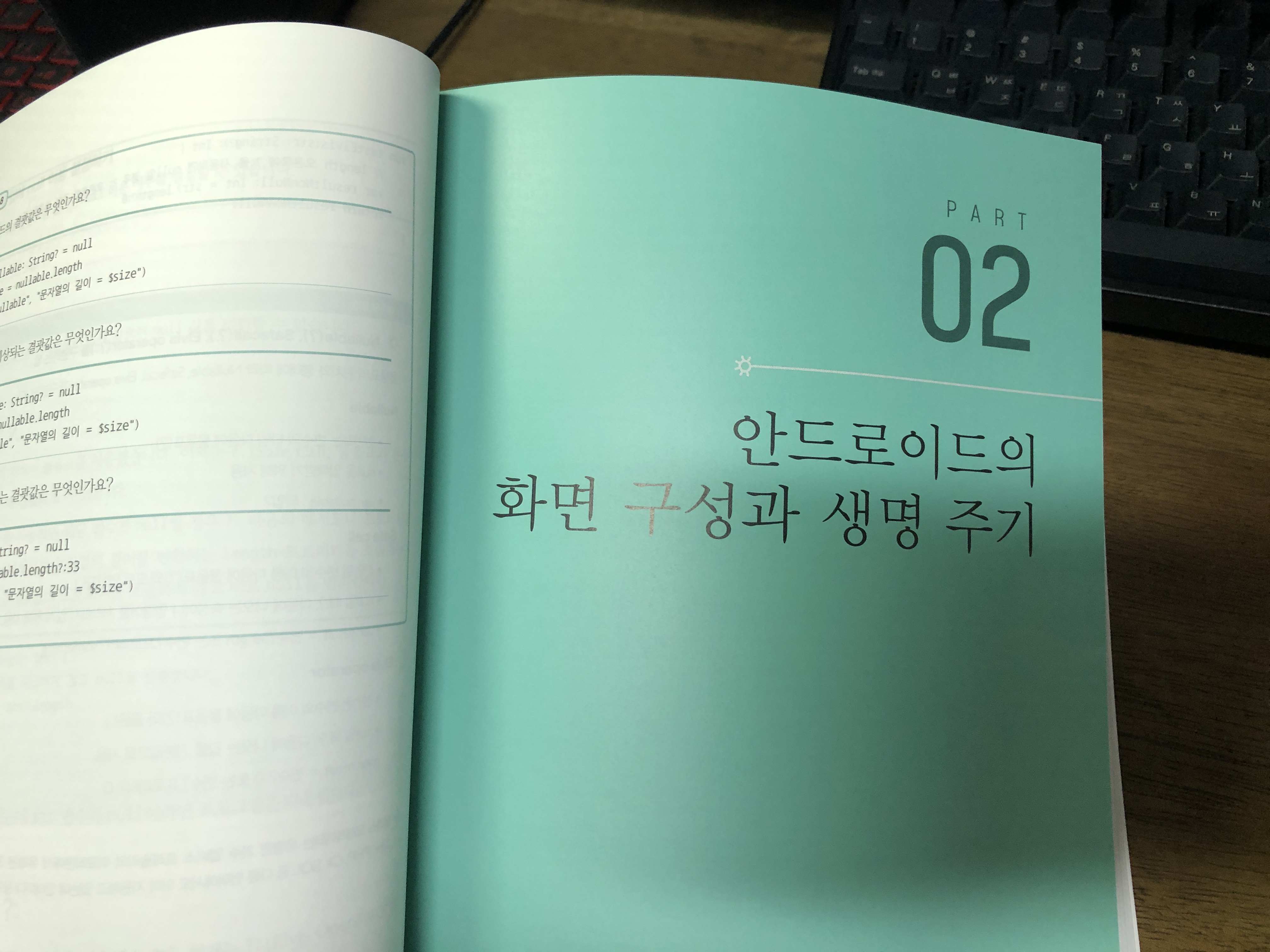 코틀린이 뭔지 배우고 나서 파트2부터 본격적으로 안드로이드 개발을 배웁니다. 생명주기, 액티비티 등 꼭 필요한 내용을 설명하는데 안드로이드 프로그래밍에서 정말 중요한 부분이니 완벽하게 이해하고 넘어가는 것이 좋습니다.