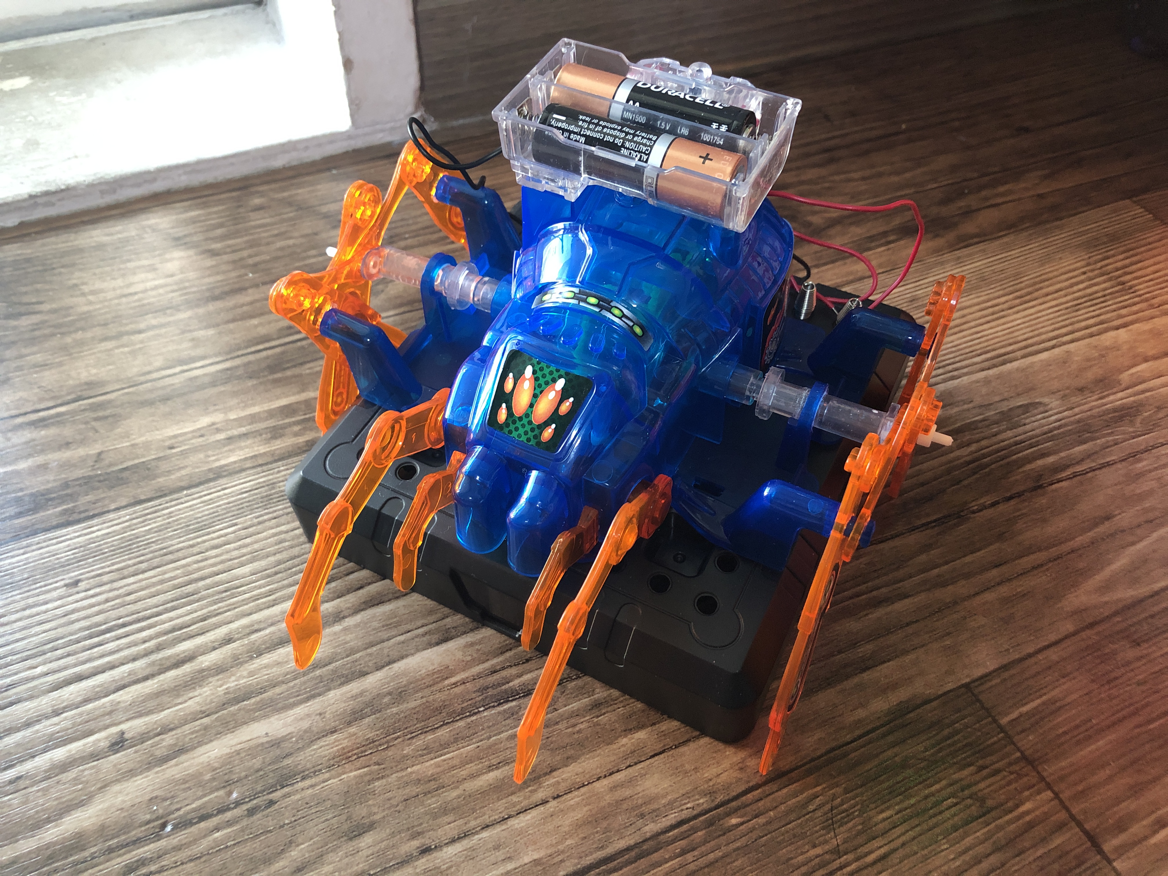 CONNEX STEM 거미 로봇 장난감. 아주 우아하게 움직이는 장난감은 아닙니다. 그래도 뒤뚱뒤뚱 움직이는걸 보면서 아이들이 많이 좋아하네요. 가성비는 괜찮습니다만, 아이들이 험하게 사용해서 그런지 거미 다리가 잘 빠지고 잃어버리는 경우가 허다합니다. 몇번은 찾아서 다시 조립을 해줬는데 이제는 다리가 어디에 있는지 몰라 몸통만 굴러다니네요. 전원 연결 부분에 LED나 모터를 연결하는 등 다양한 시도를 하면서 노는 것도 가능합니다.